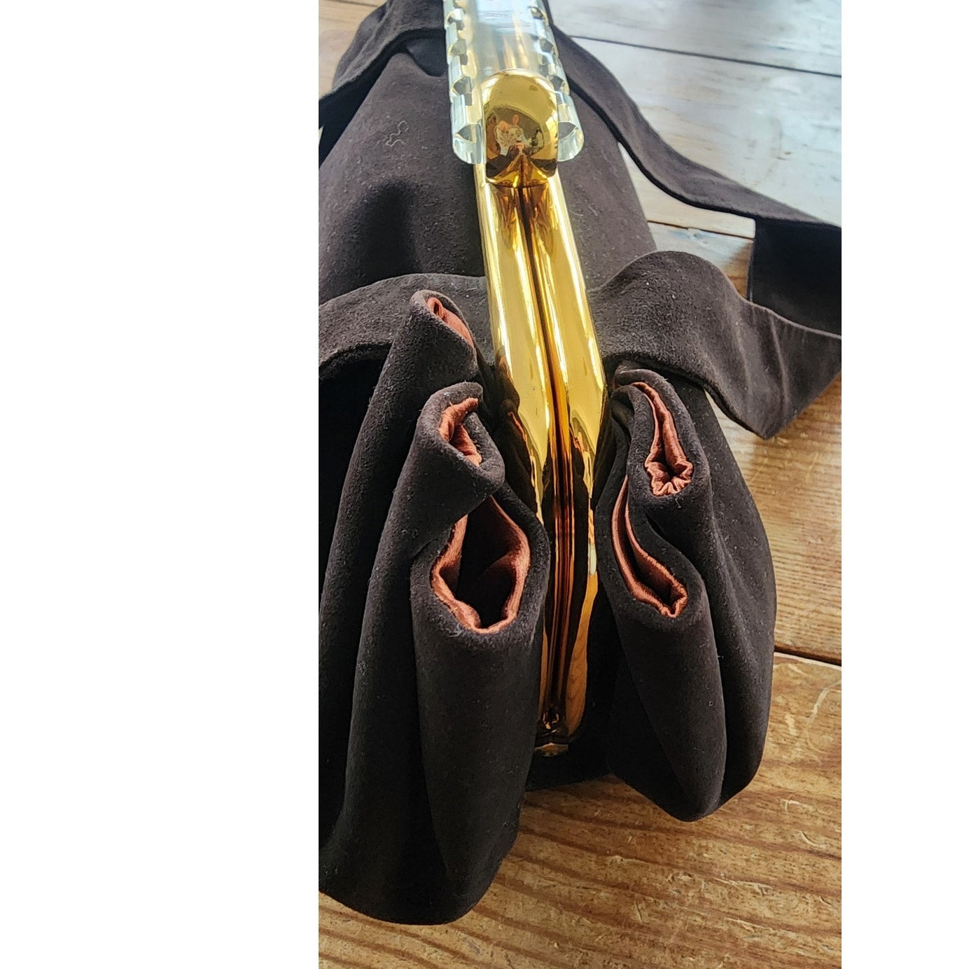 Soft bodied, oblong bag in soft, brushed, brown suede with matching handstraps, it opens on a gold toned hinged frame and features a gorgeous, chunky, art deco style clasp panel at the top in the form of clear lucite with crenellated edge and two large gold balls on each side. Interior reveals three sections in brown silk, with the center one closing with a kiss clasp.