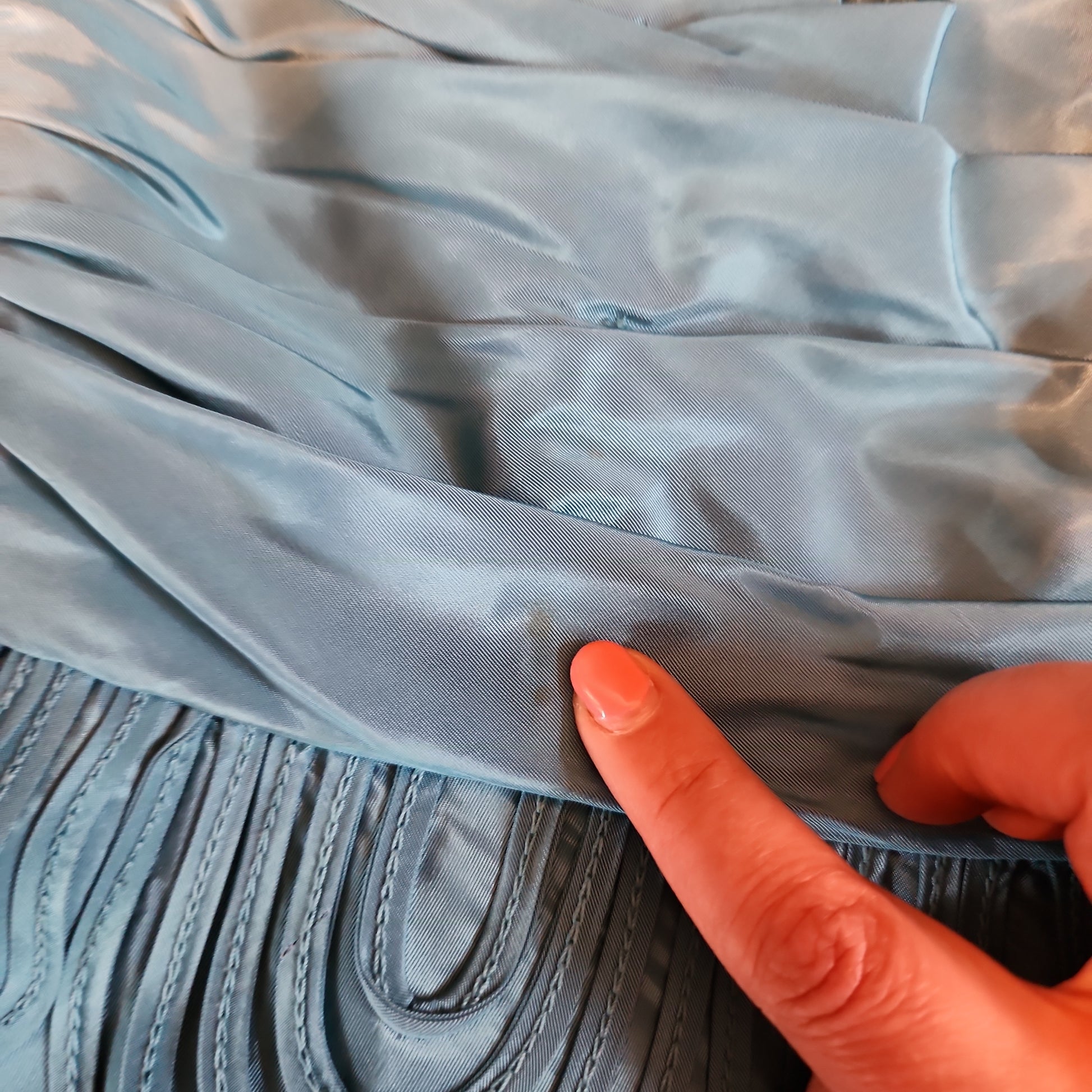 Condition: very good with no issues other than a VERY faint, light green, tiny spot at the pleated waist section at front and another very faint spot on the top section of the waist pleating just under the left chest. You have to hunt for these in direct light, garment laid flat, to find them! Priced accordingly.