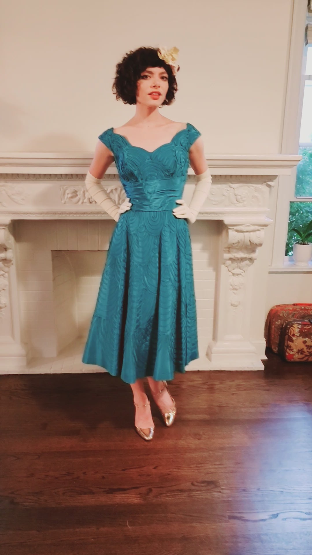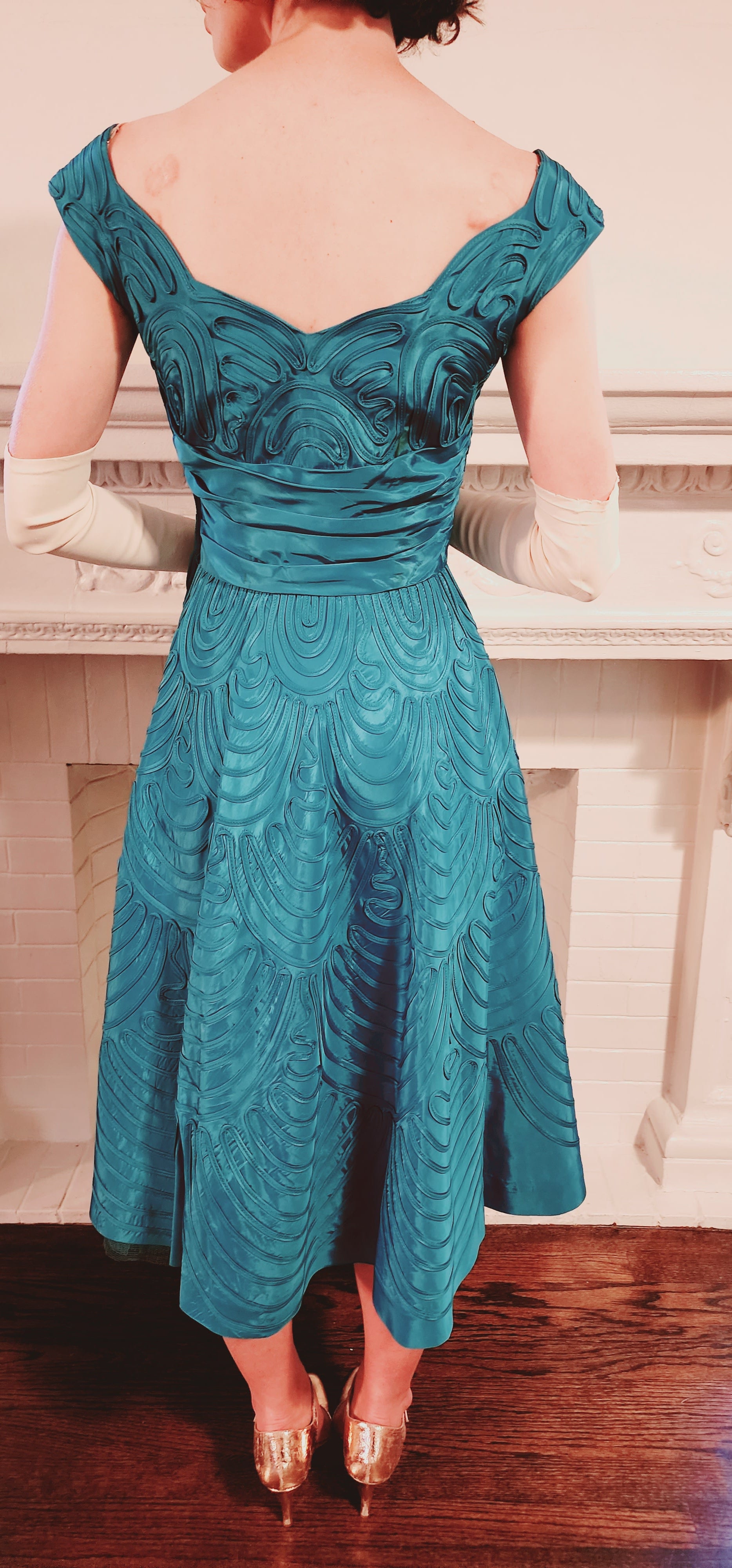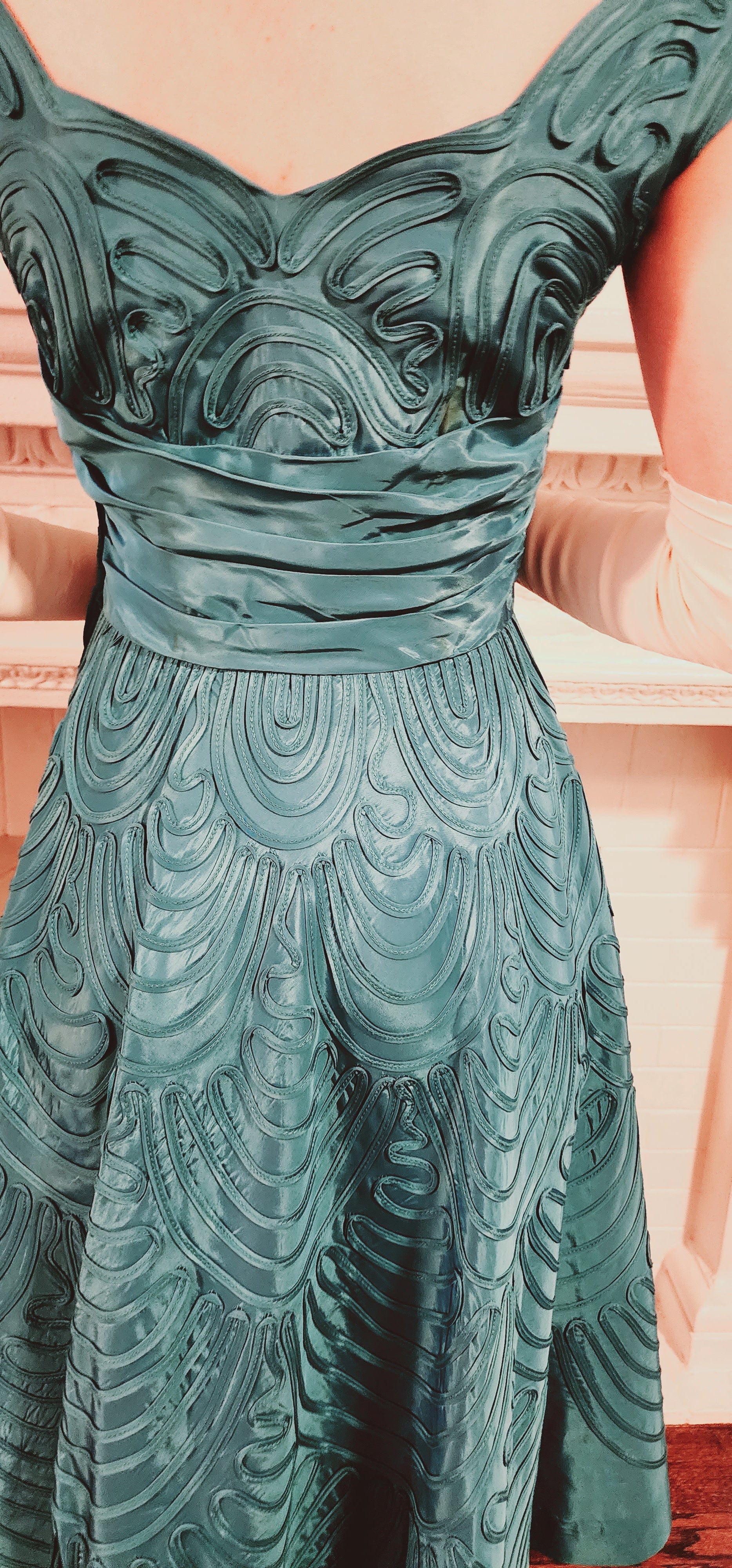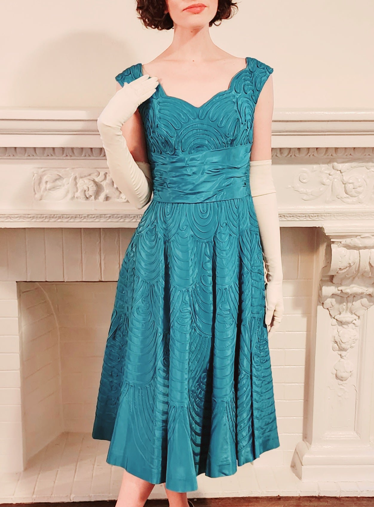 The perfect 50s party dress! Blue ribbon embroidery on satin is found throughout this sleeveless dazzler that features wide shoulder straps, a sweetheart neckline with a scallop edge, a nipped waist defined by horizontal, wide pleats and a voluminously A line skirt that as a layer of thin crinoline underneath to give it a bit of poof! Zips up the side, it is fully lined on the interior.