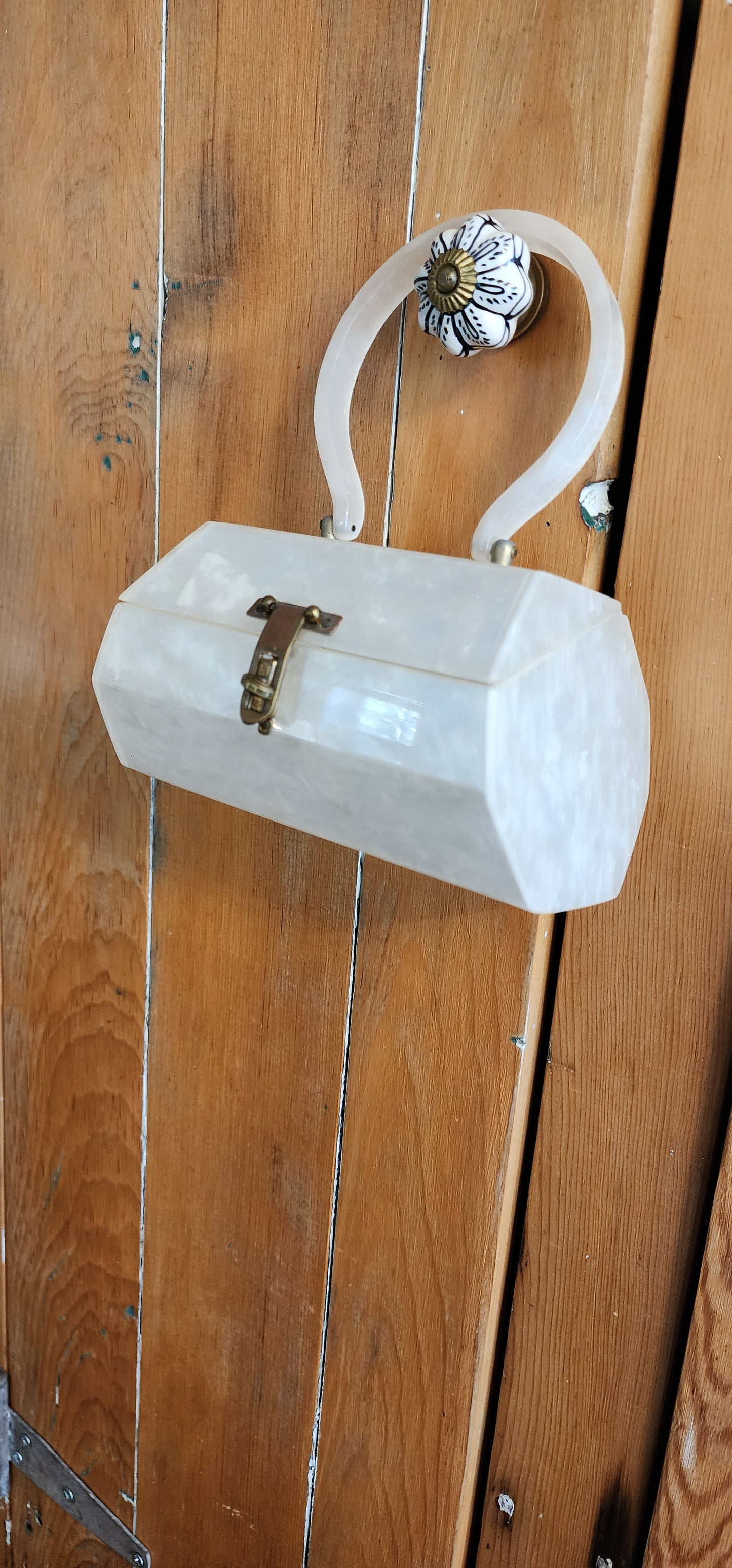 Delightful and collectible bag, this darling is a cylindrical septagon with seven sides to its barrel like shape. The top flap hinges open to reveal an unlined interior. Closes with a brass clasp. Handle is in matching white, marbled lucite