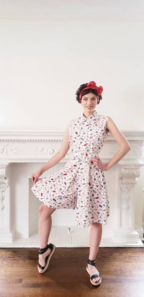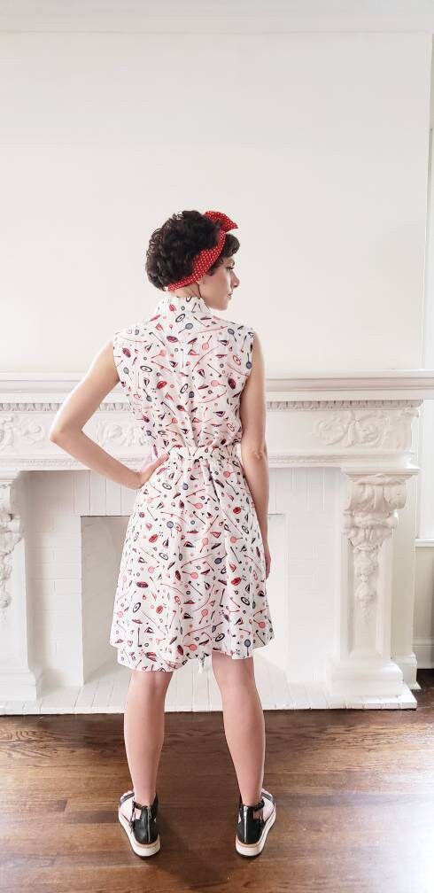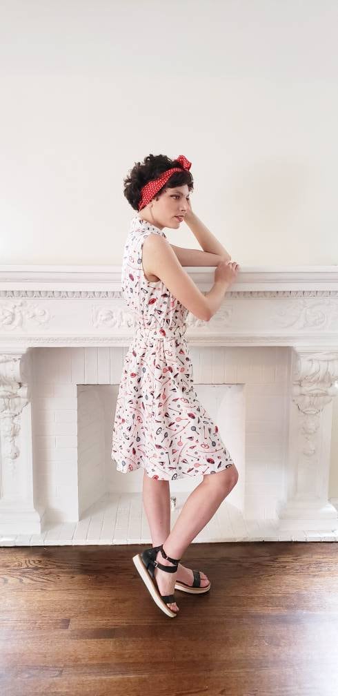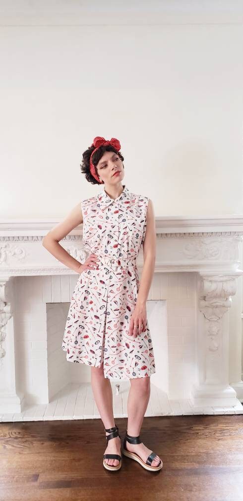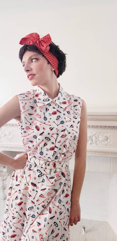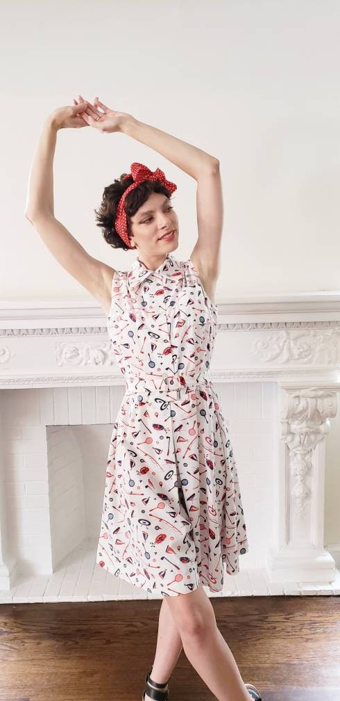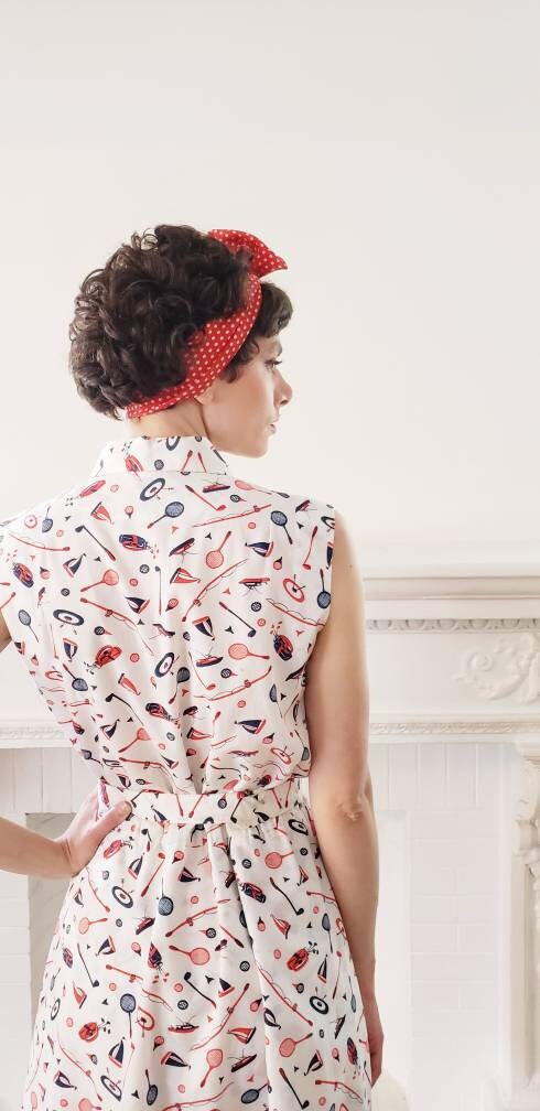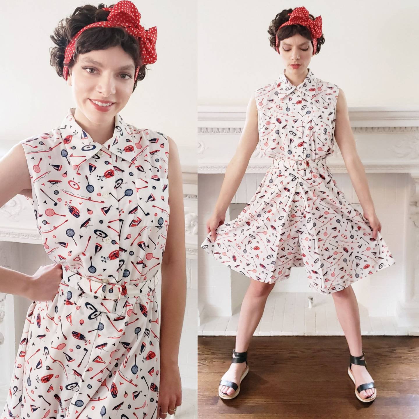 60s 70s Serbin Golfer Tennis Skort Dress Romper Red Blue Print Archery Sailing Fishing Sports Athletics Novelty Print Onesie Belted / Large