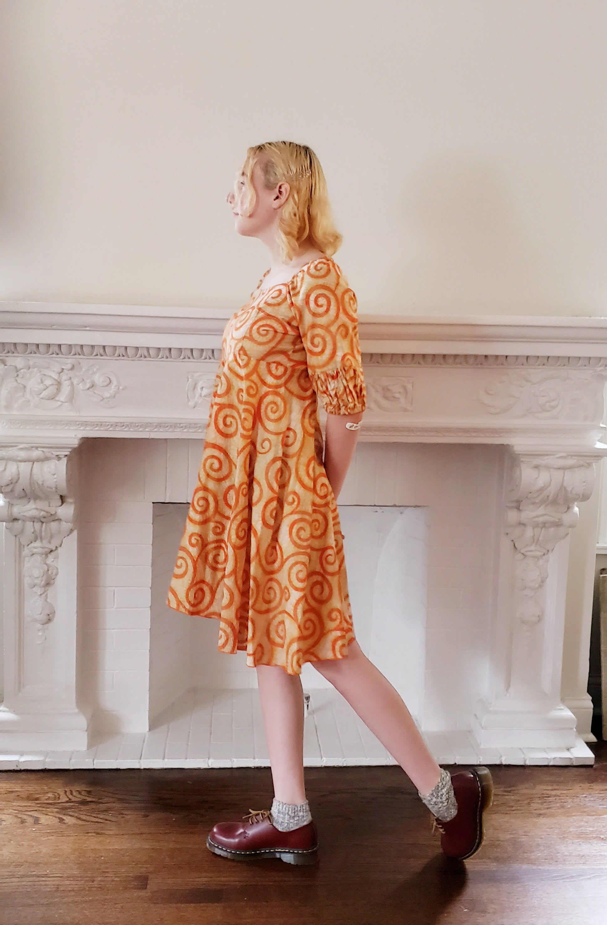 60s Cotton Print Summer Dress Orange Swirl Spiral Pattern Small