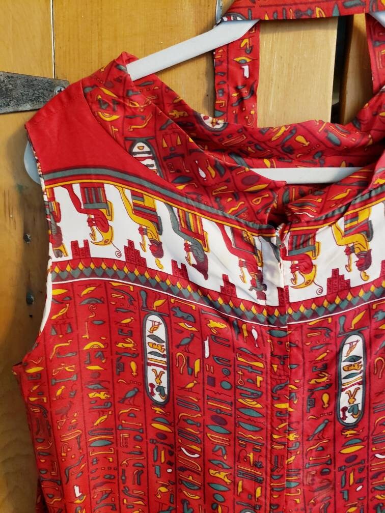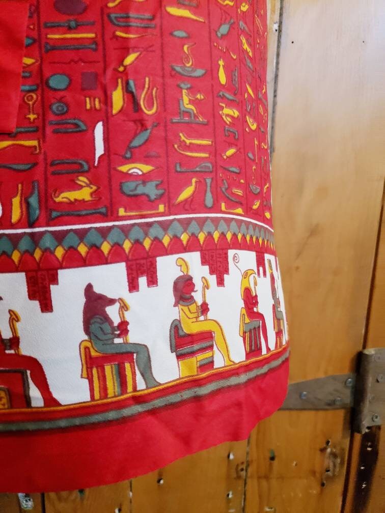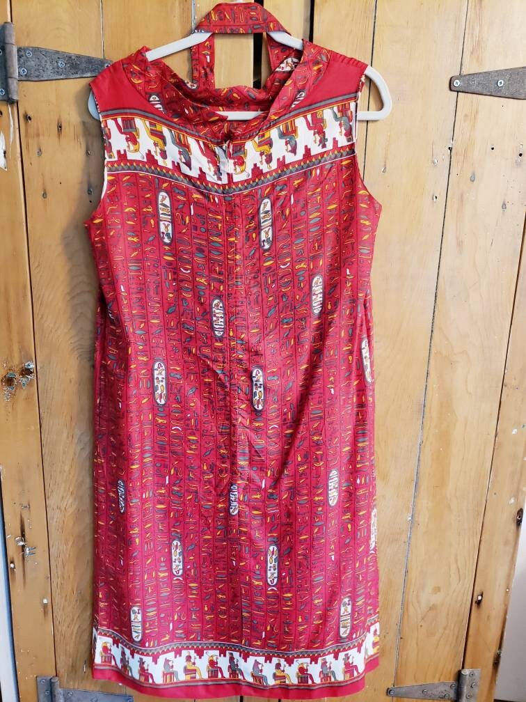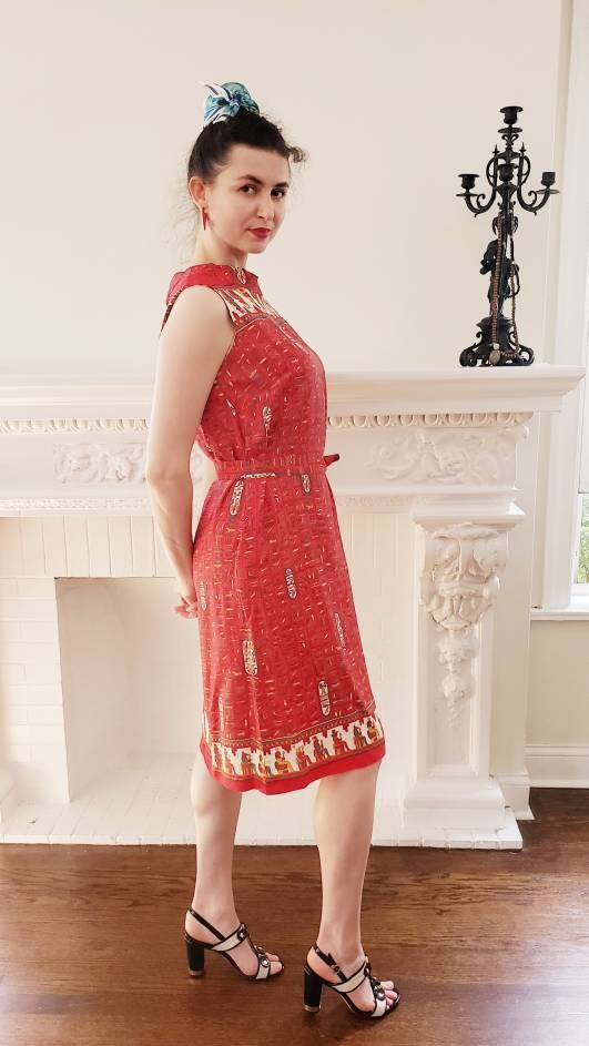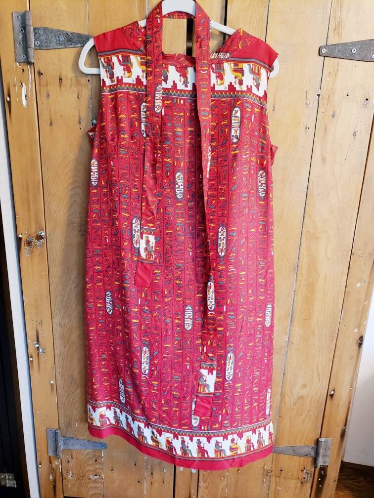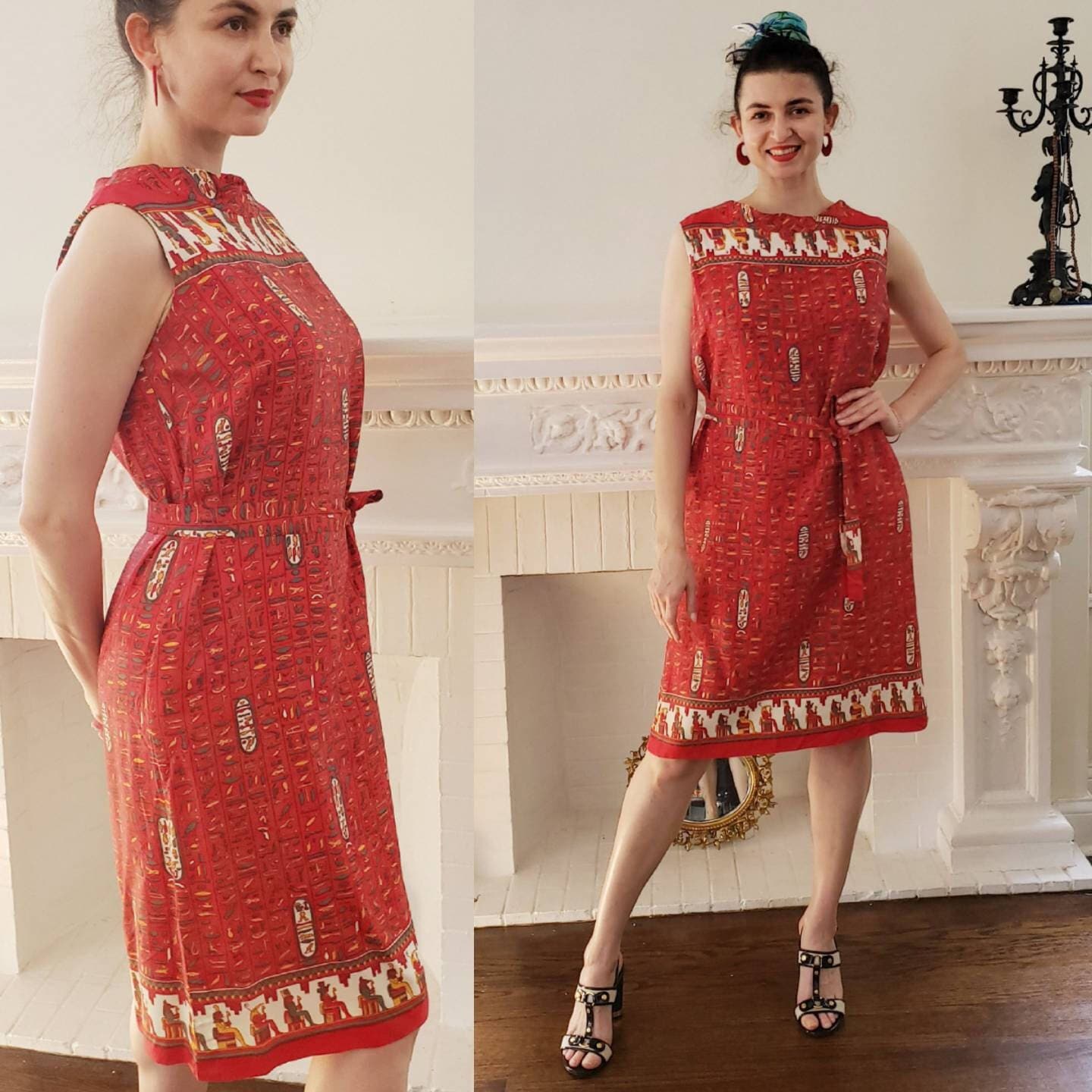 60s Silkprint Summer Dress Ancient Egypt Print Hieroglyphics / Sleeveless Shift Dress Red Multicolored Pattern Sash Tie Belt / L Bastet