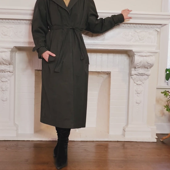 Lush, warm, visually striking long coat in a brown and black raccoon stripe fur. Features a large, fold down collar and an A line silhouette. Closes with hidden hooks at the center front. There are slit pockets at each hip. Fully lined in satin on the interior. There is a hidden breast pocket at interior right chest.