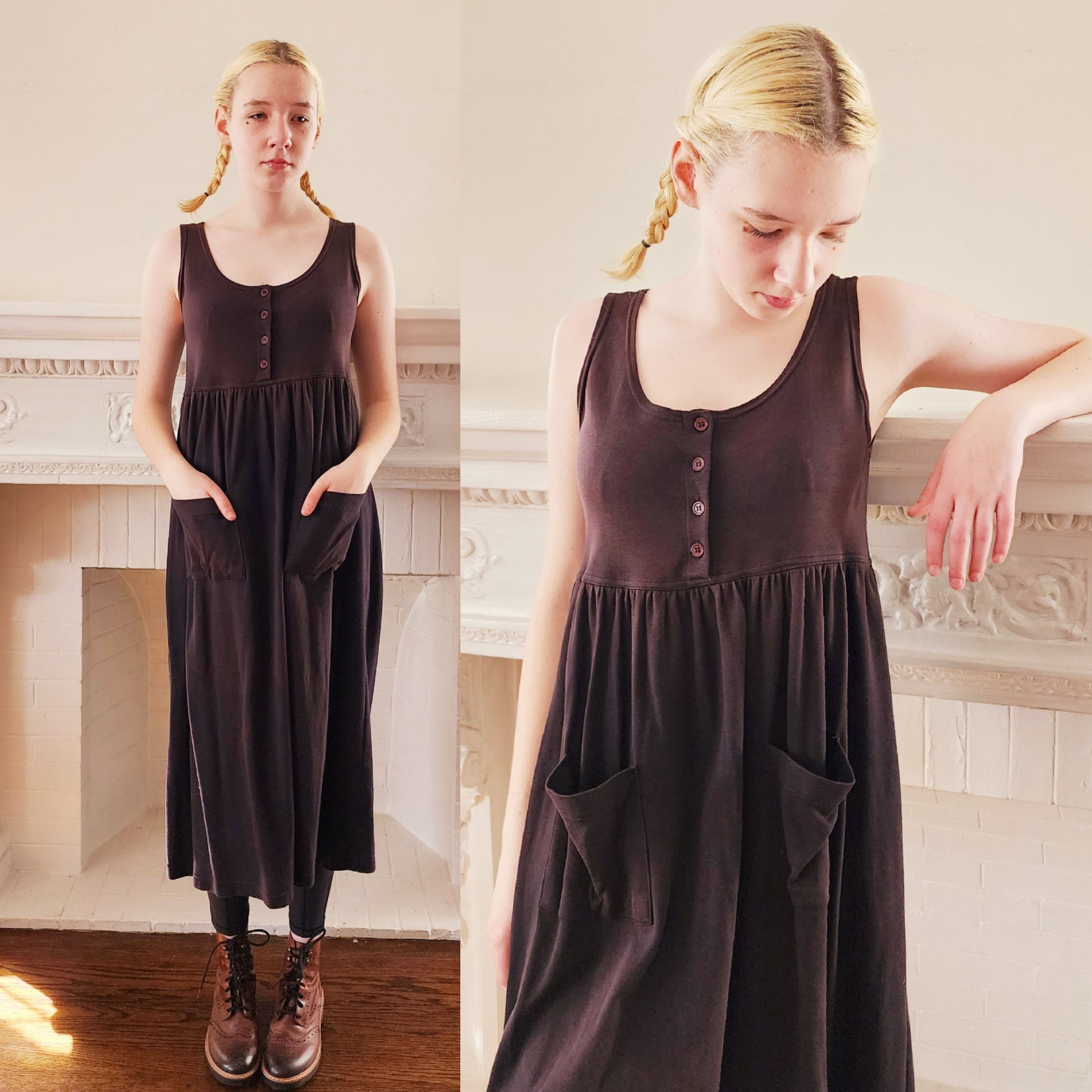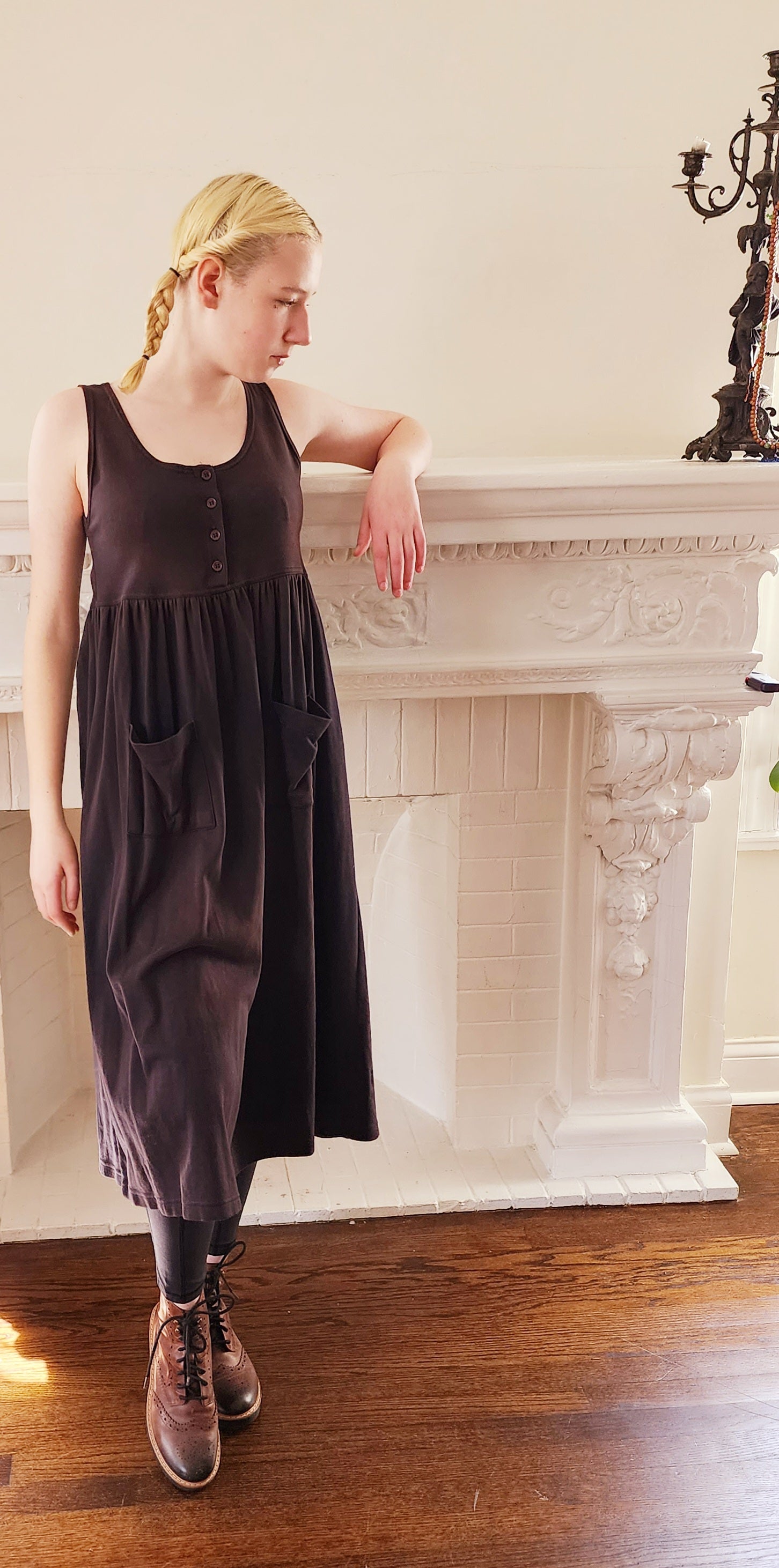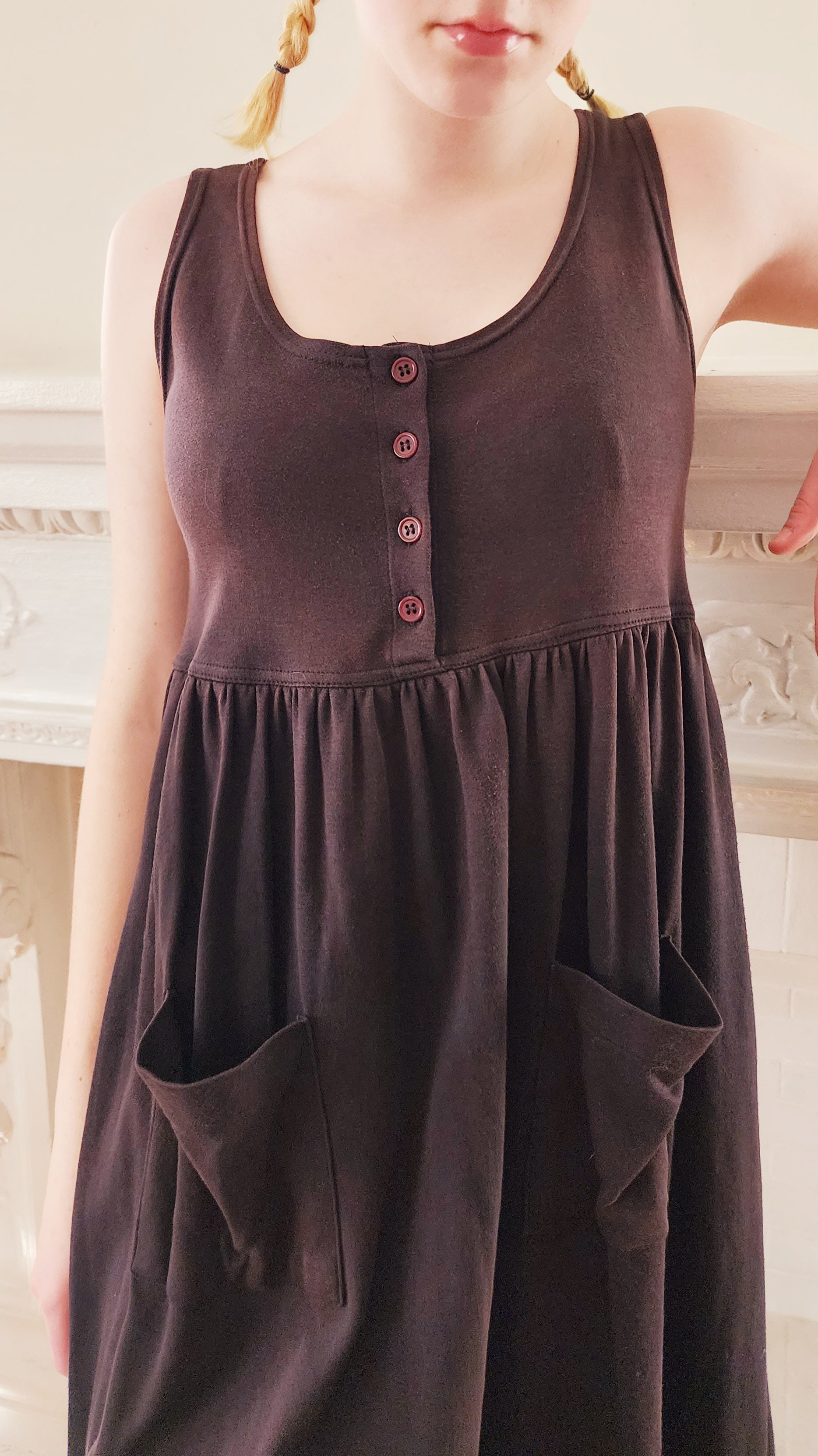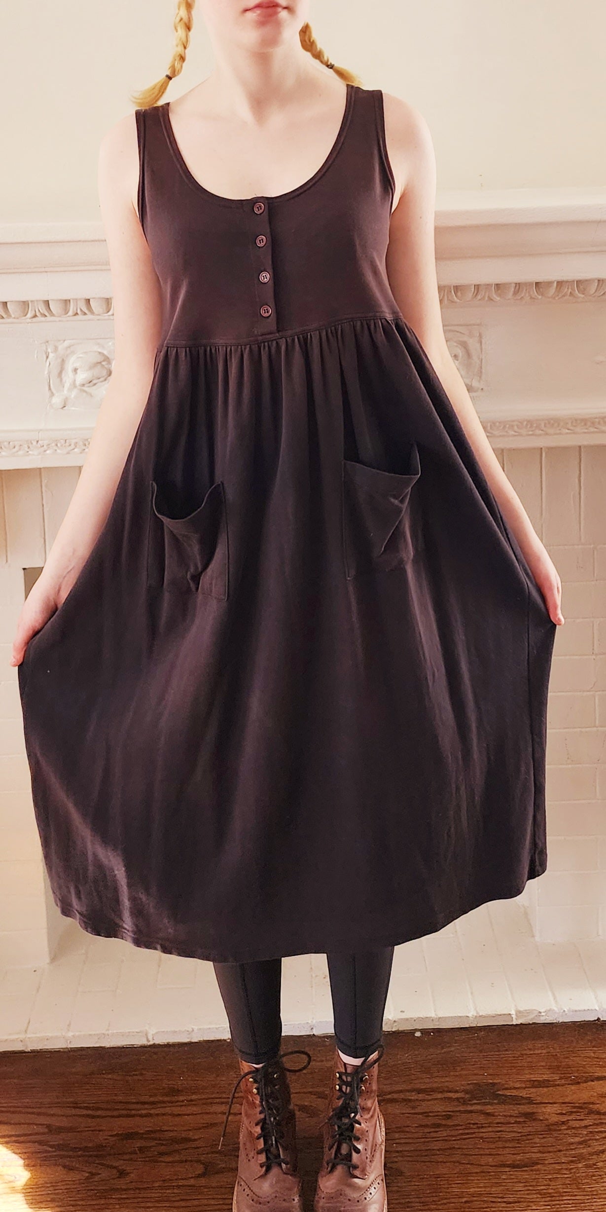Soft and comfy, this all cotton dress is sleeveless with wide shoulder straps, an empire waist seam and a loose and flowy skirt section with large apron pockets at the hip fronts. Pulls on overhead, it has a small row of buttons at the center chest that help with easy on and off. Or, leave them open over your contrasting tank top for a cute look!