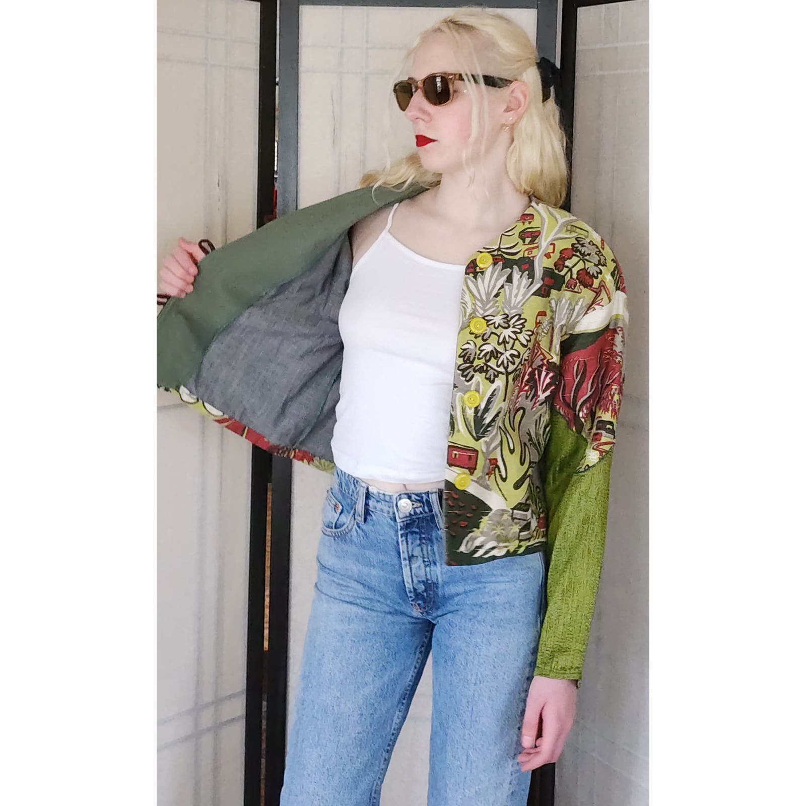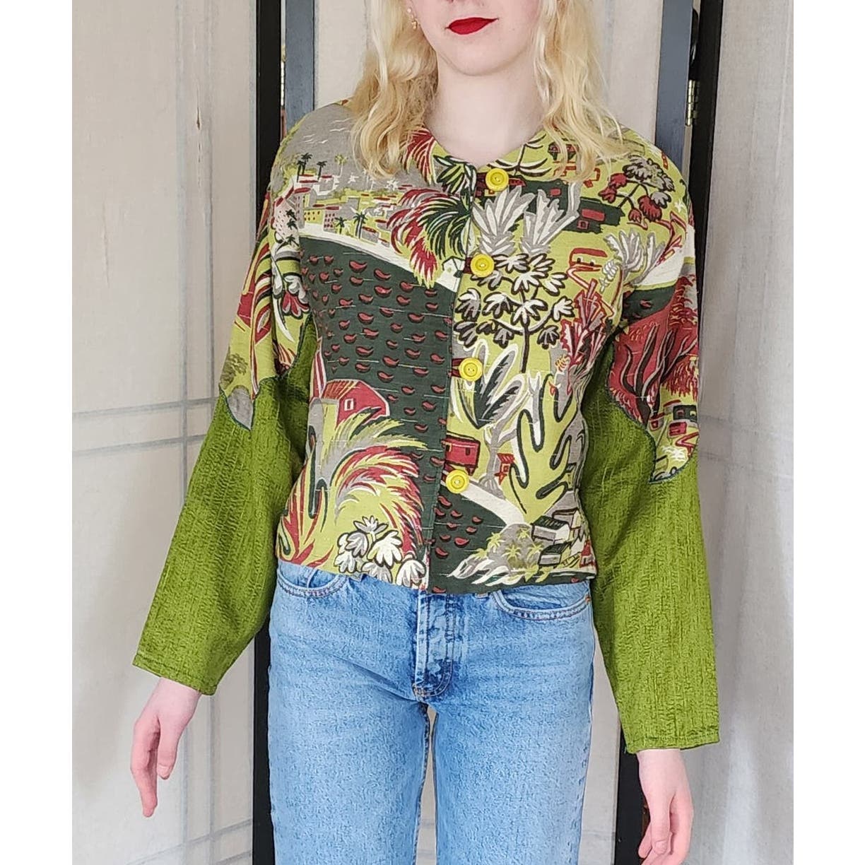 Collarless, with shoulder pads, it has a boxy silhouette and chartreuse collared buttons down the front for closure. Cropped, it is fully lined. The print is a fun and festive landscape with a village surrounded by palm trees and lush foliage, along a shoreline. Big, bold, graphics with a very southwestern vibe!