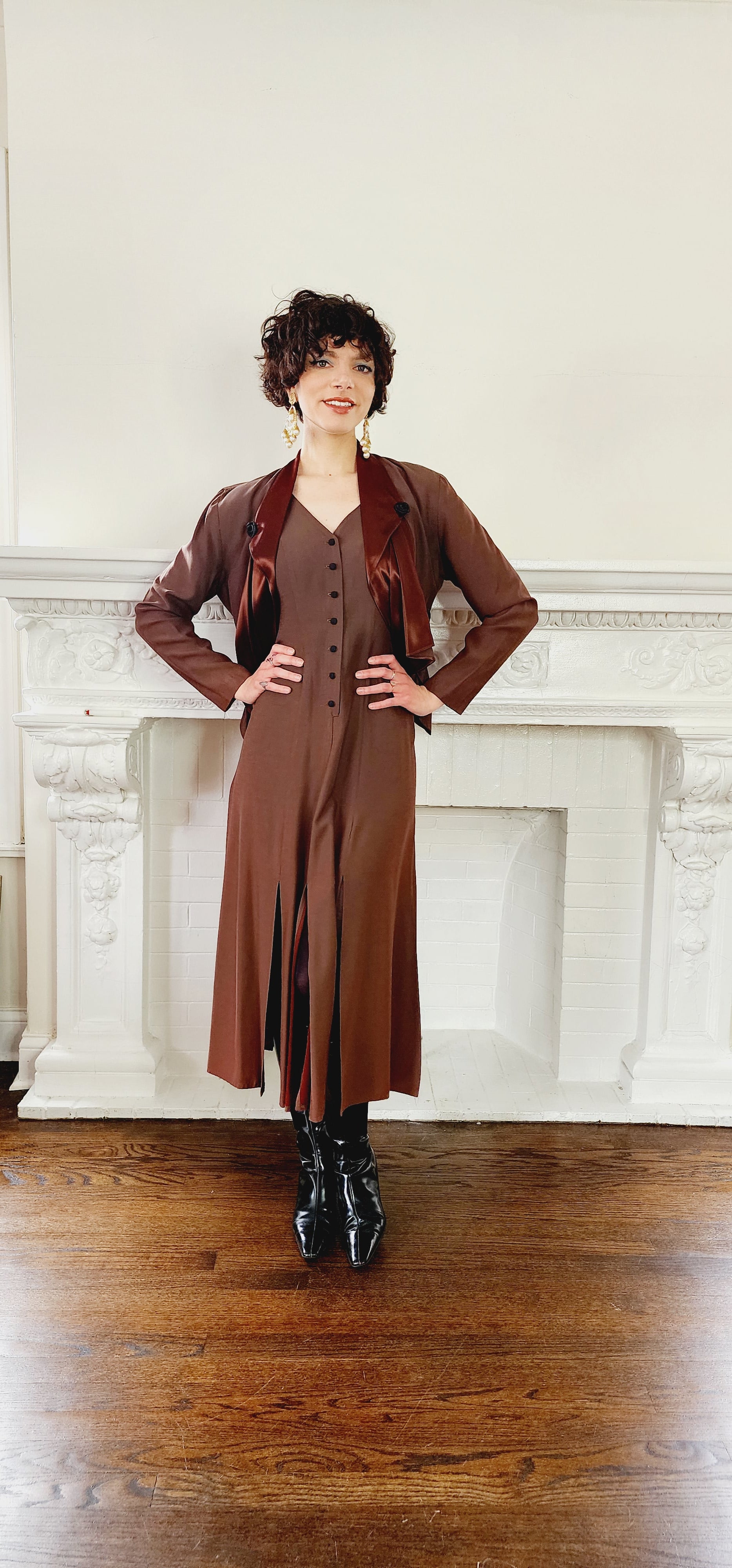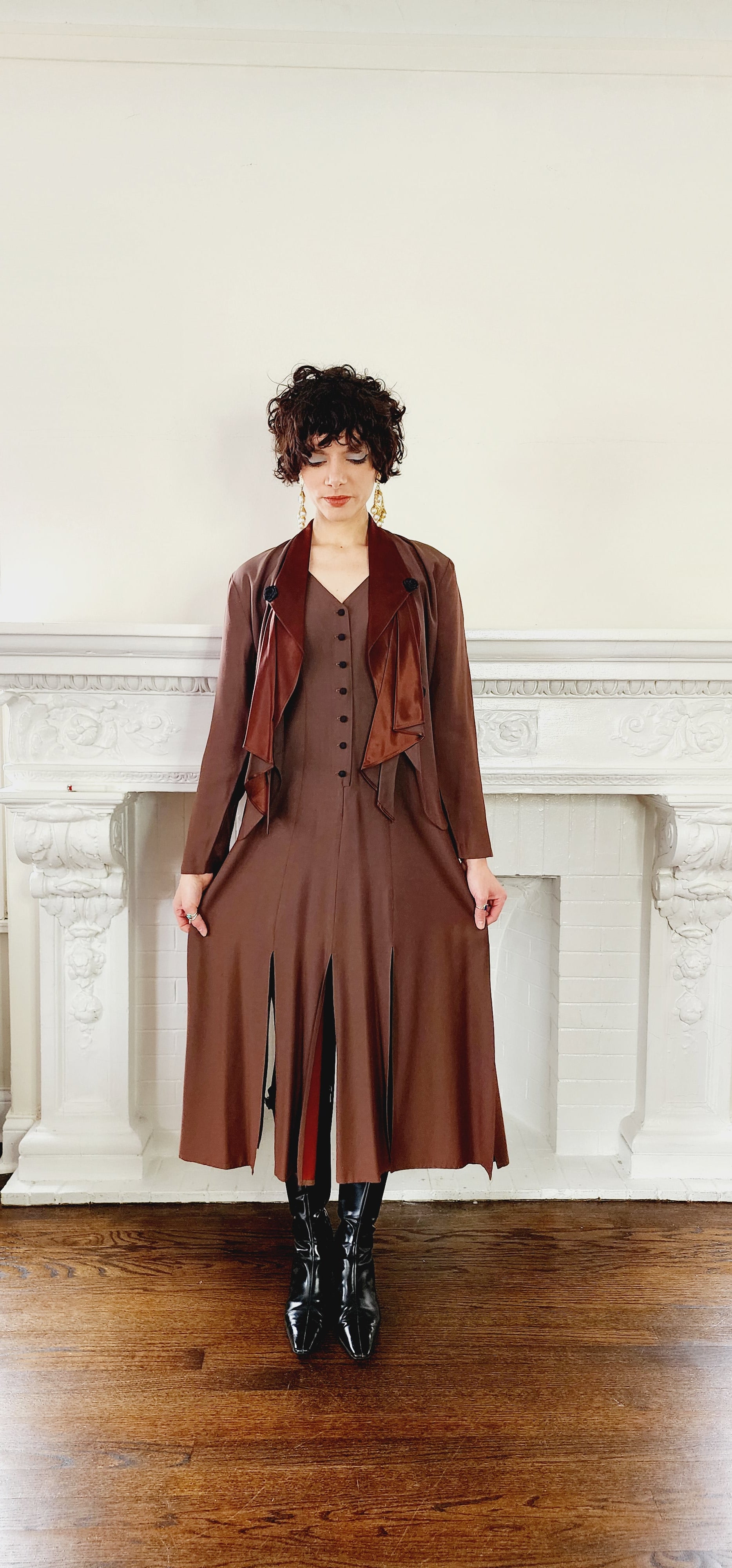 Sweetly romantic two piece consisting of a sleeveless dress with a button down front and a hem delineated by large slits - paired with a matching blazer jacket with copper satin shawl collar and an asymmetrical array of black ribbon rosette embellishments. The best part of this blazer is the large "window" or split (aka keyhole) at the rear! Both pieces fully lined.