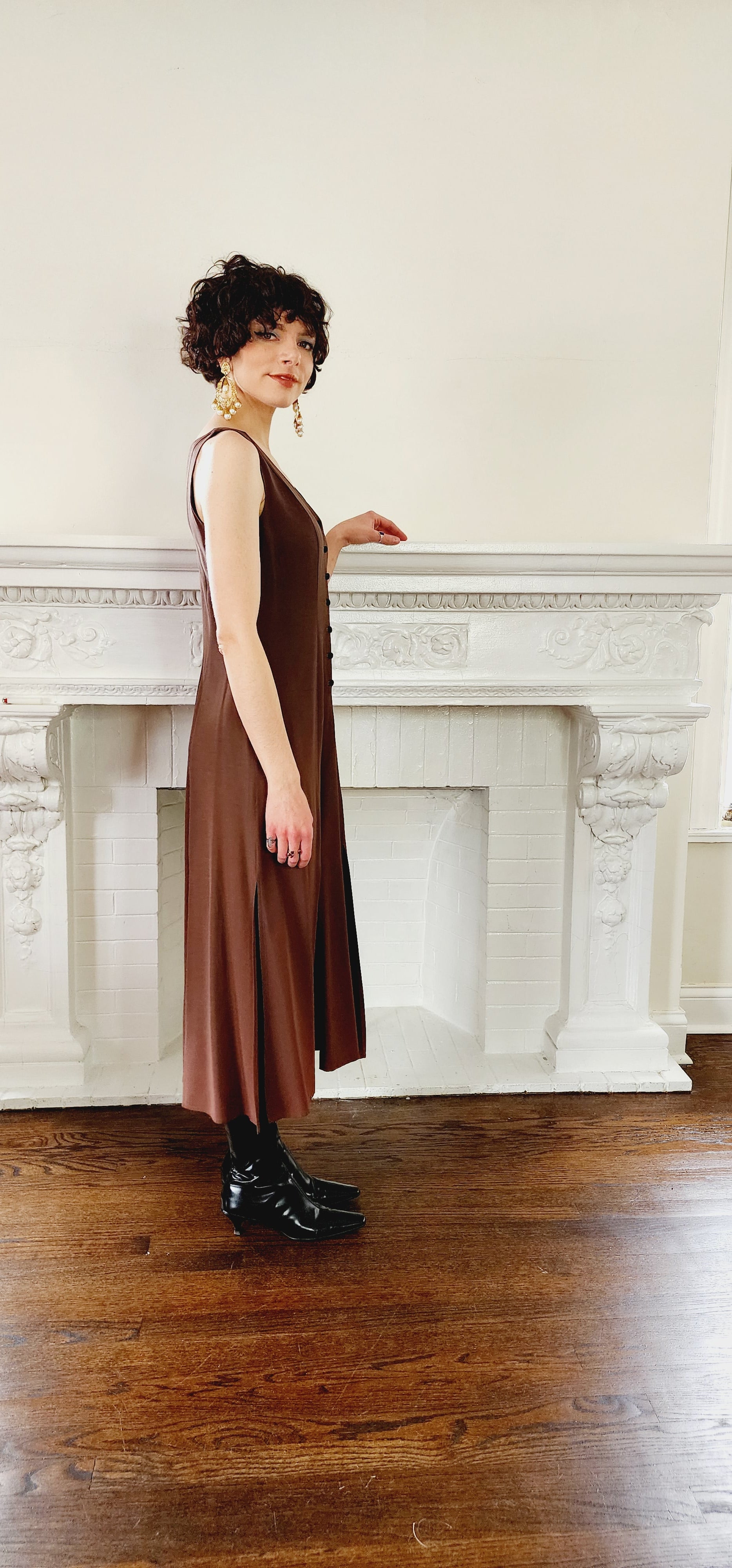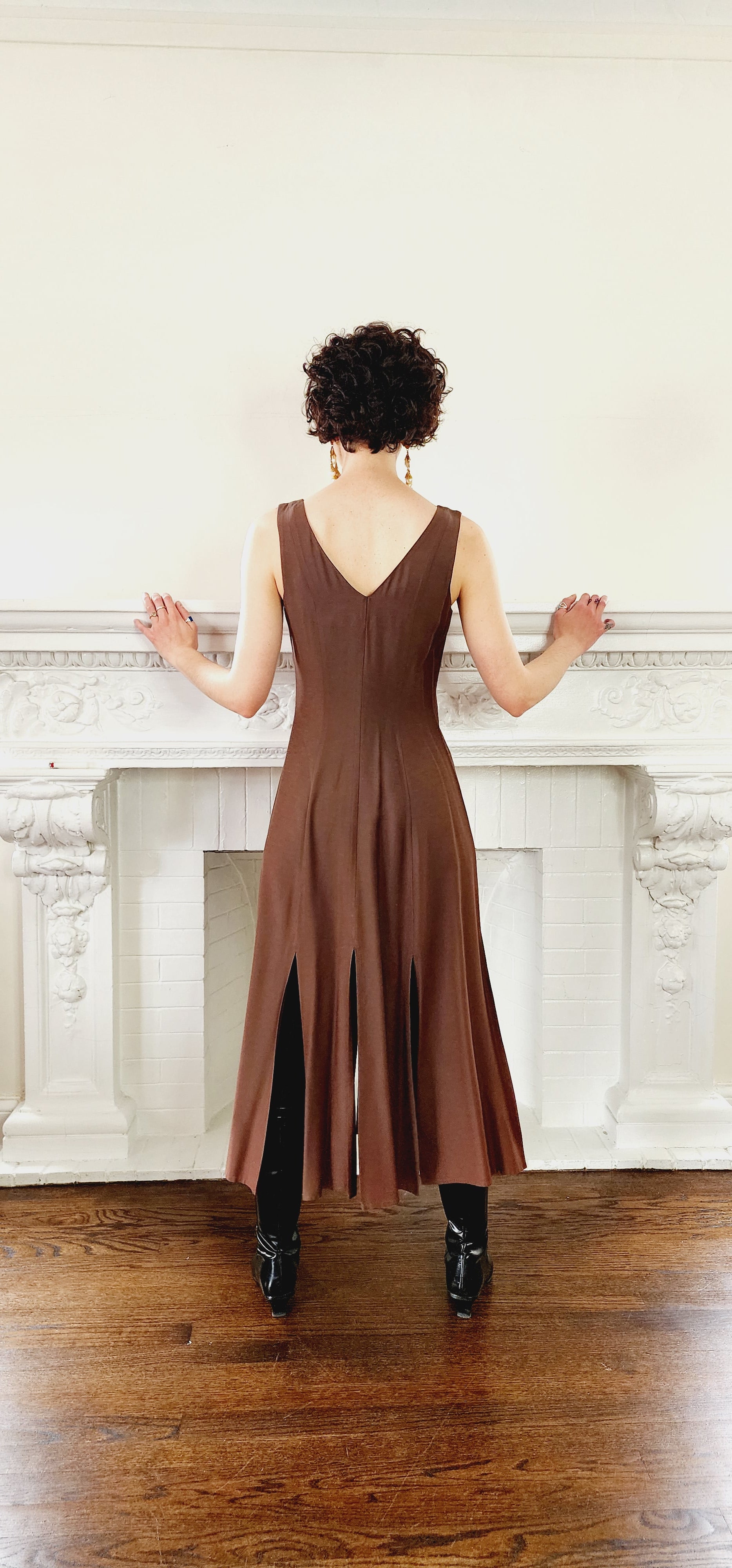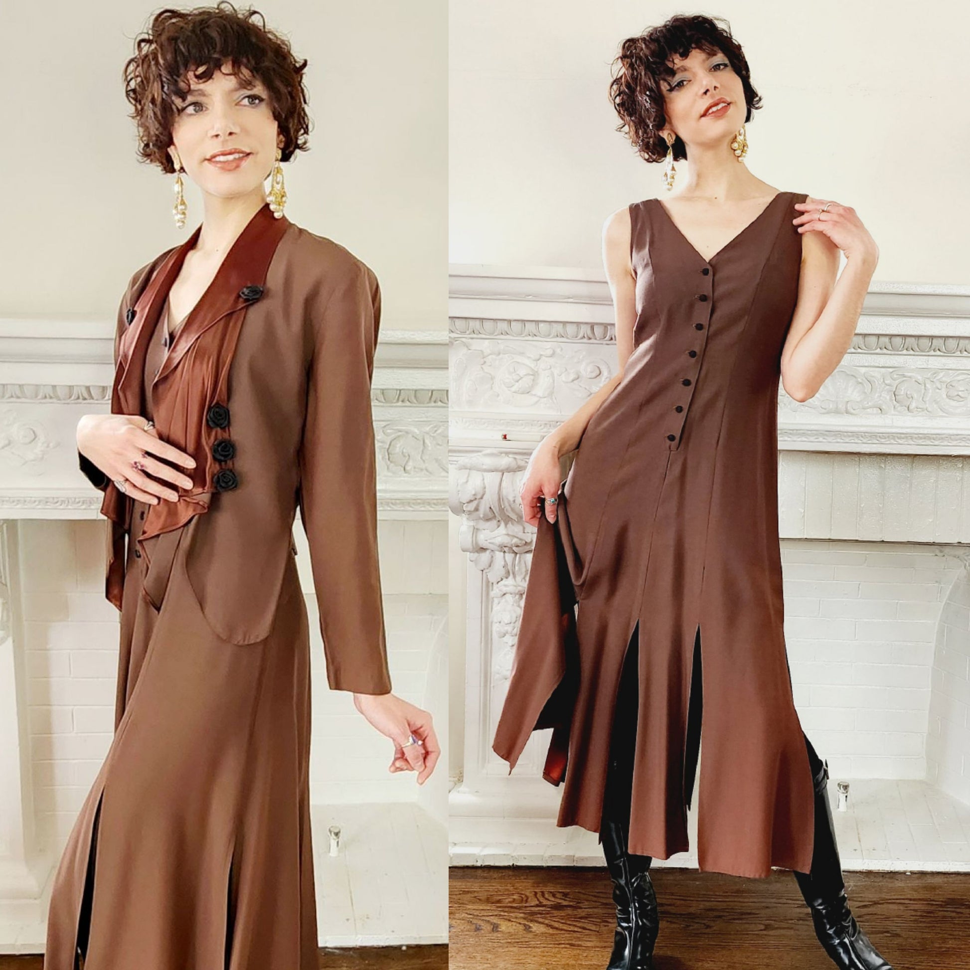 90s Dress Suit by Wild rose in Brown Rayon / Romantic Blazer & Sleeveless Dress Ensemble / M