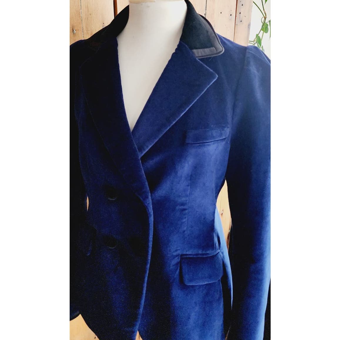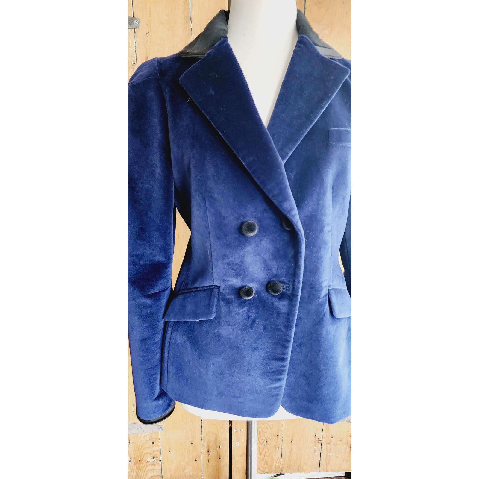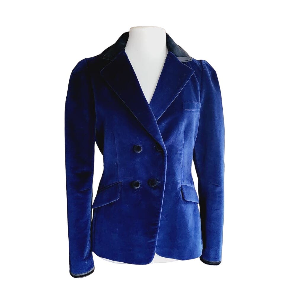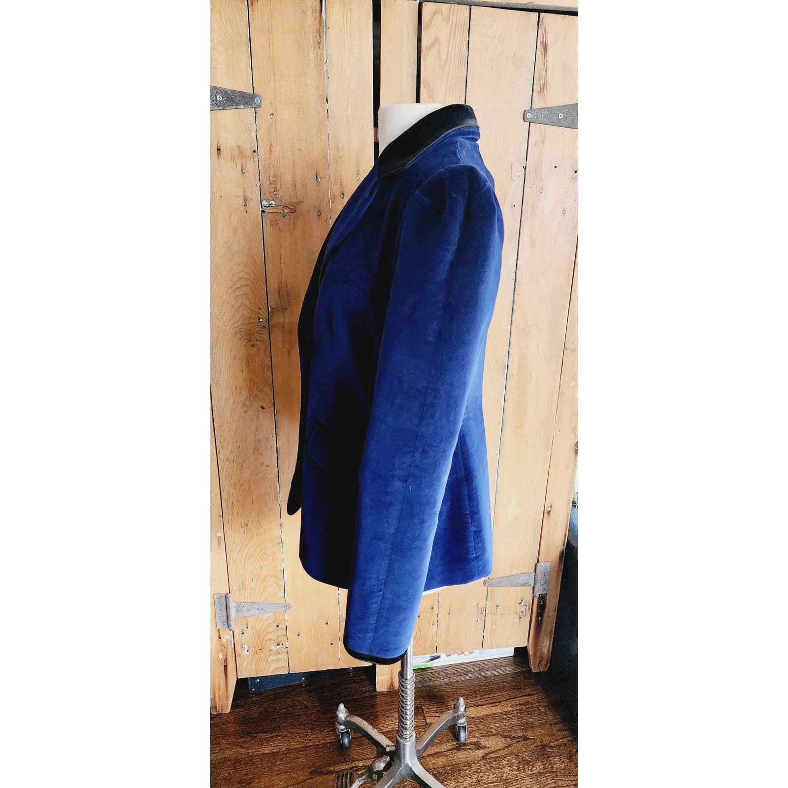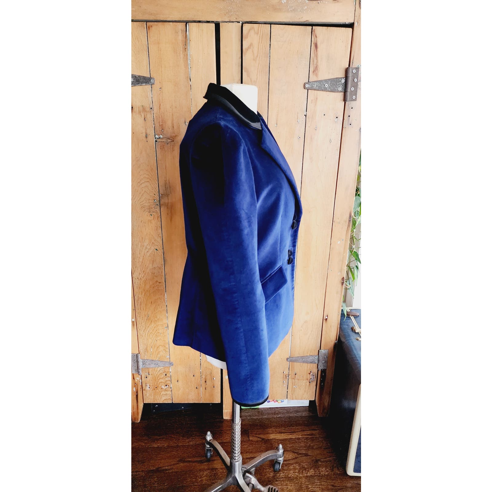 Sumptuous blazer in a deep blue velvet with black satin trim around the collar, and sleeves cuffs. Double breasted closure, flap pockets at front hips and a slit pocket at left chest front complete the look. Fully lined at the interior.