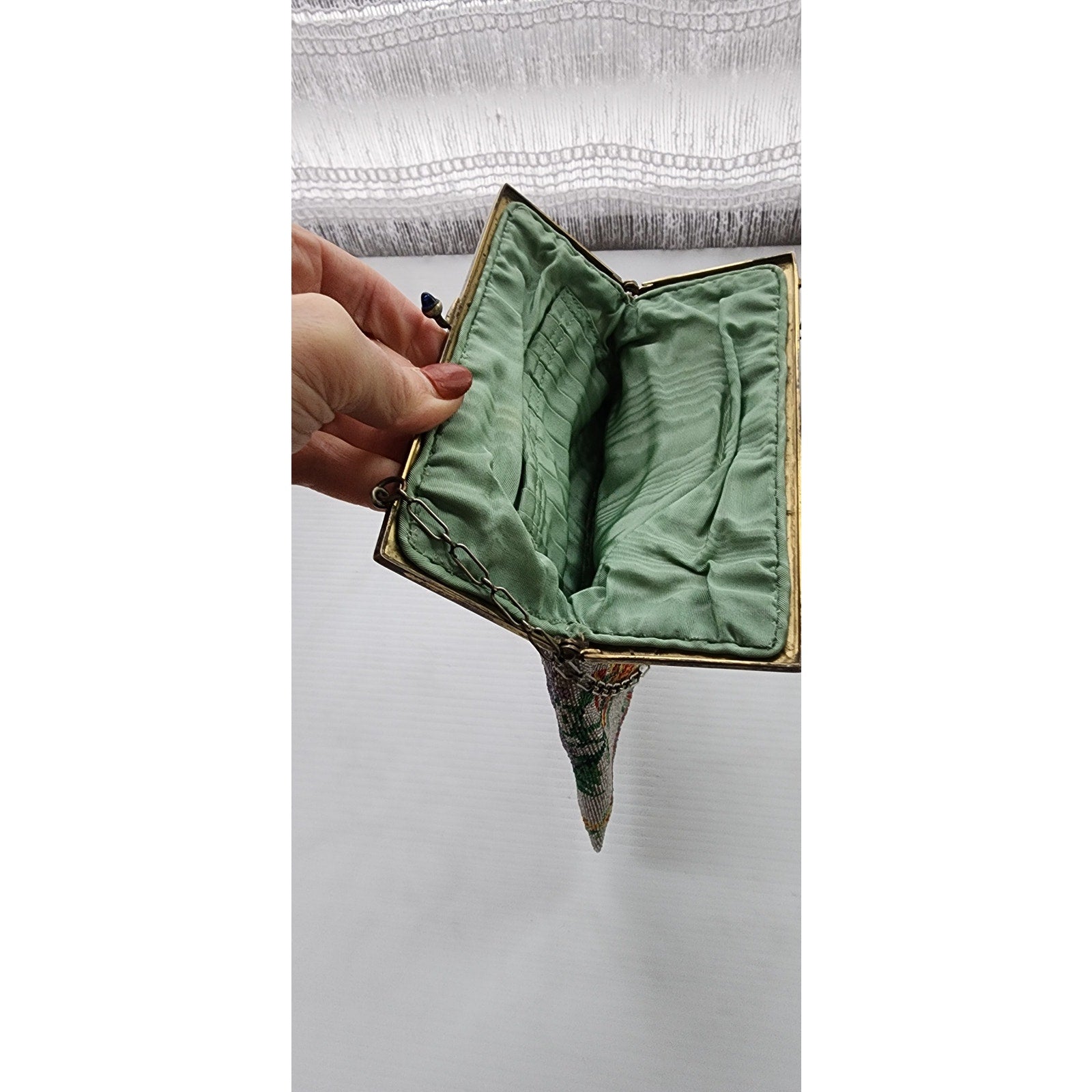 Soft, sack like body completely covered in microbeading with a glorious, luscious, multicolored floral design at front and back. Opens on a hinged, metal frame with a kiss clasp that features little cobalt blue stones. Paperclip style silver handstrap completes the look. Interior is a green satin with a pleated slit pocket. No labels.