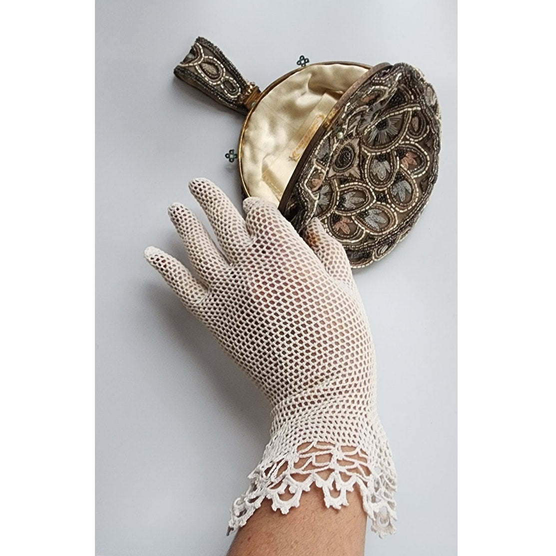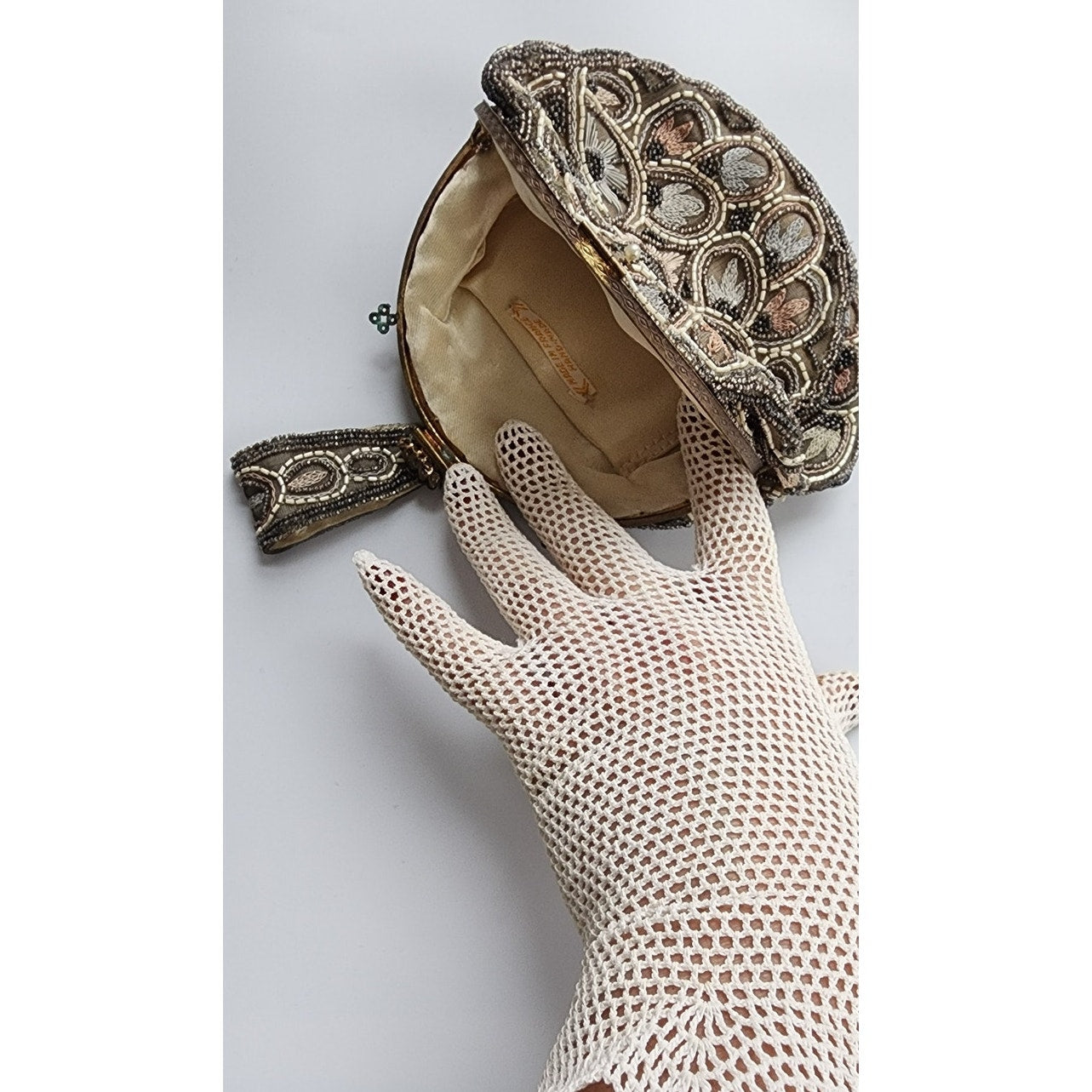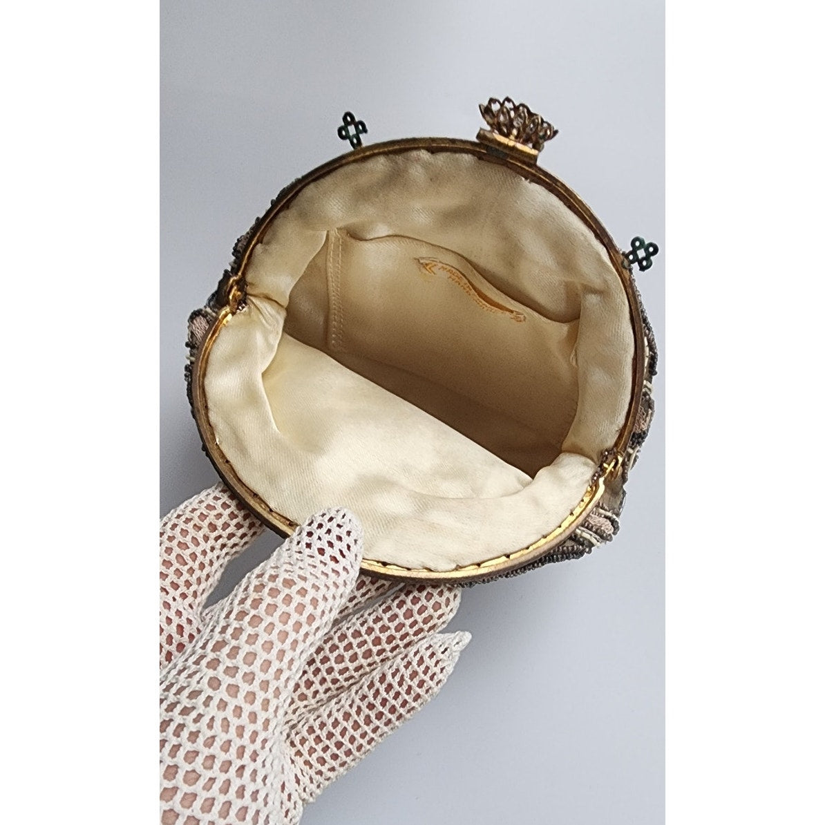 CONDITION: Overall very good. No specific issues to note other than some expected green discoloration to small sections of the metal frame and clasp. There appears to be one small, pearl like bead missing from the clasp's flap at the bottom. Interior is very clean! No sign of missing beads or thread to the exterior!