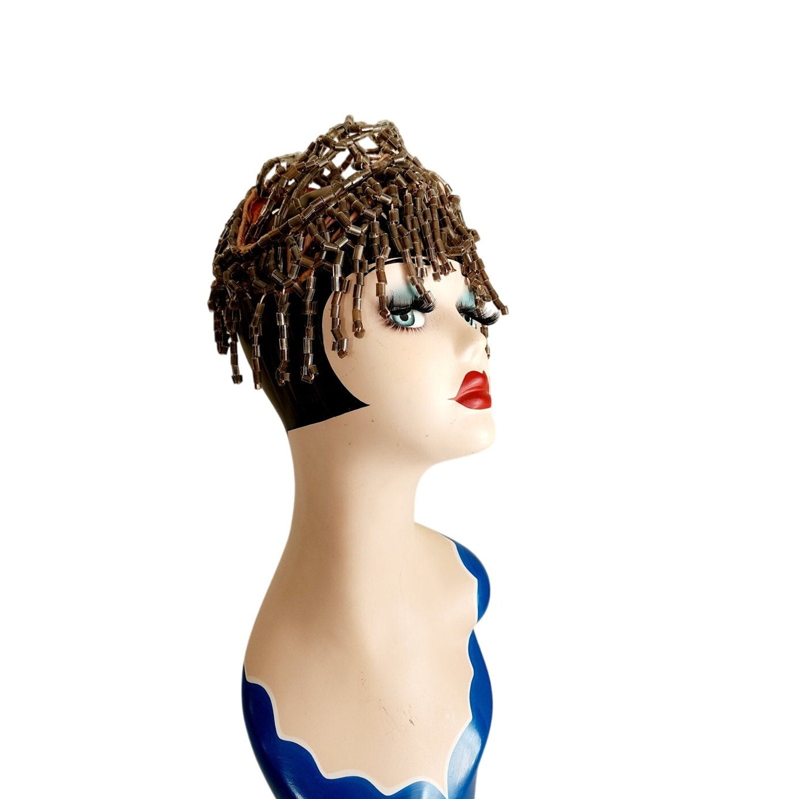 Antique Beaded Headdress Hat Gray Beads One of a Kind Medusa Flapper