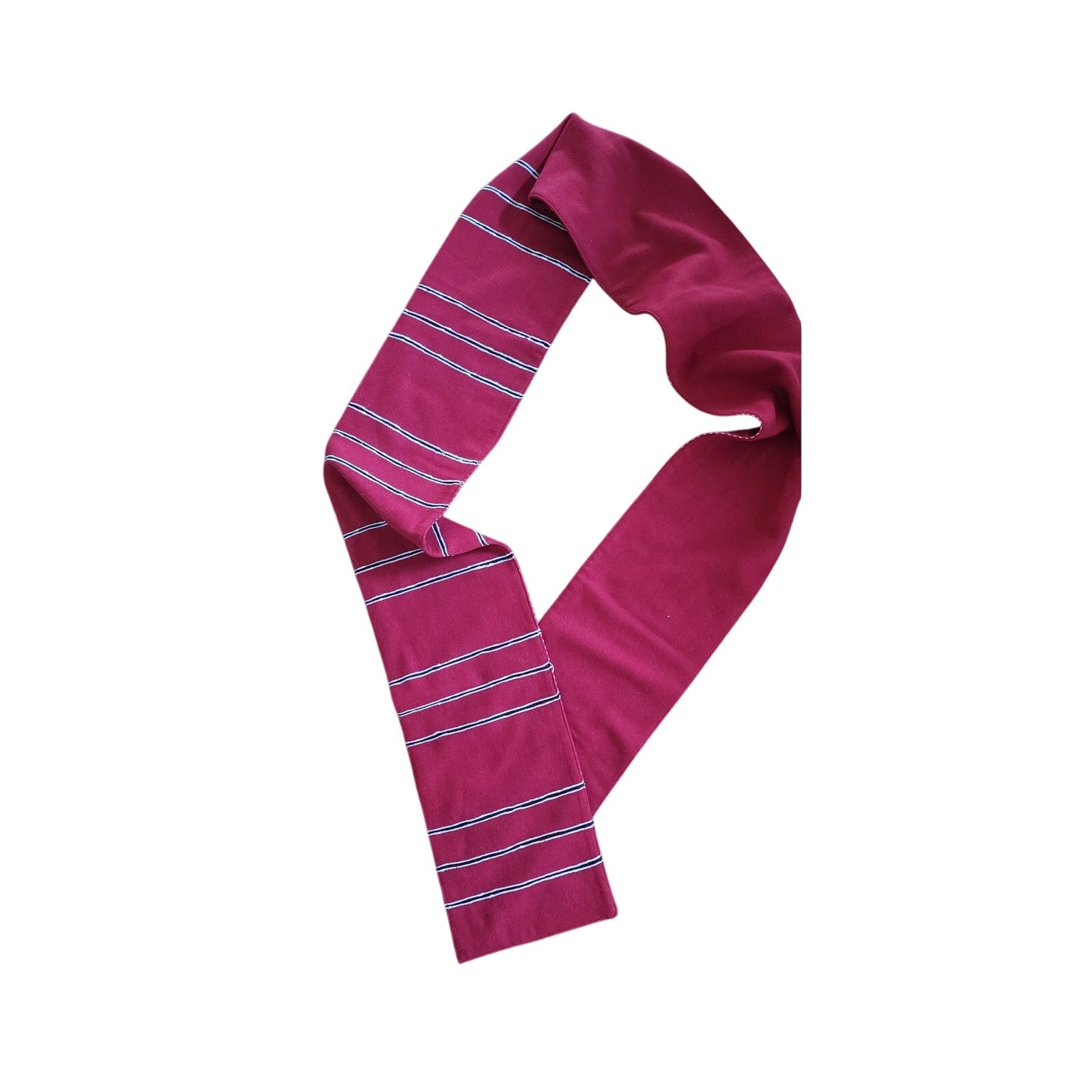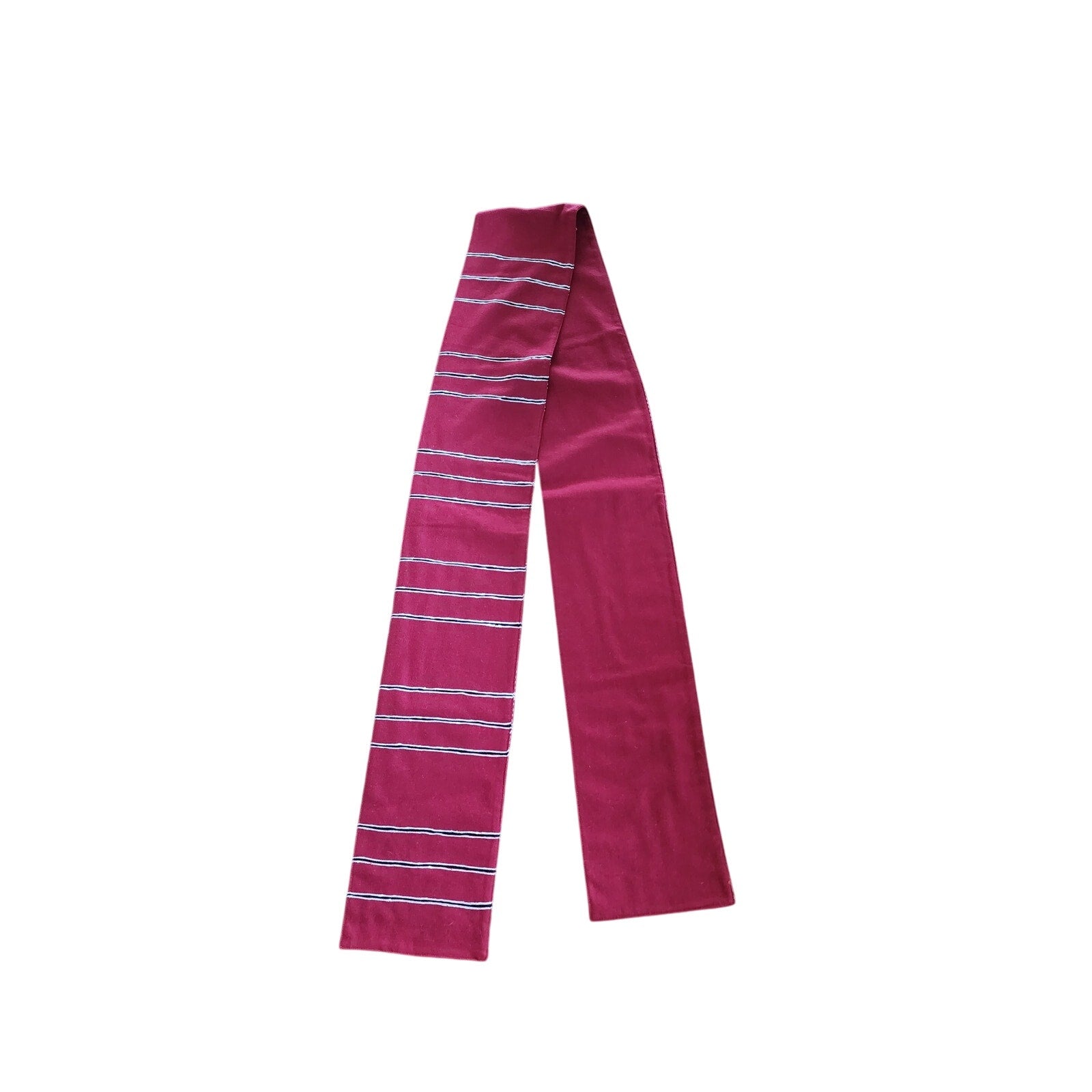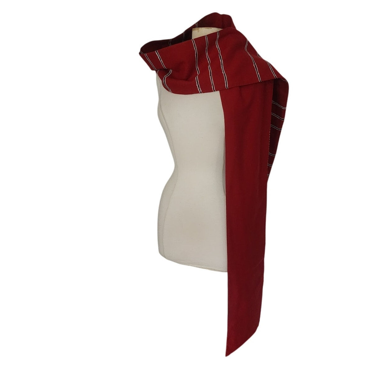It comes with a long, rectangular shaped scarf in red wool with horizontal stripe. Likely worn as a belt sash but can be used as scarf.