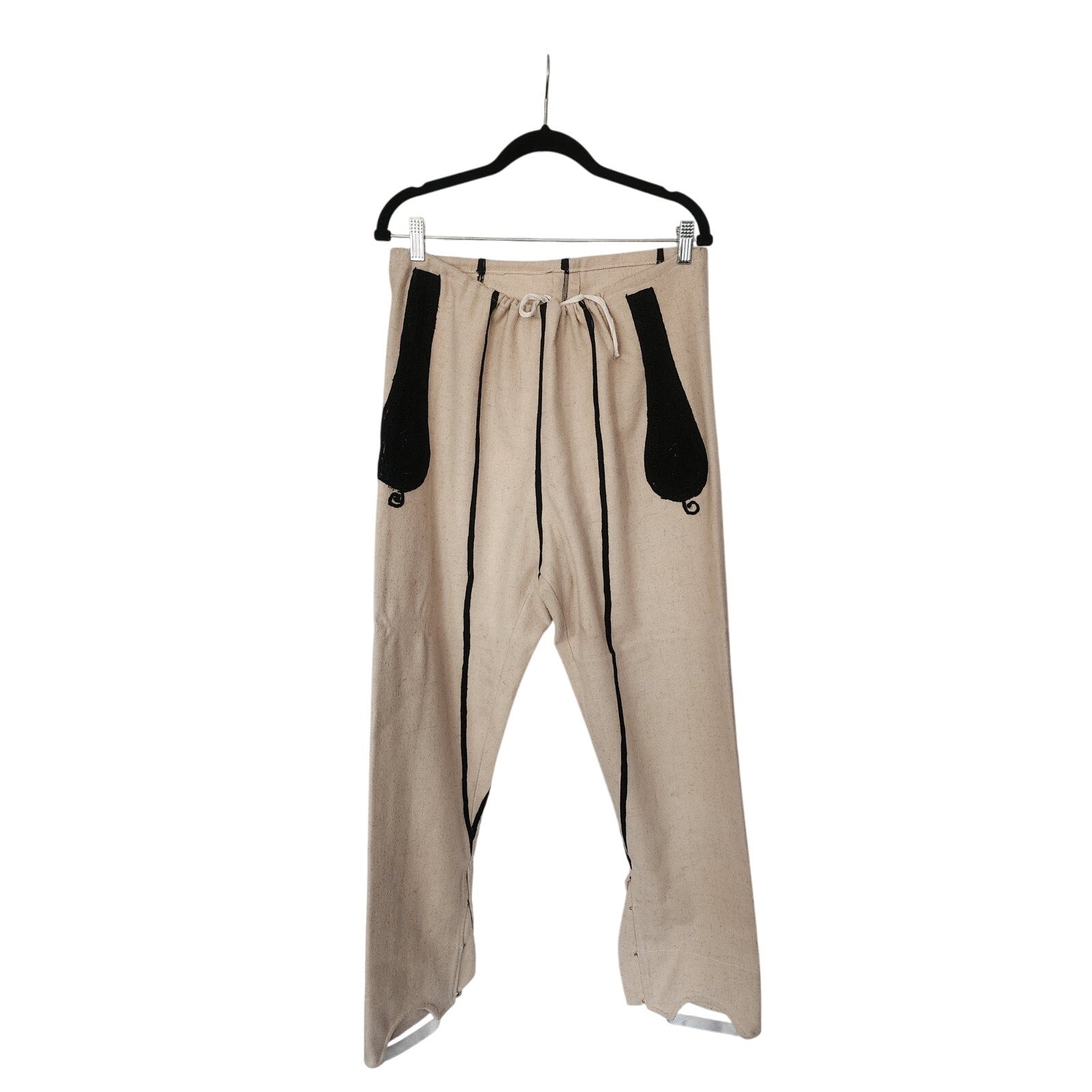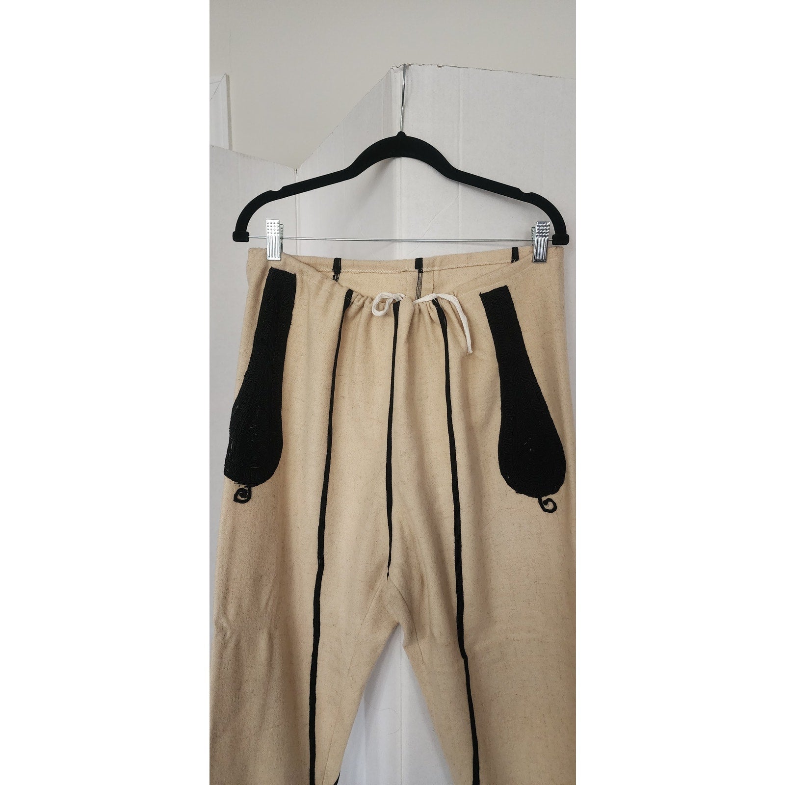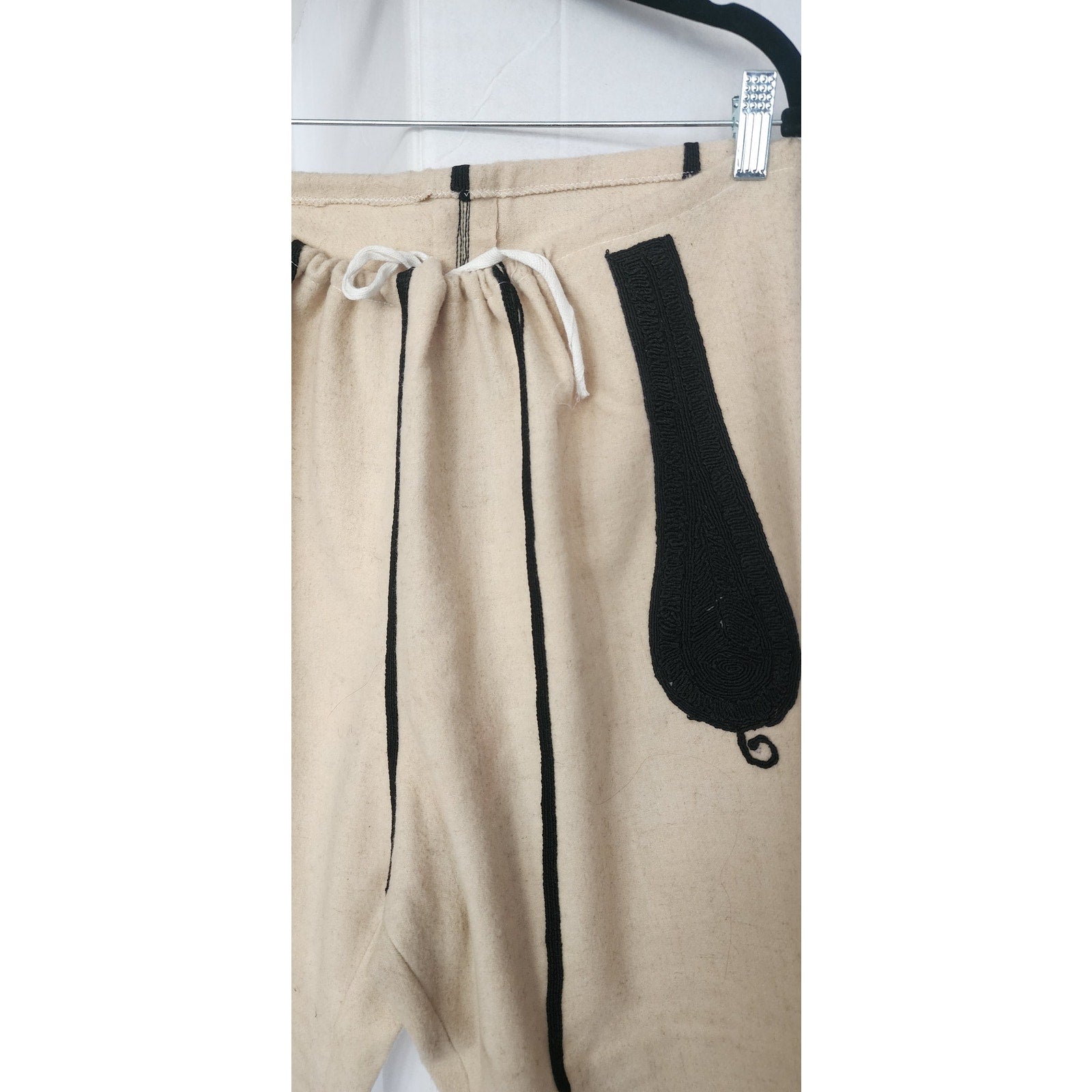 Rare set! Bulgarian mens pants in a cream wool, featuring heavy embroidery in black, coiled thread along the hip fronts and in long, vertical stripe along the lengths at front and rear. Features a drawstring closure at the waist, and elastic stirrups at the cuff of leg, along with a series of hooks at the ankle. Unlined.