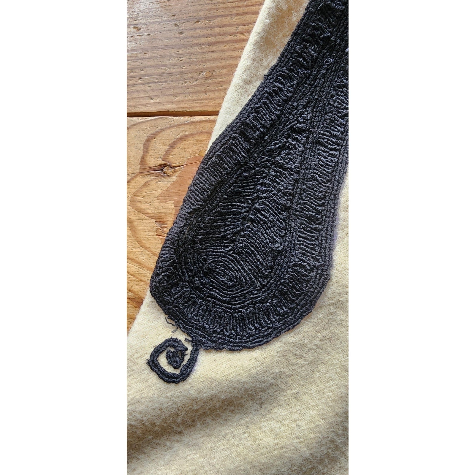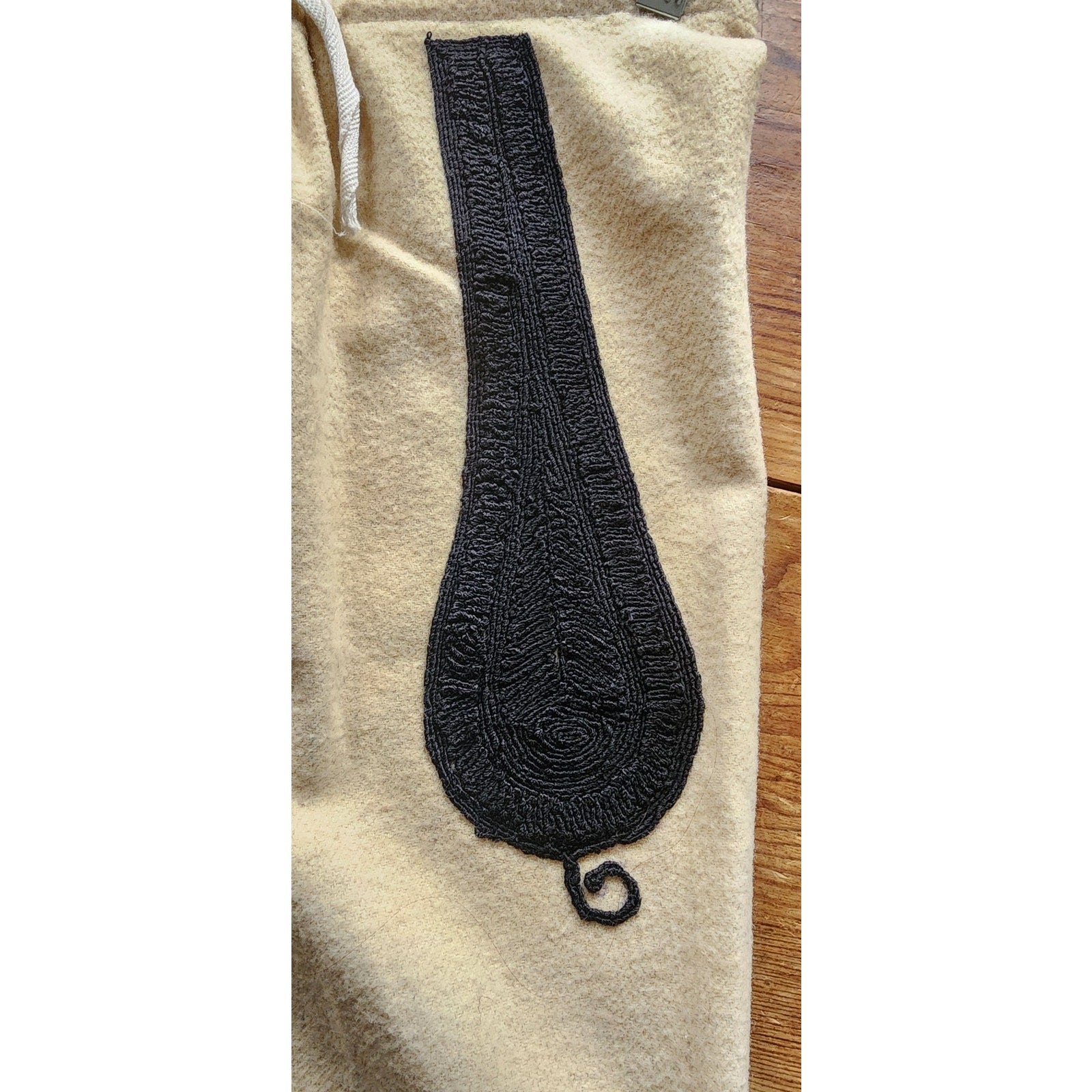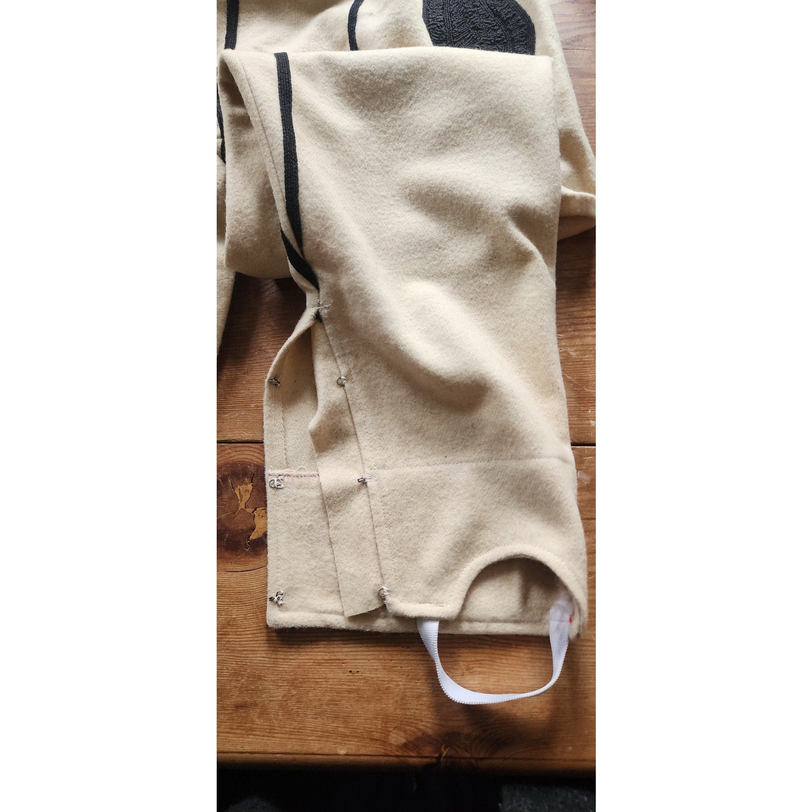 Rare set! Bulgarian mens pants in a cream wool, featuring heavy embroidery in black, coiled thread along the hip fronts and in long, vertical stripe along the lengths at front and rear. Features a drawstring closure at the waist, and elastic stirrups at the cuff of leg, along with a series of hooks at the ankle. Unlined.