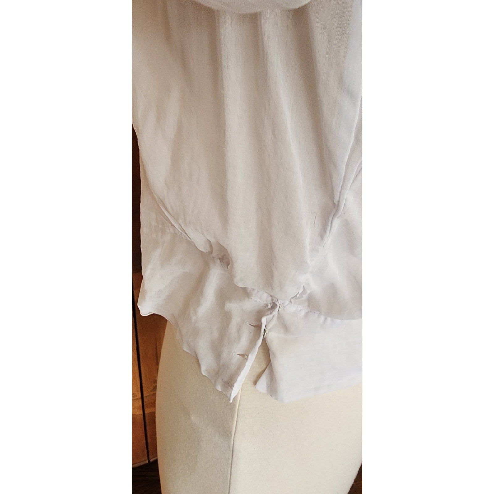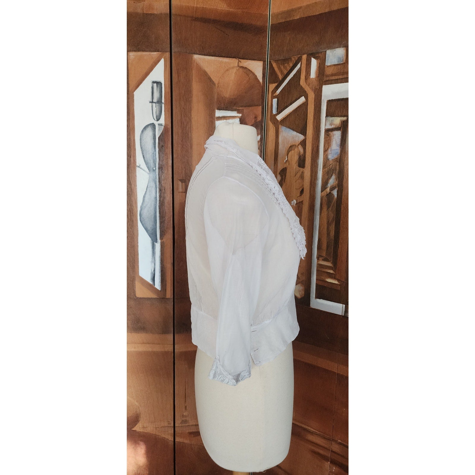 Exquisite and delicate gauzy top featuring three-quarters length sleeves and a sailor like collar embellished with lace embroidery, as is the front chest section. Closure is interior snaps at the chest as well as the sides of the waist. Gathers at the waist for a bloused effect. Note the pintucks at rear and front. Unlined so semi-sheer.