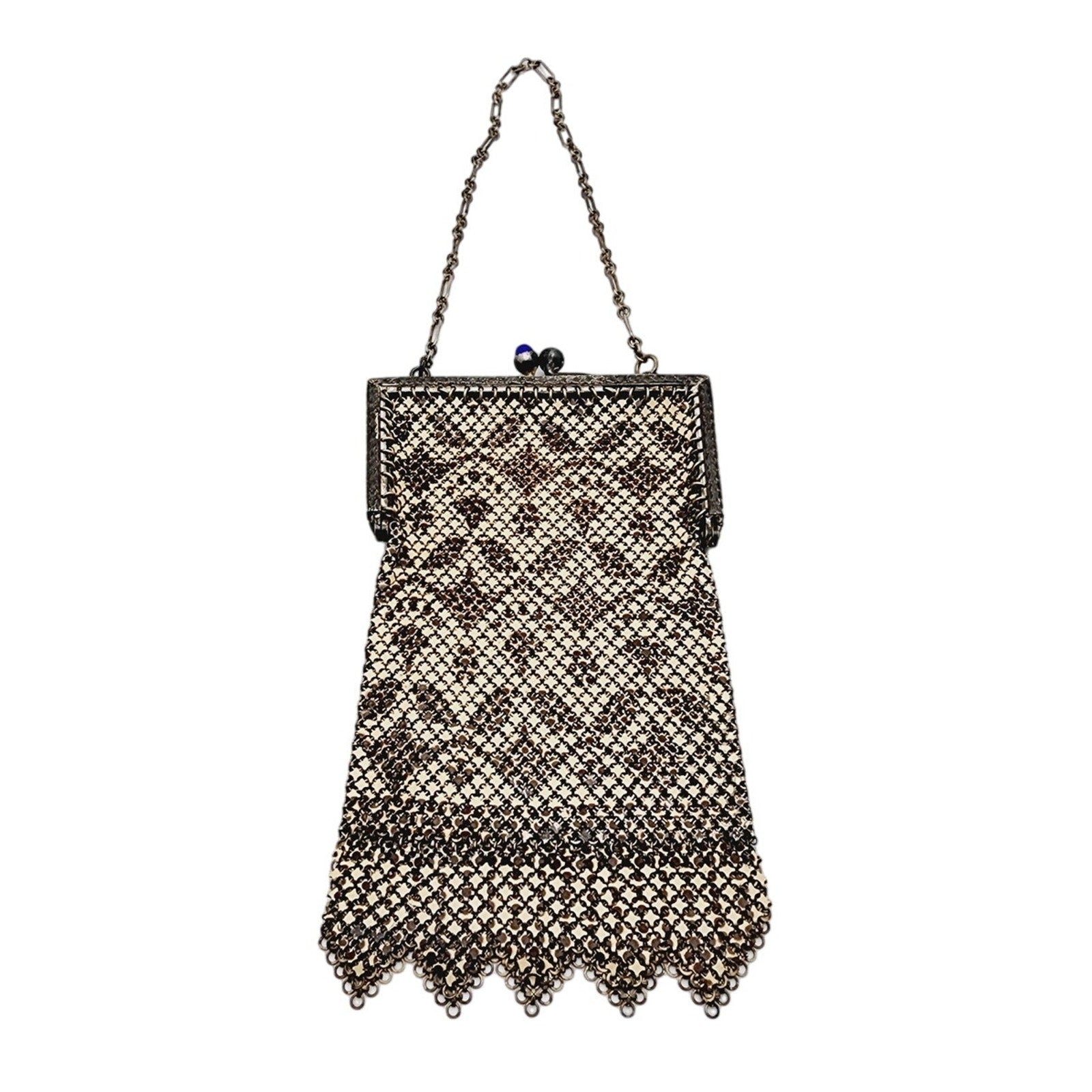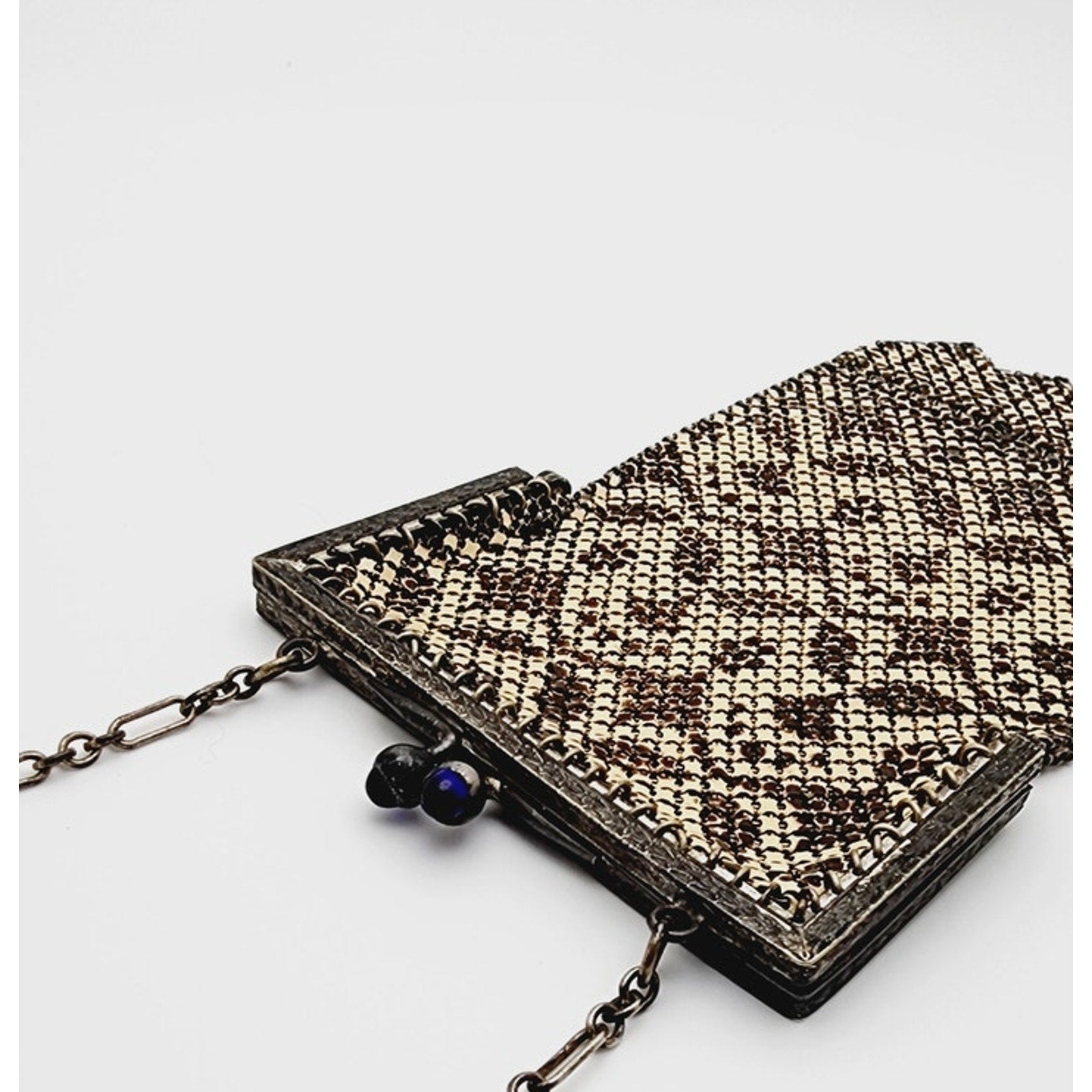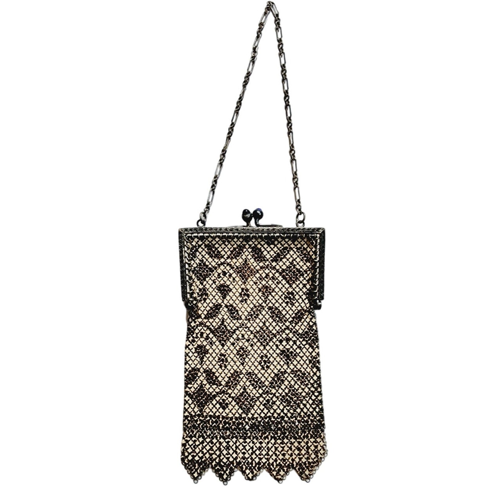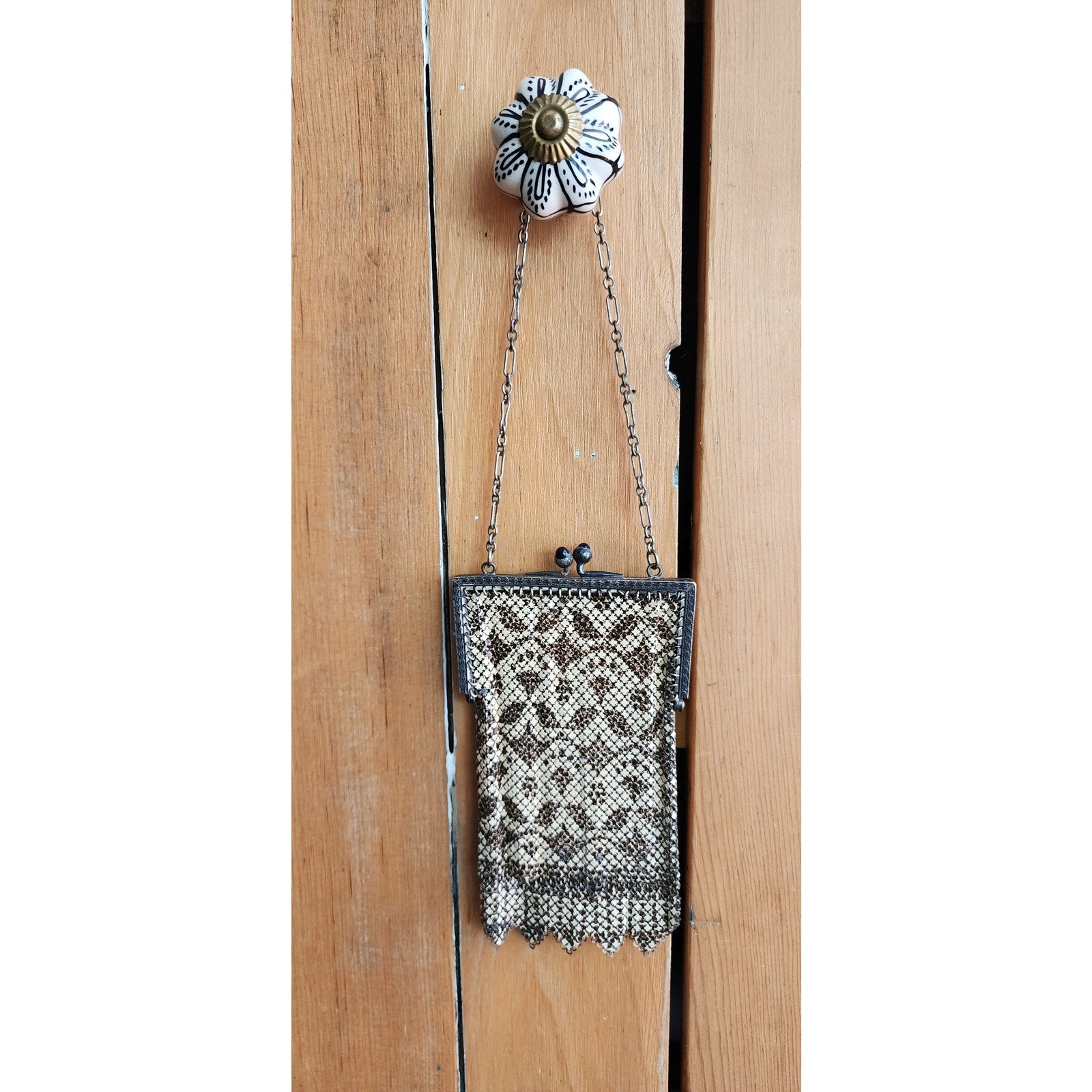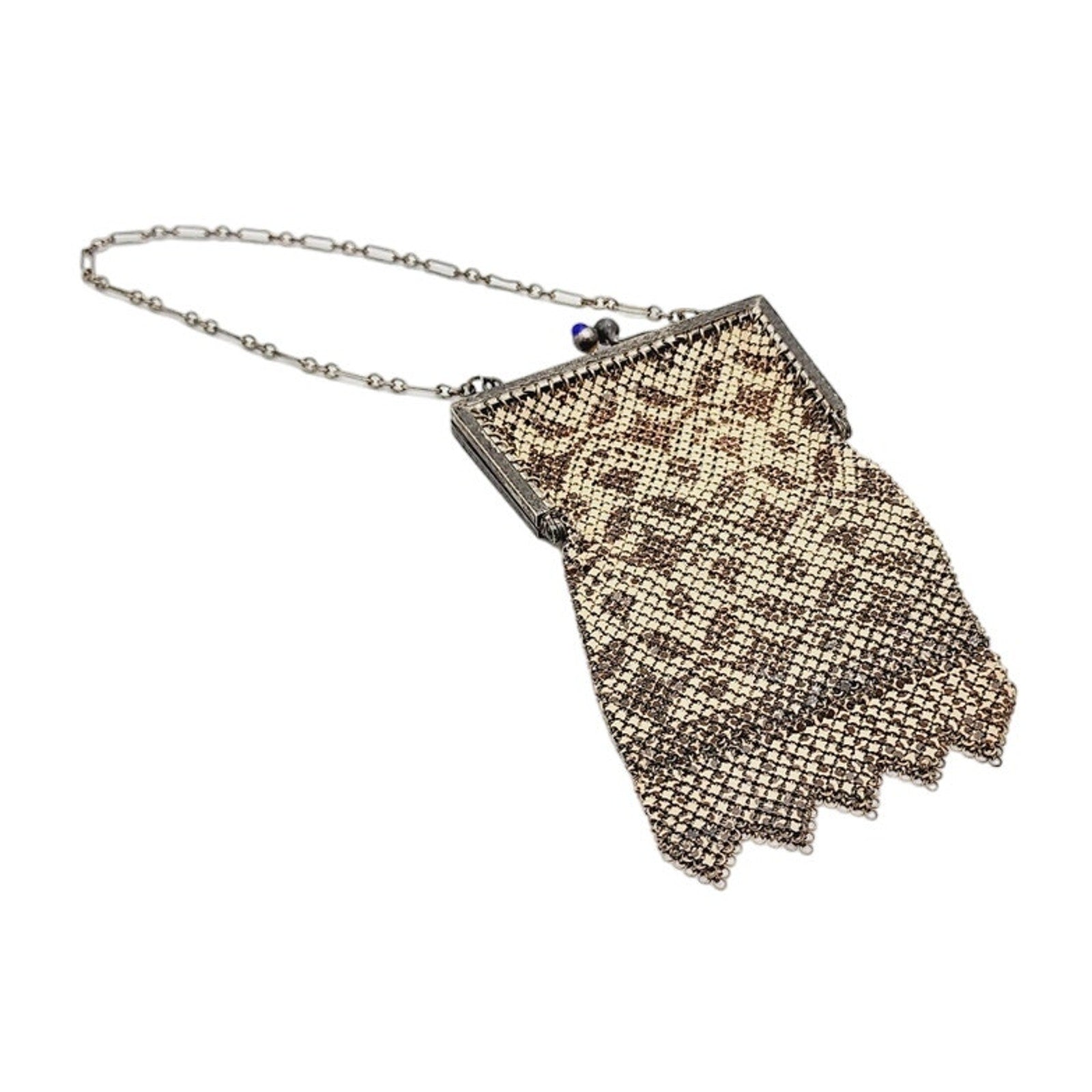 An exquisite beauty of art nouveau gorgeousness, this is a tiny little purse, perfect for one kay, one lipstick, and one credit card. Mesh body is decorated in delicate brown and beige pattern of abstract floral, with the bottom edged in a triangular pattern. Opens on a metal hinged bottom with a kiss clasp inset with glass beads. Metal, paperclip style handstrap completes the look. Interior unlined. Interior of frame is stamped with the Mandalian name.