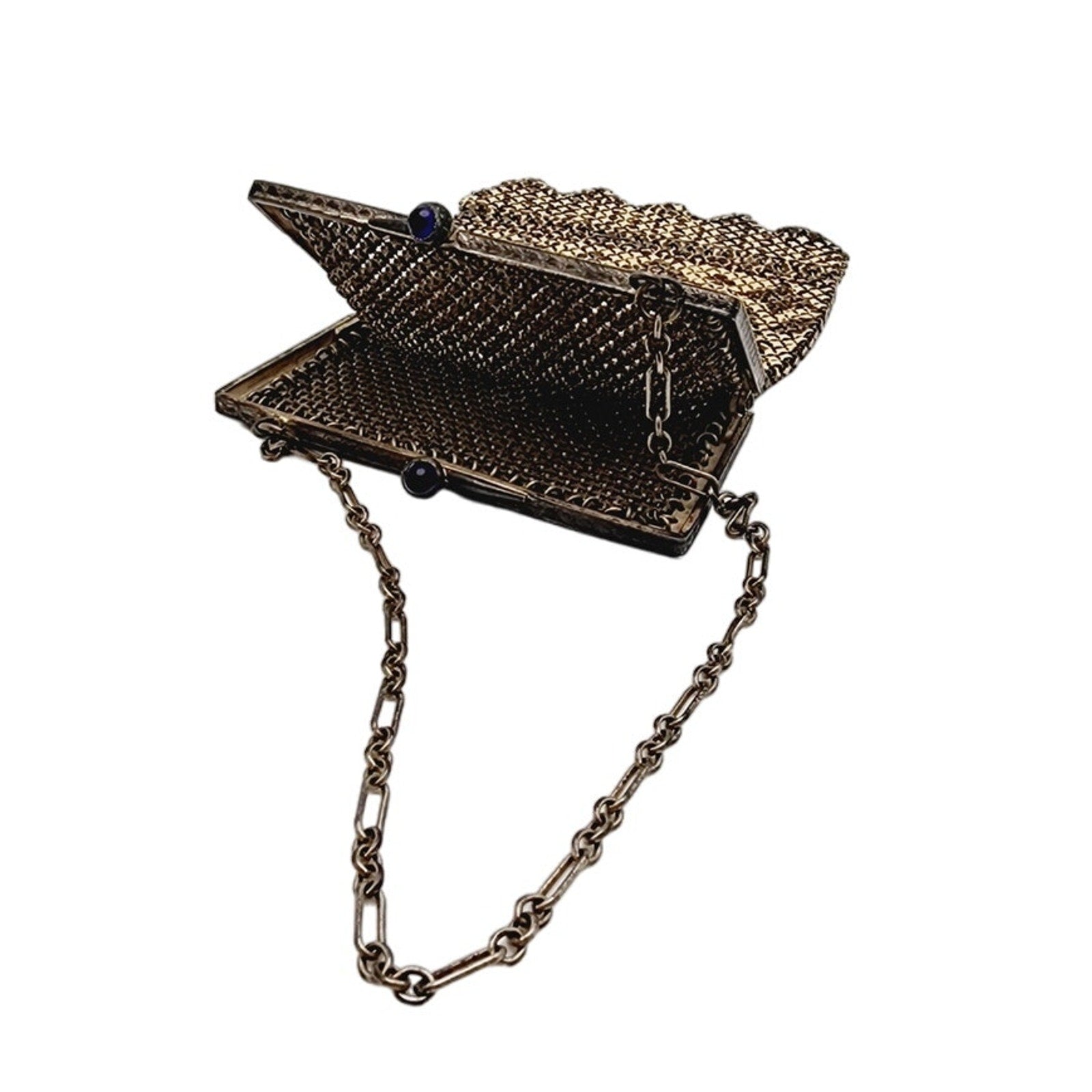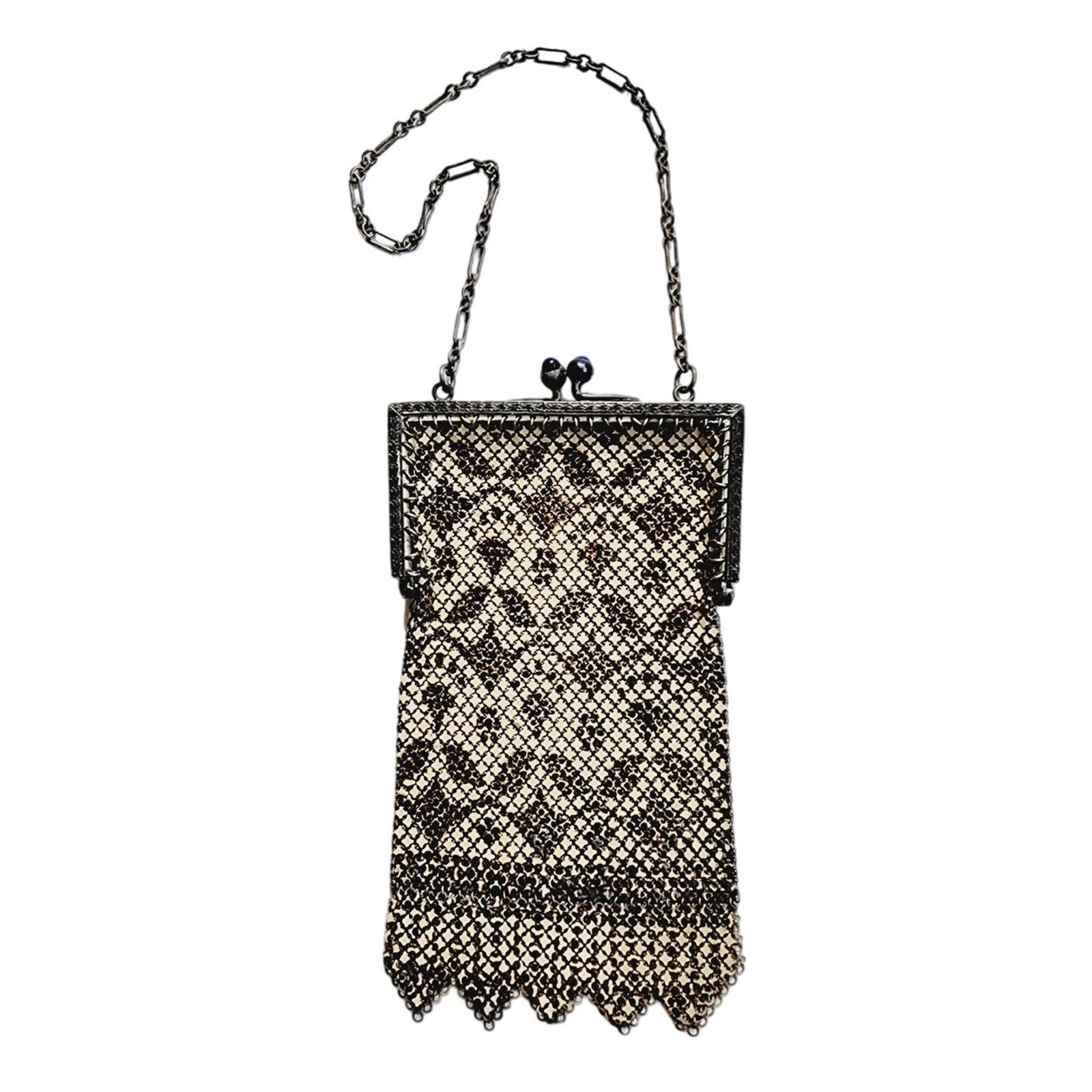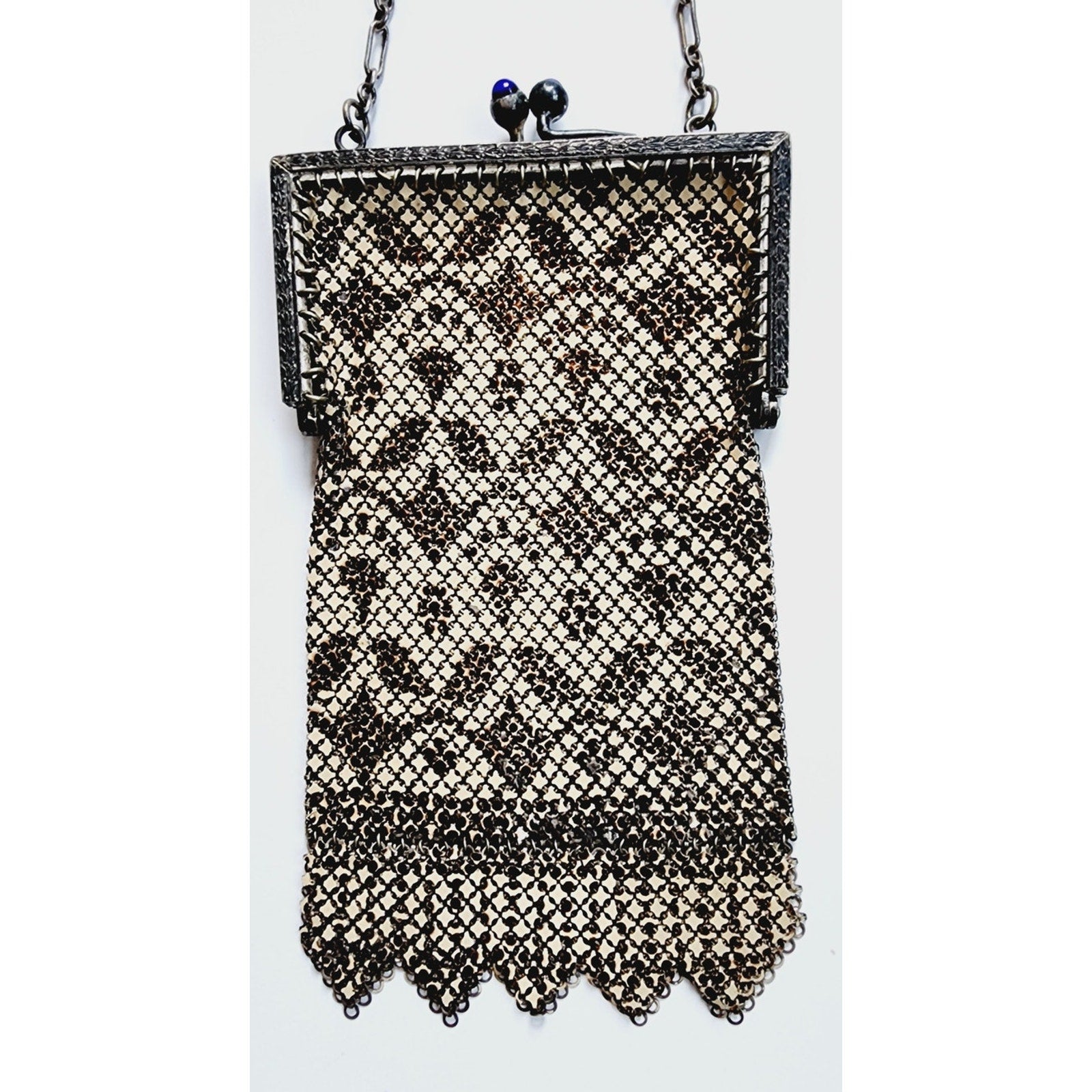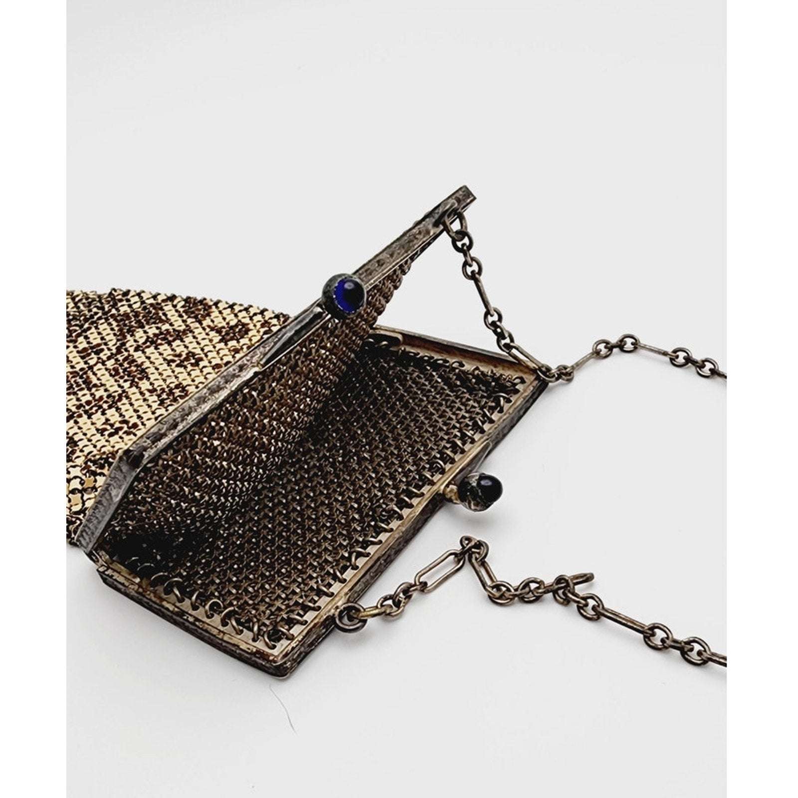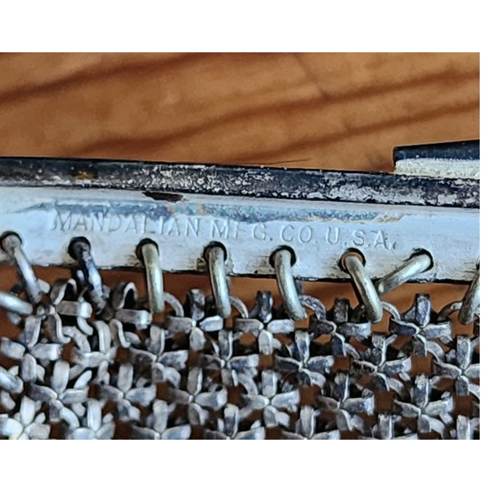 An exquisite beauty of art nouveau gorgeousness, this is a tiny little purse, perfect for one kay, one lipstick, and one credit card. Mesh body is decorated in delicate brown and beige pattern of abstract floral, with the bottom edged in a triangular pattern. Opens on a metal hinged bottom with a kiss clasp inset with glass beads. Metal, paperclip style handstrap completes the look. Interior unlined. Interior of frame is stamped with the Mandalian name.