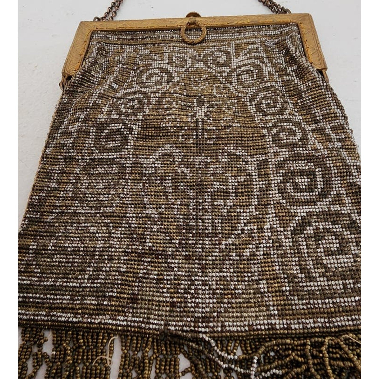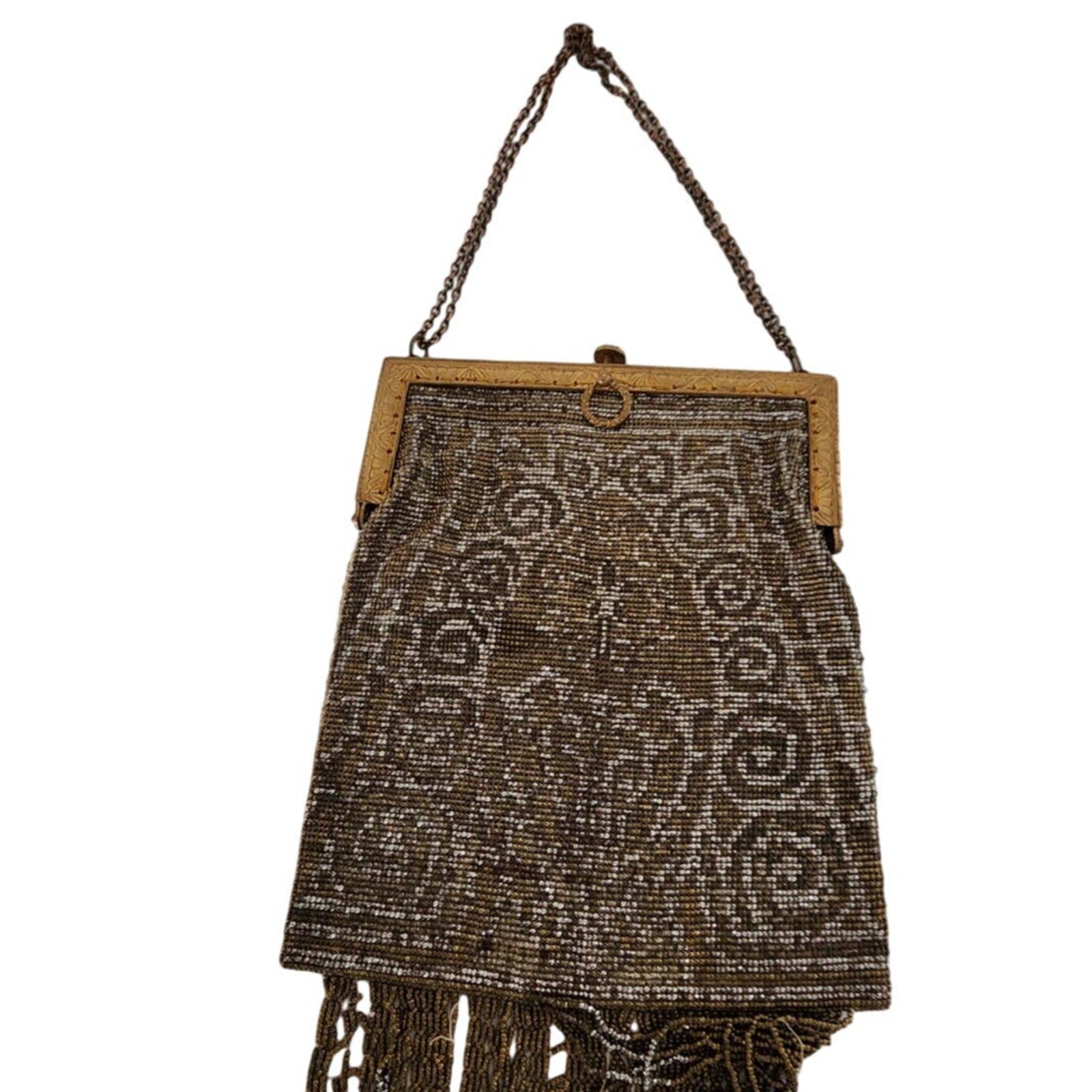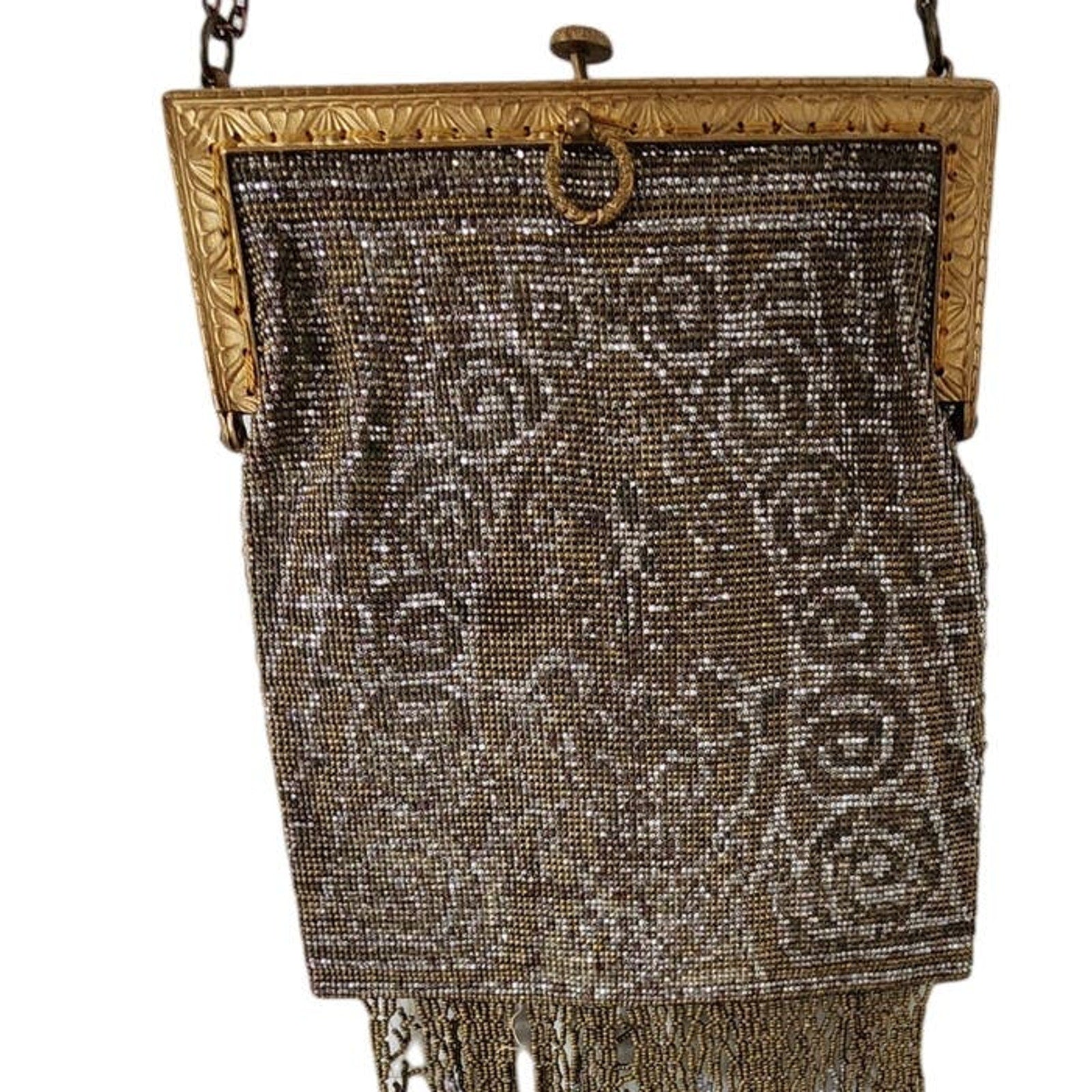 Cut steel bead purse from France, this beauty has an art nouveau design with both sides in an ornate gold and silver floral and spiral pattern (colors faded somewhat). It has a soft, sack like body and the hem is delineated in a long line of metallic fringe, sadly frayed at various points, as pictured. The metal, hinged frame has an ornate engraving and the top clasp opens when pushed down. The hand strap is a double row of chain link metal.