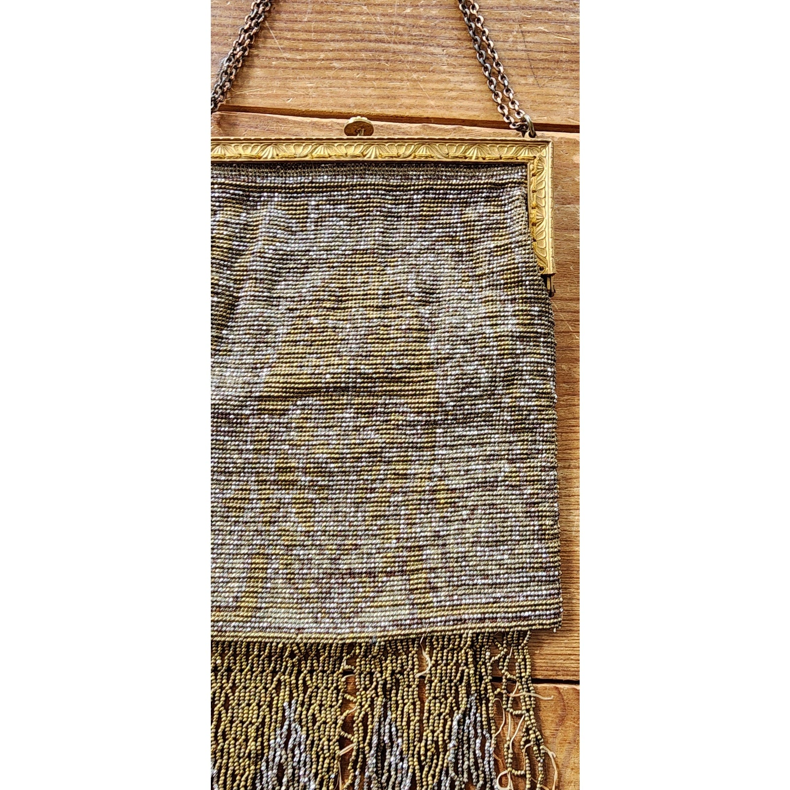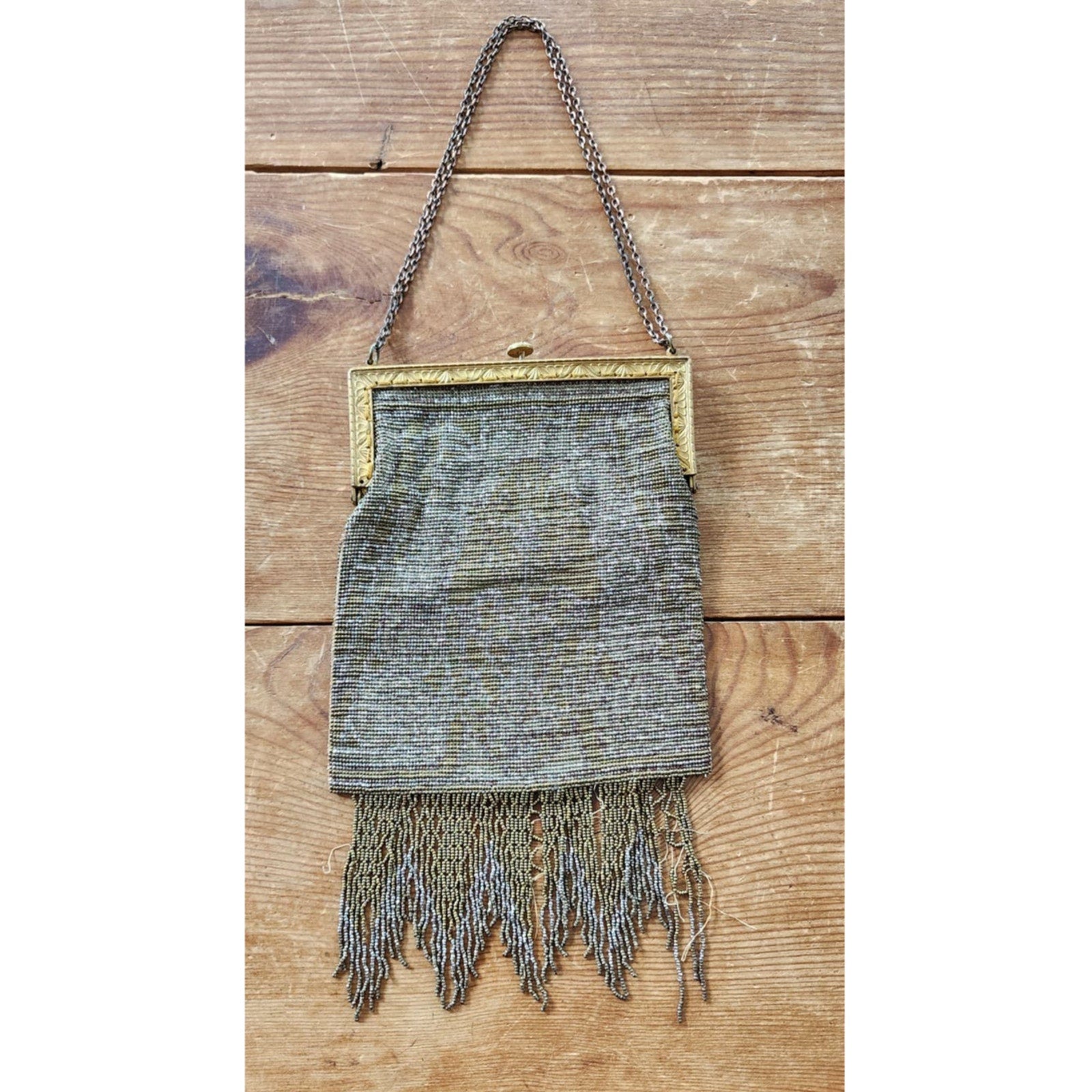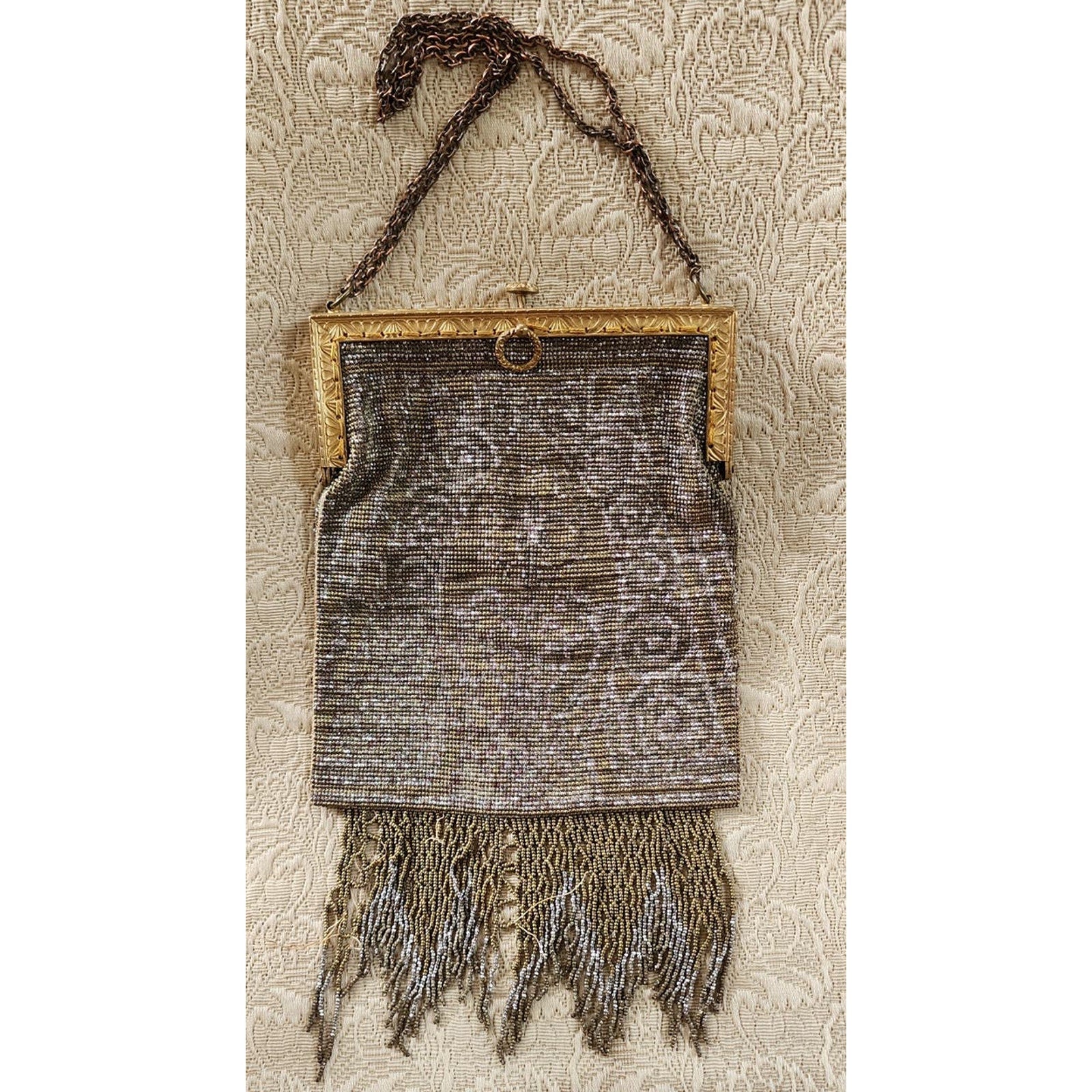 Cut steel bead purse from France, this beauty has an art nouveau design with both sides in an ornate gold and silver floral and spiral pattern (colors faded somewhat). It has a soft, sack like body and the hem is delineated in a long line of metallic fringe, sadly frayed at various points, as pictured. The metal, hinged frame has an ornate engraving and the top clasp opens when pushed down. The hand strap is a double row of chain link metal.