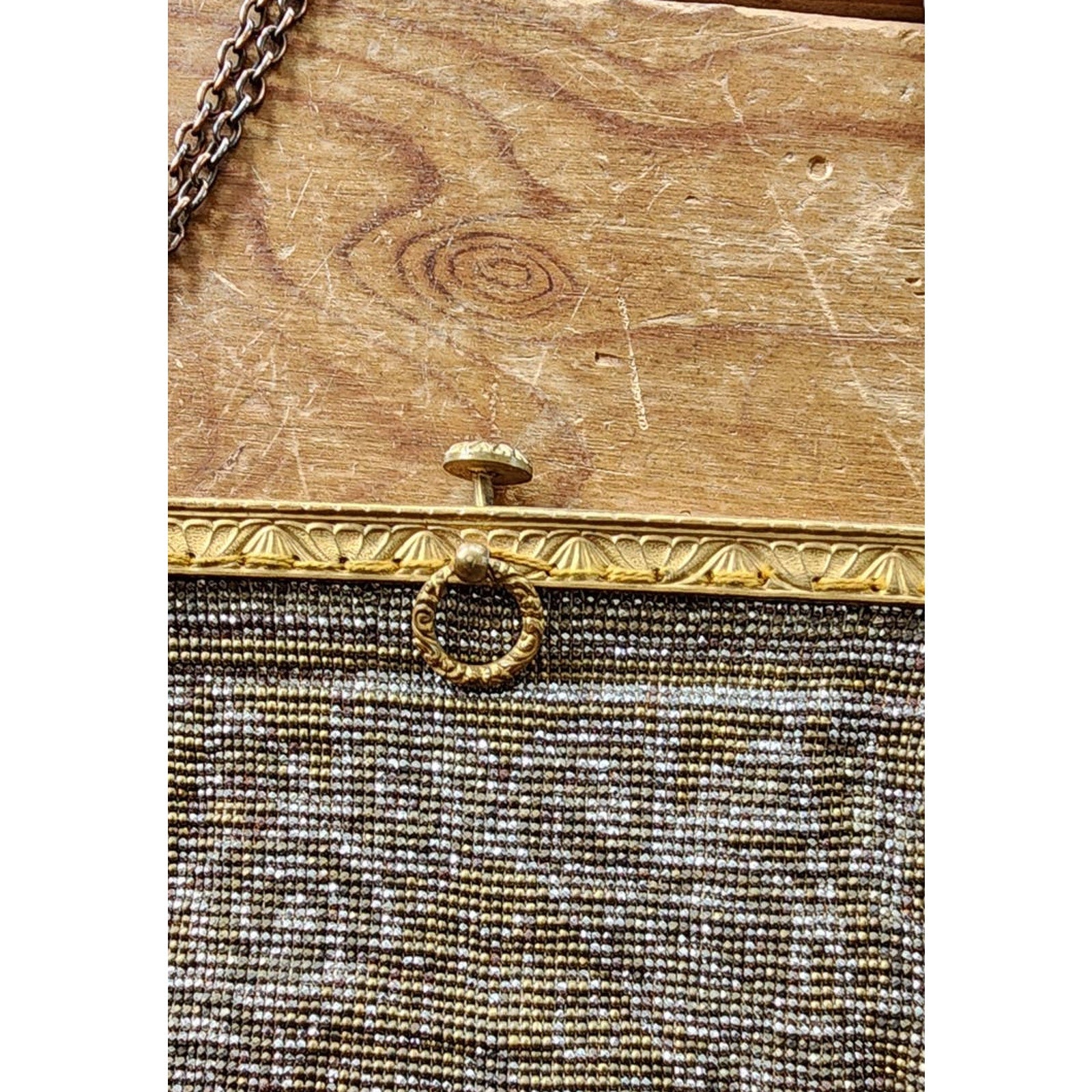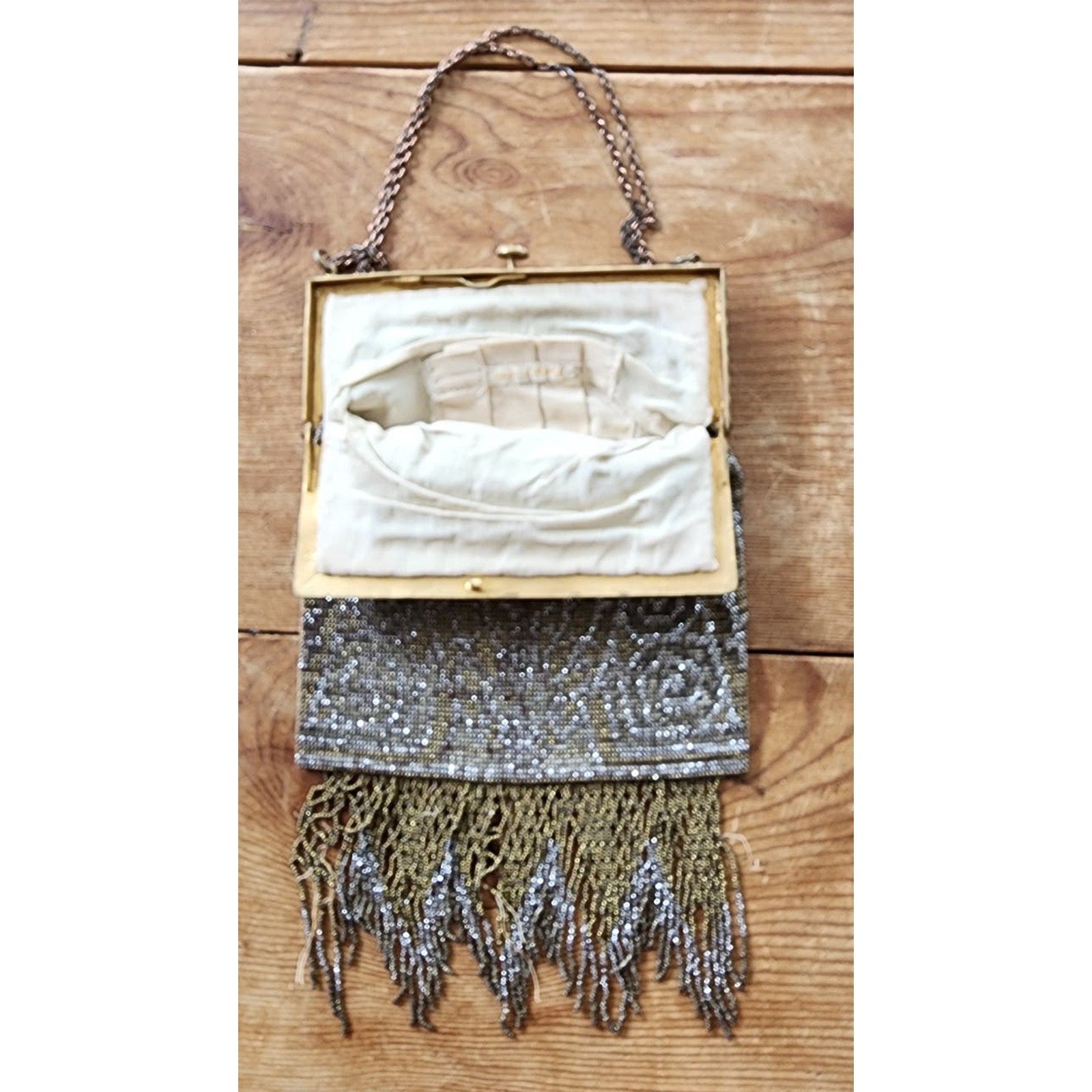 Condition: chain straps need cleaning and the fringe at bottom is frayed. Otherwise, clean with an intact interior in cream cloth.