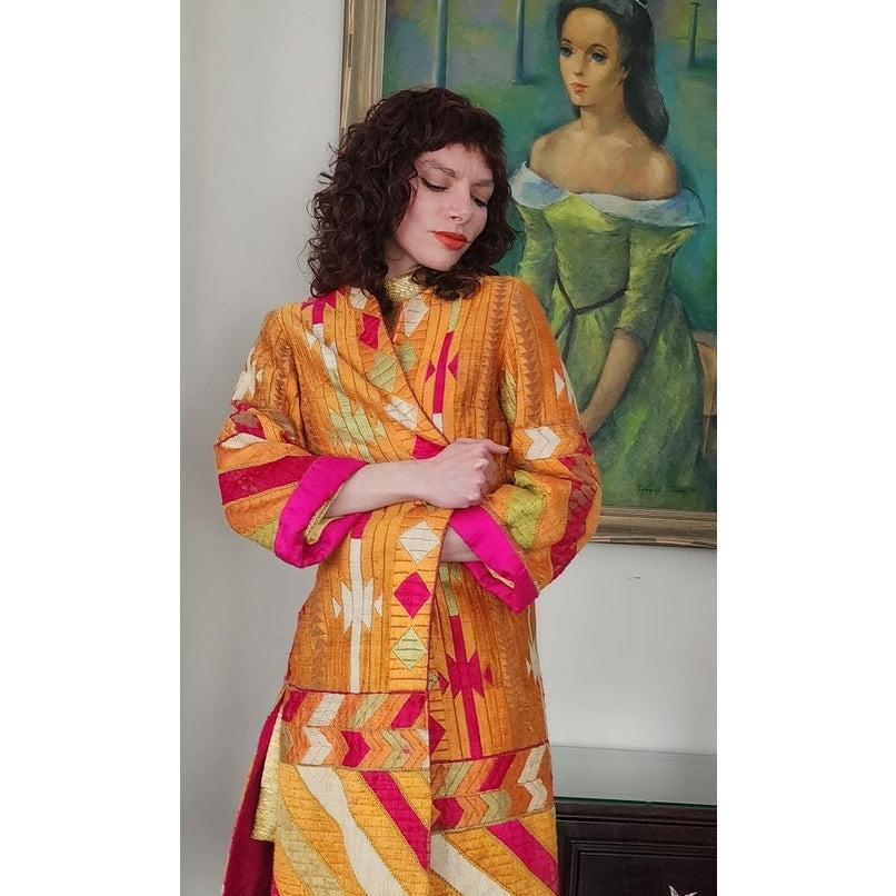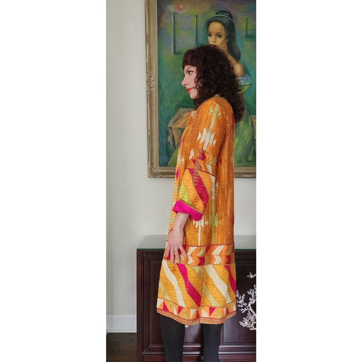 Stunning handmade piece that is difficult to date. Collarless and cut in a slight A line, it has meticulous silk thread patterning throughout in a series of geometric shapes and bands, with a folk/ethnic quality. Shades of gold, fushcia, white and green dominate. Three quarters length sleeves have upturned cuffs. No pockets. No closure. Major visual statement! No tags.