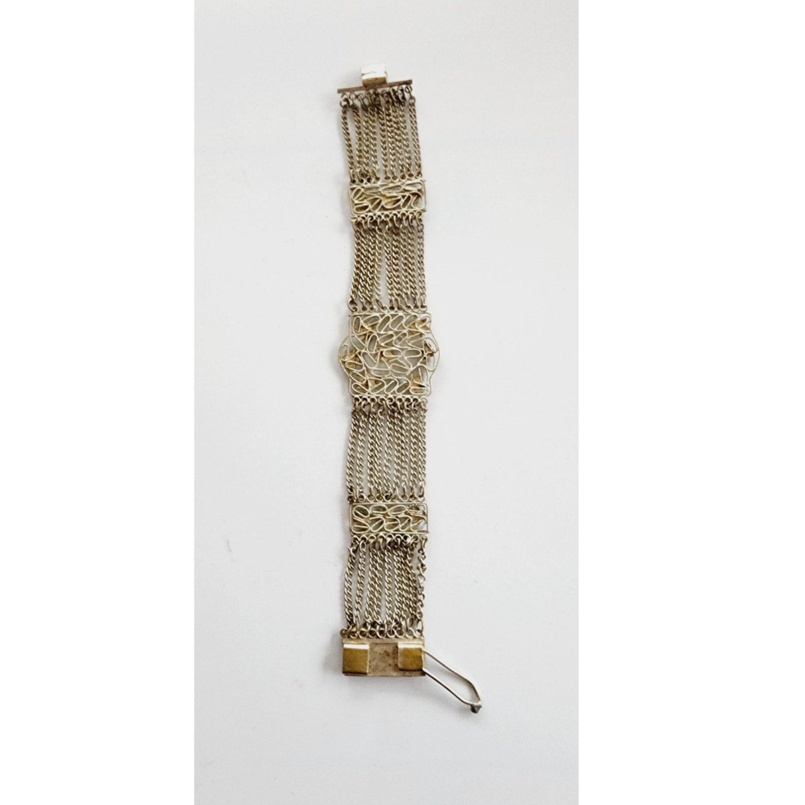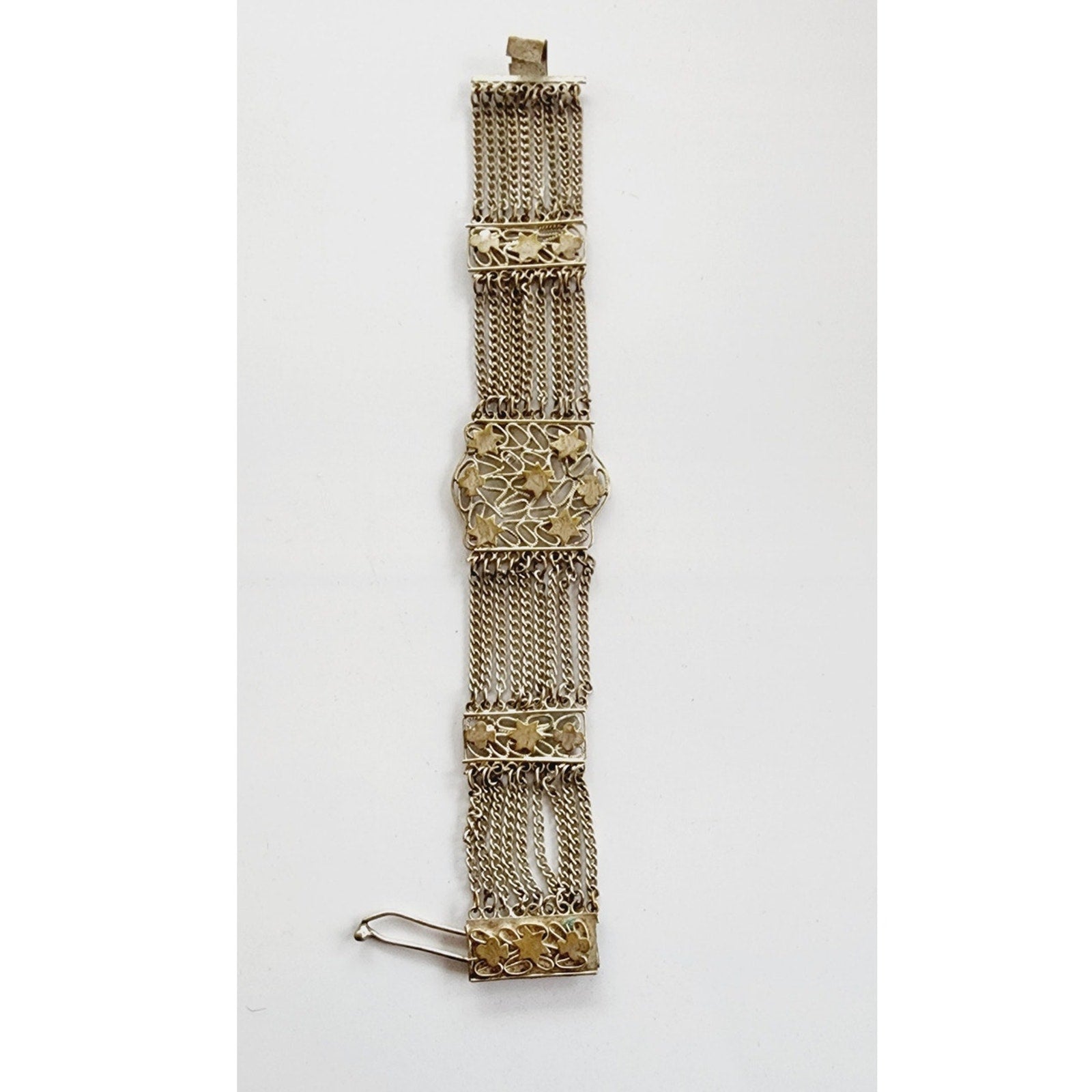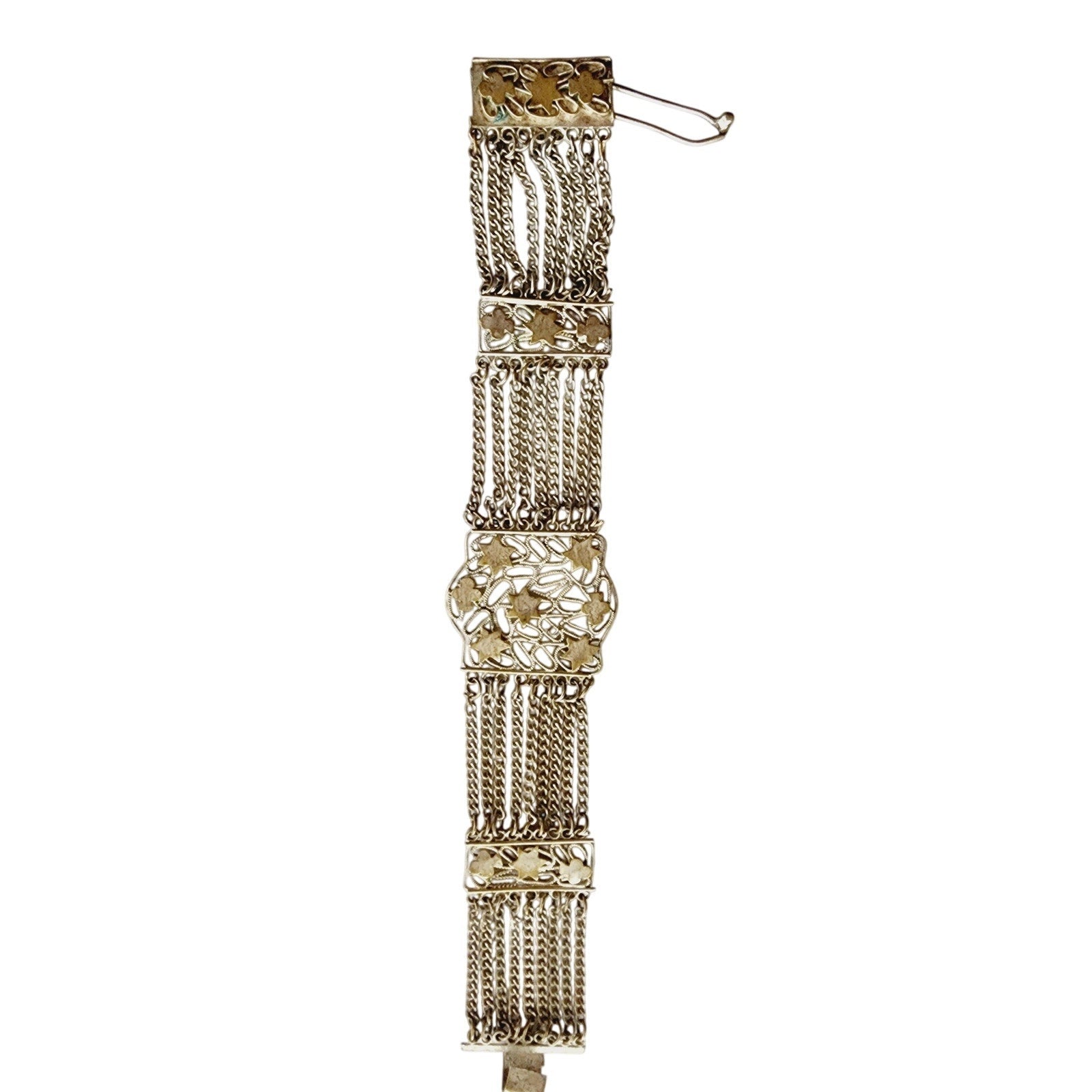 Incredible bracelet featuring a body of 9 rows of delicate chain link, with the sides offset by vertical pattern of clovers and six pointed stars. Central section is a large panel of these shapes, connected by a web if swirling filigree. Interesting, interlocking closure completes the look. No stamps.