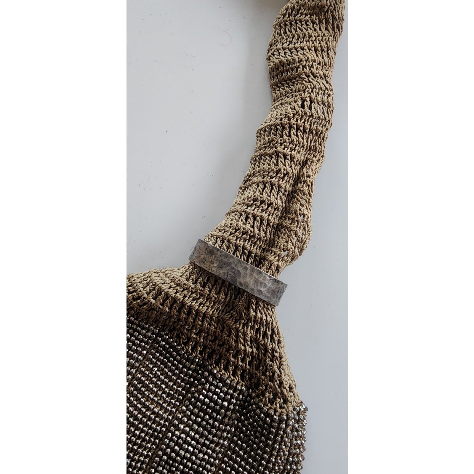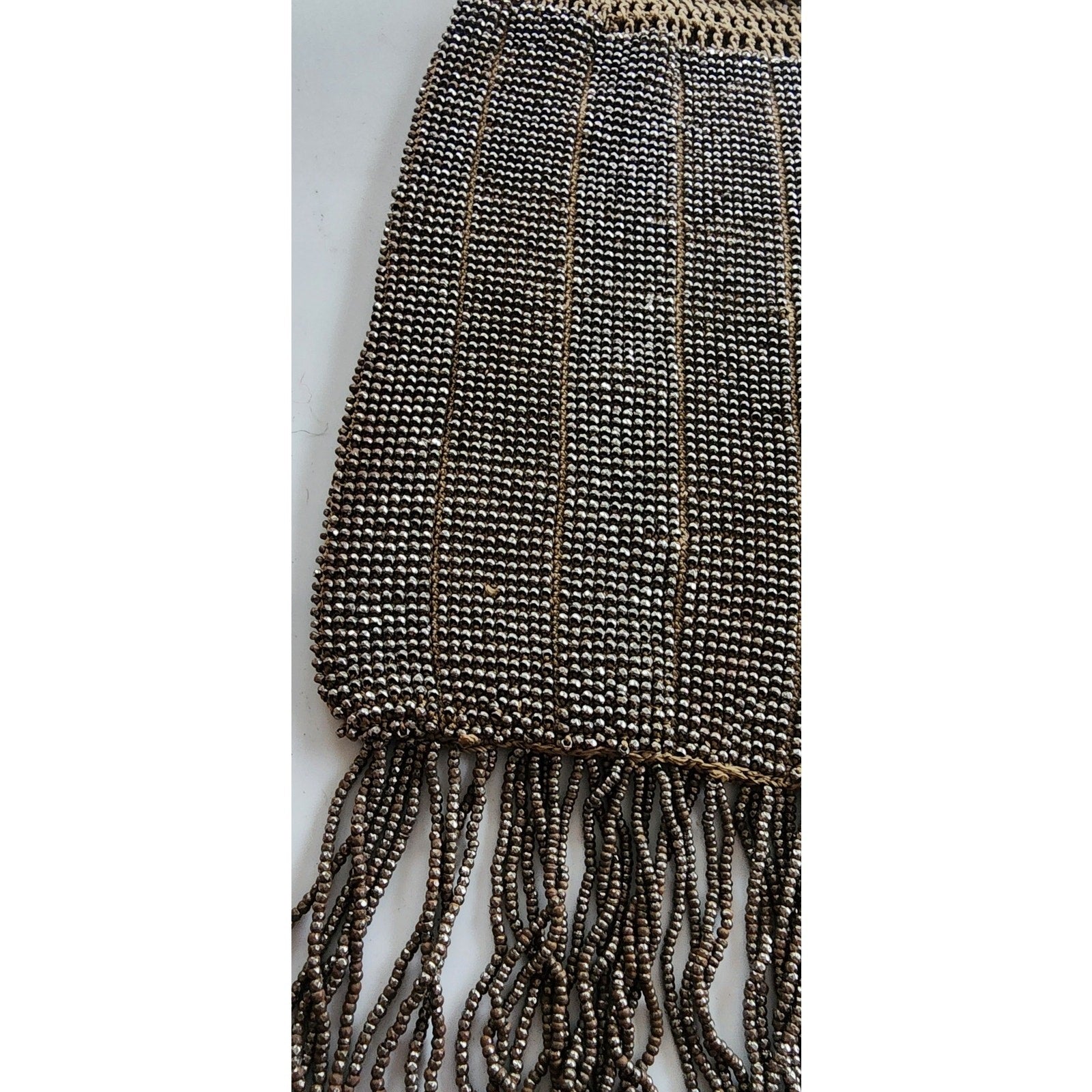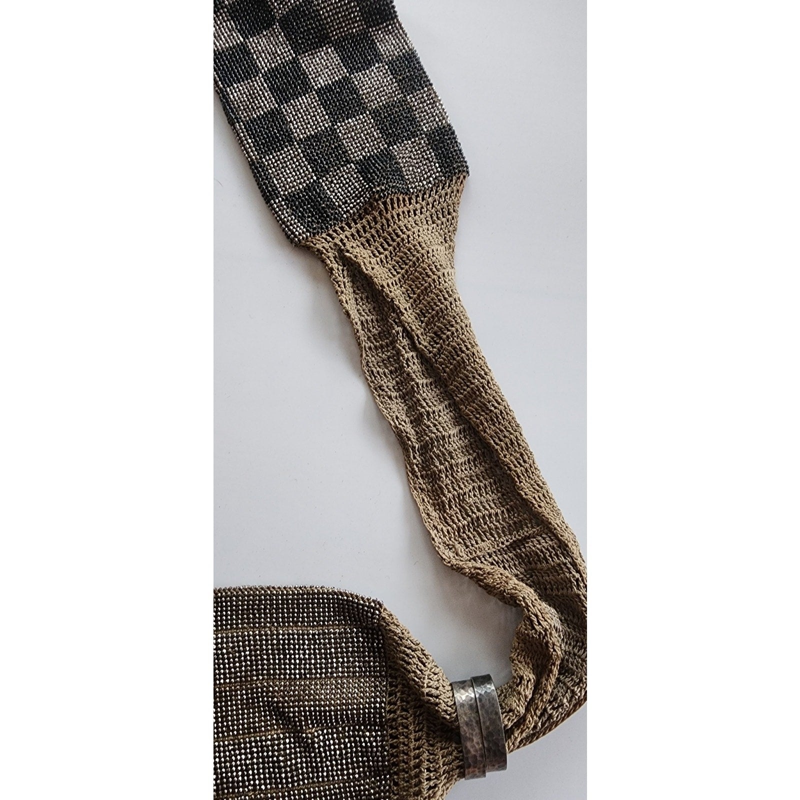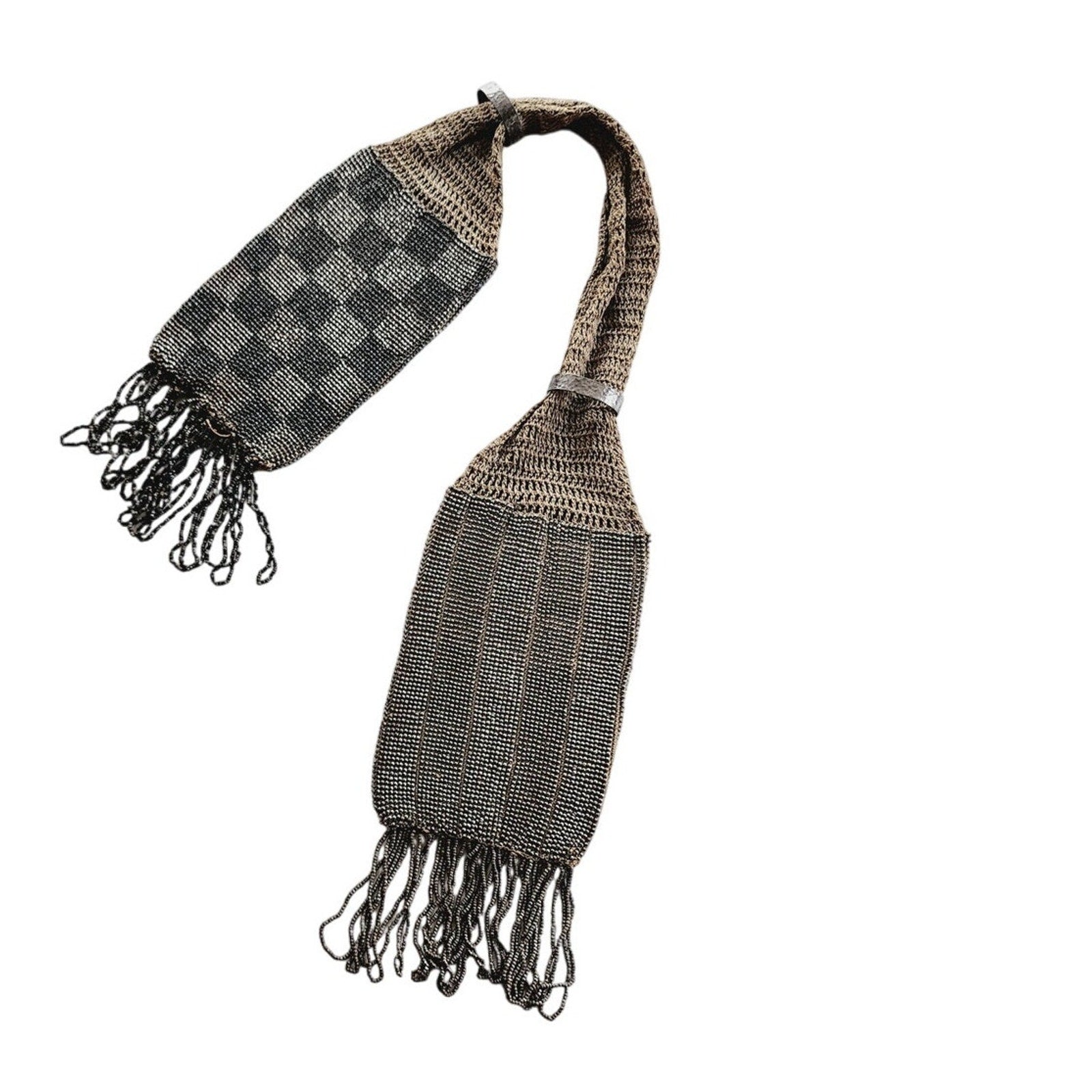 Double sided miser bag that has a long and narrow central section in gray crocheted silk, with each side being a steel beaded pouch with fringed loops at the bottoms. One side is checkerboard and the other is banded. The middle "neck" section has a slit and the two rings on either side slide up and down for closure.