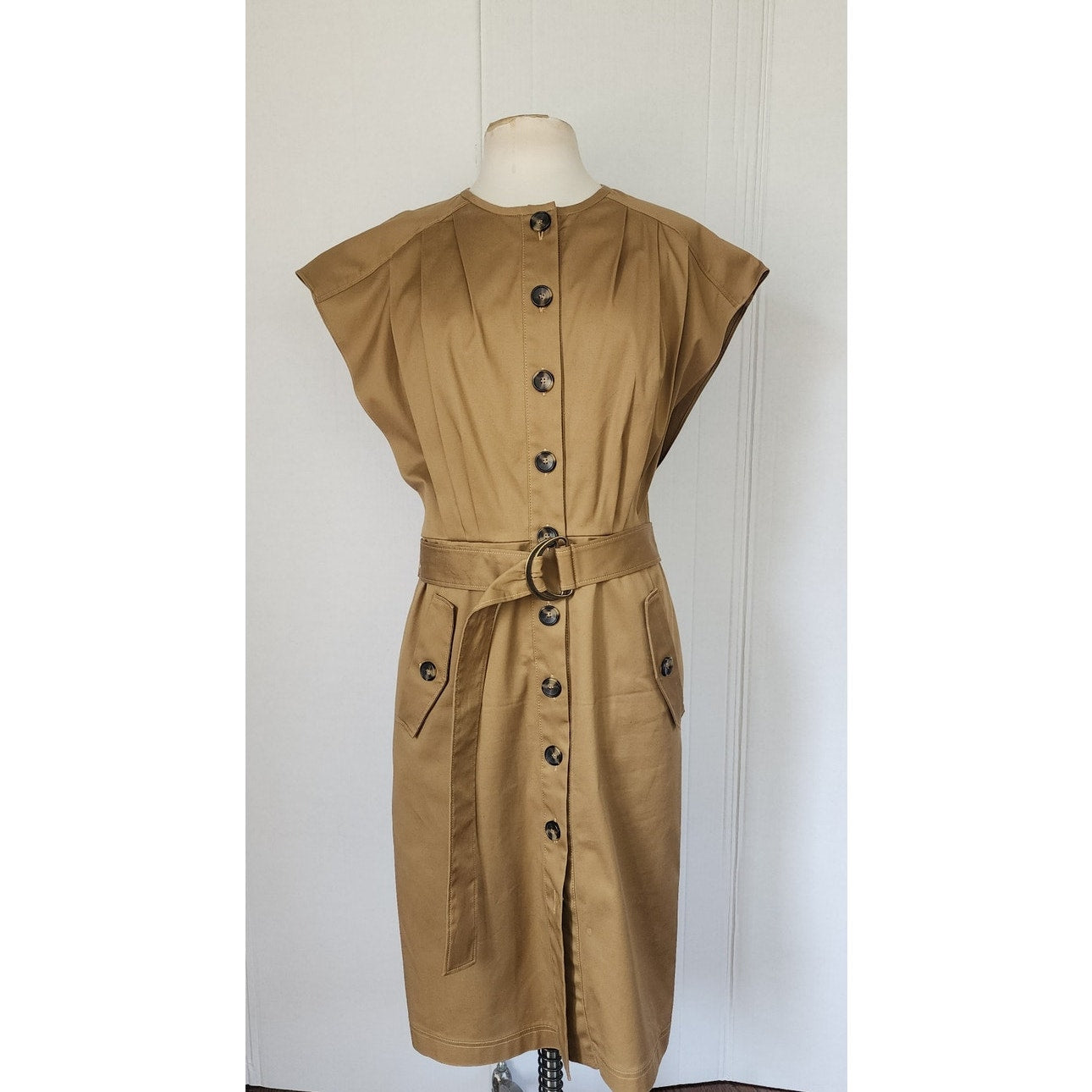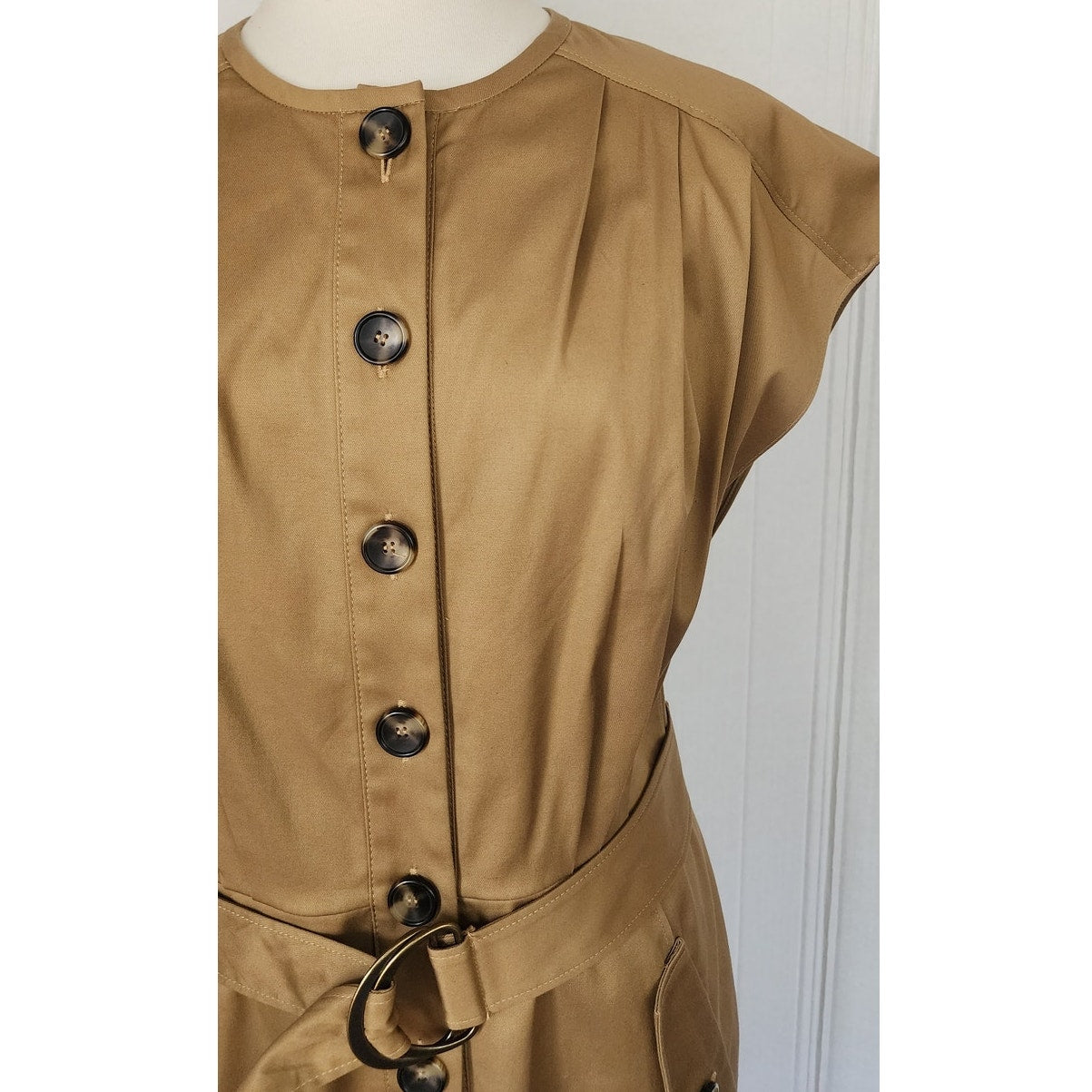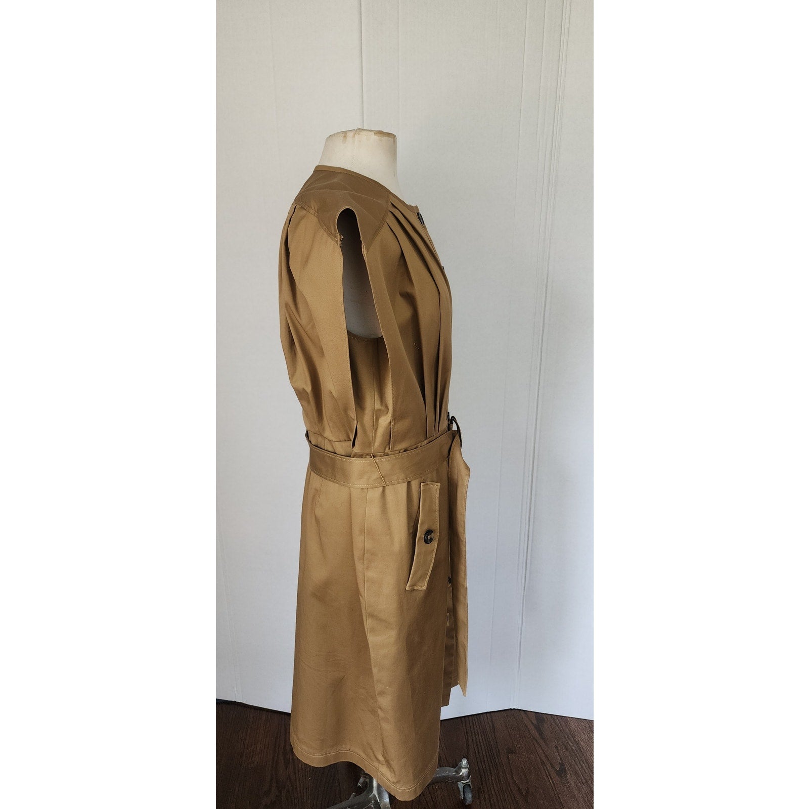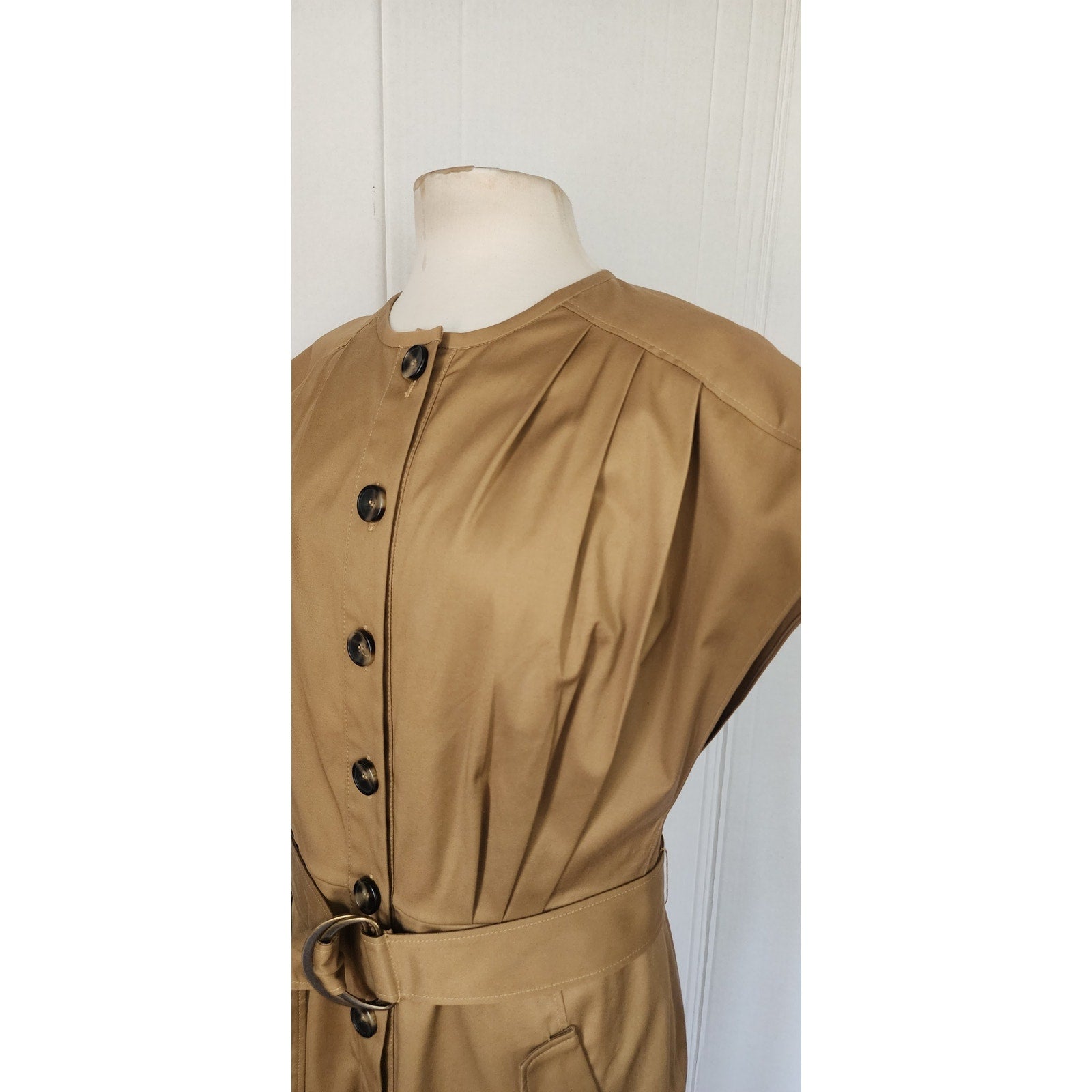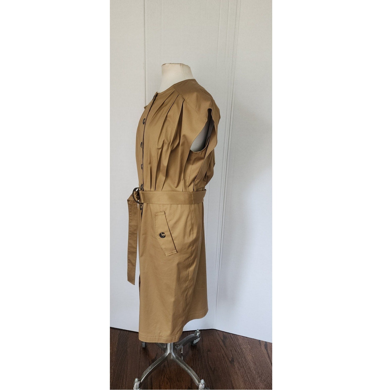From the resort 2022 collection. Capped sleeves, button down front, matching sash belt with adjustable buckle. Button flap pockets at the hips. Lined torso. Pleated chest detailing. Crisp tailoring/timeless style. UNWORN