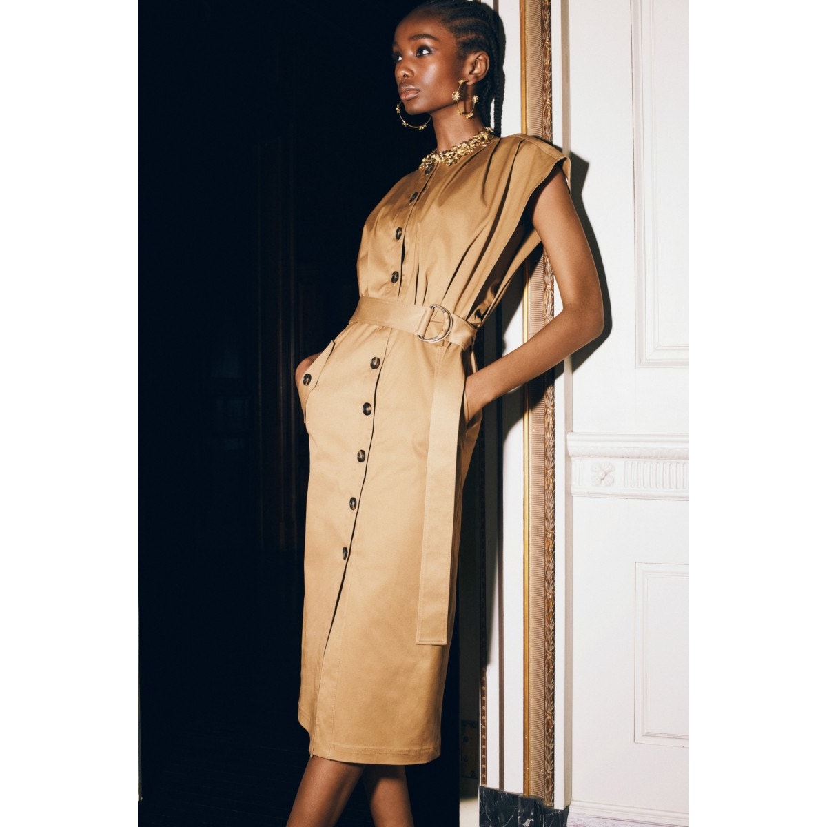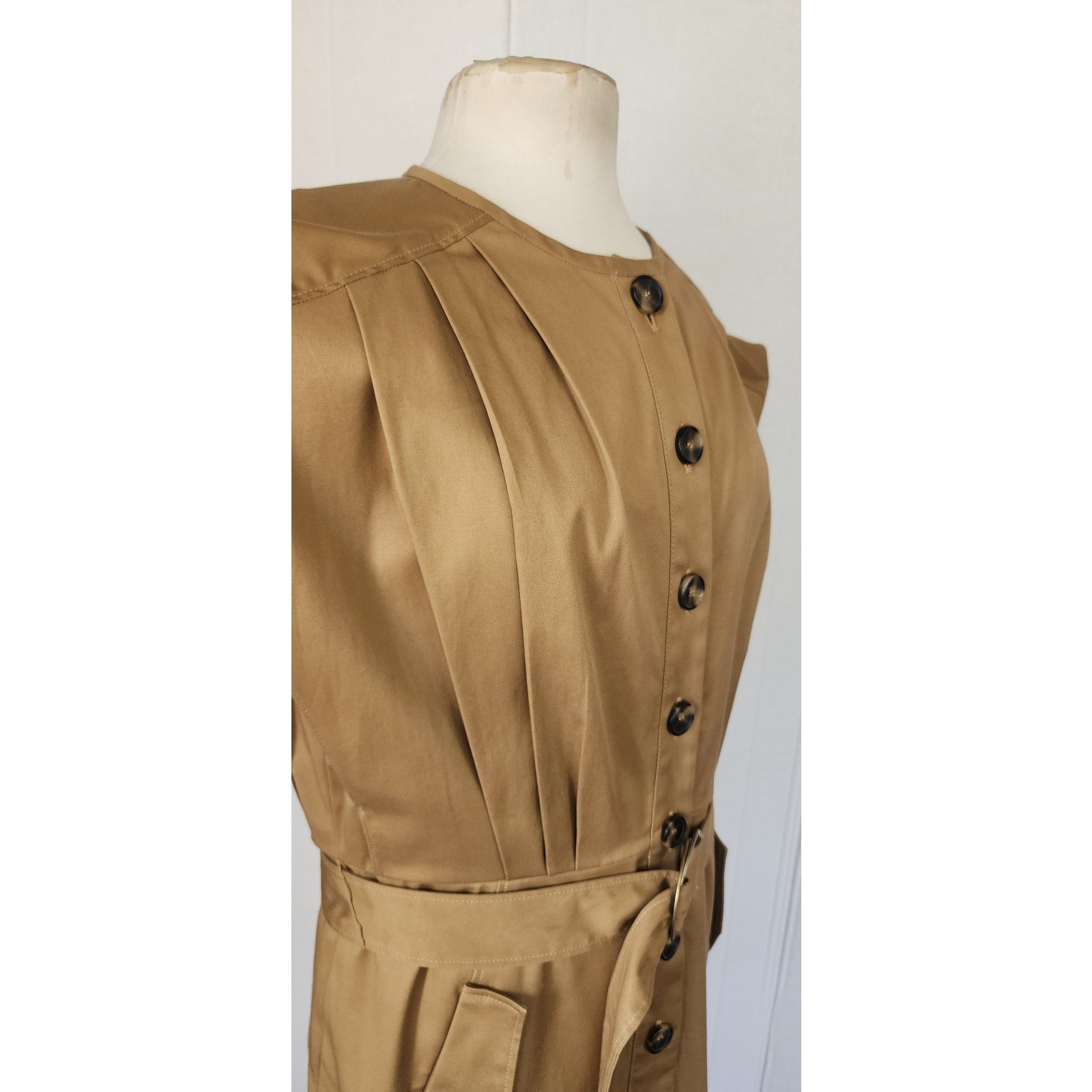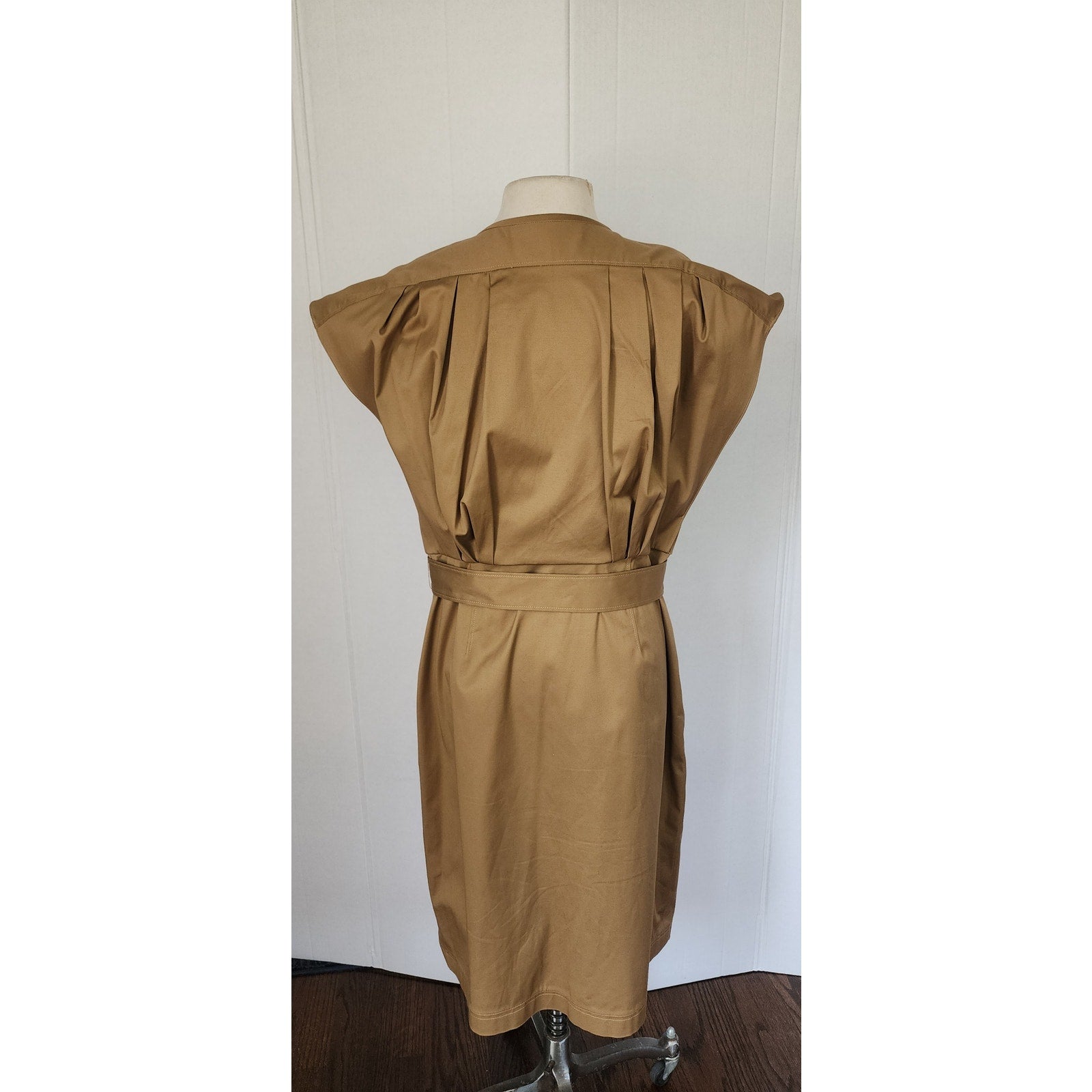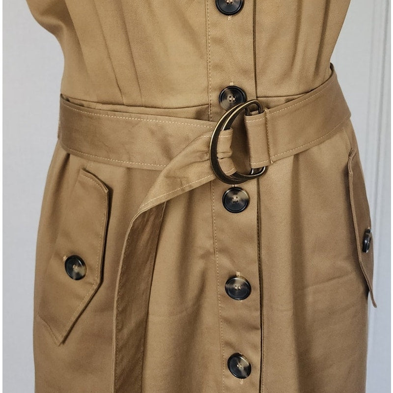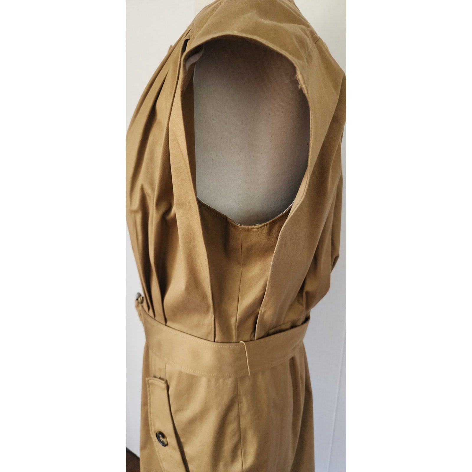 From the resort 2022 collection. Capped sleeves, button down front, matching sash belt with adjustable buckle. Button flap pockets at the hips. Lined torso. Pleated chest detailing. Crisp tailoring/timeless style. UNWORN