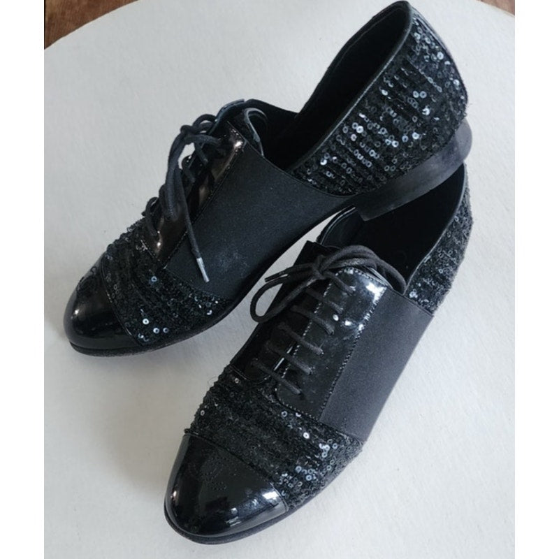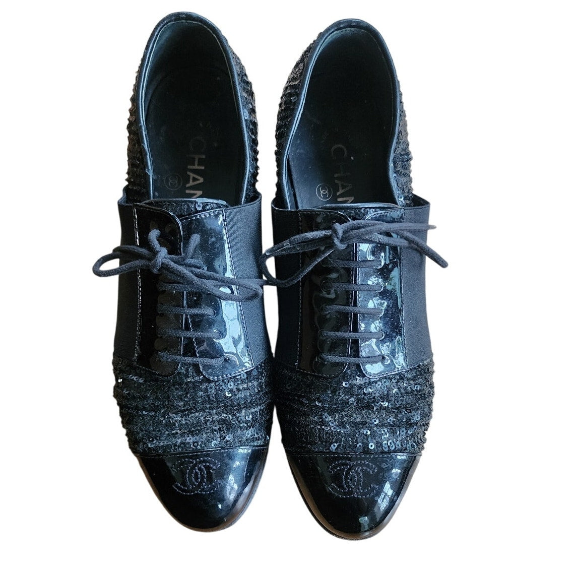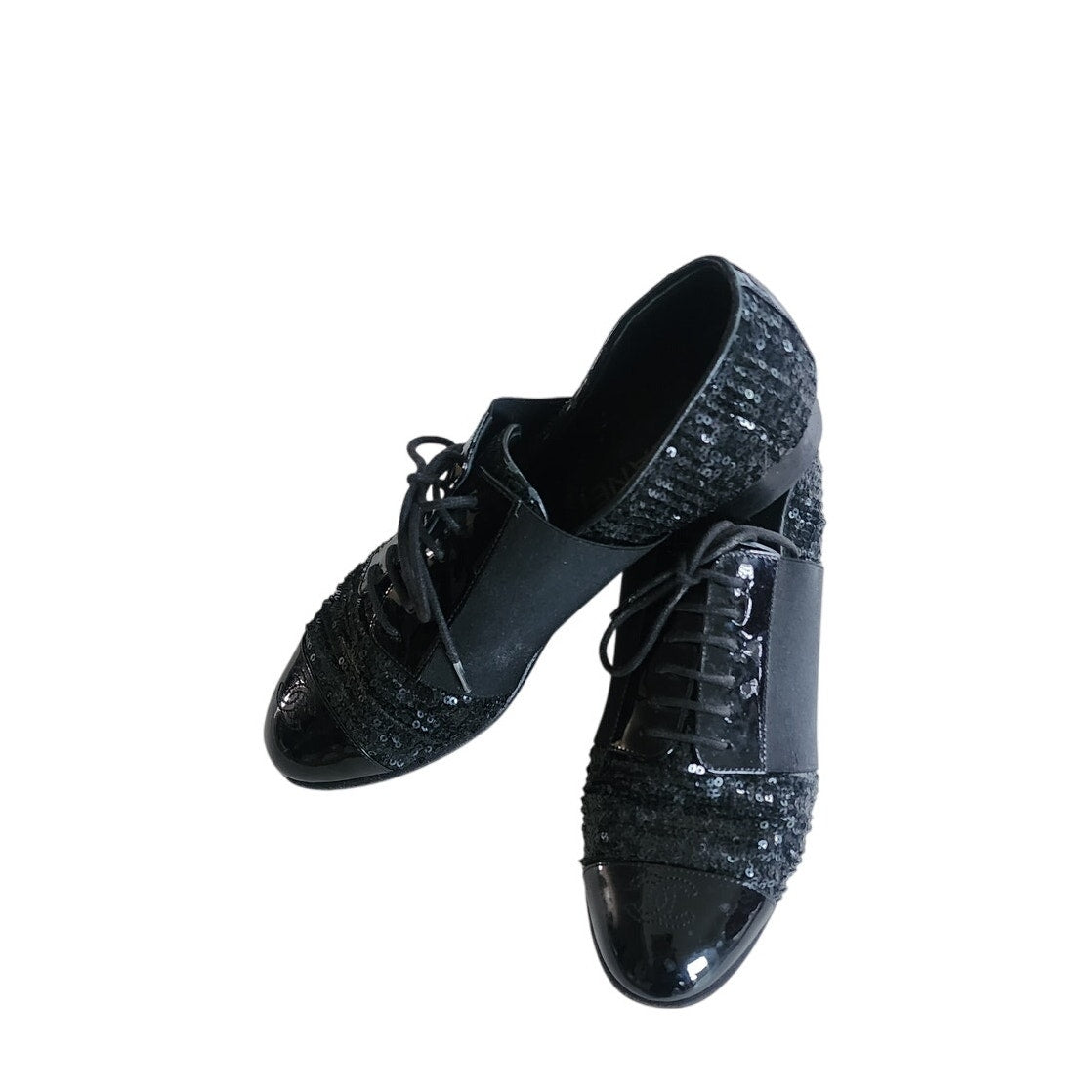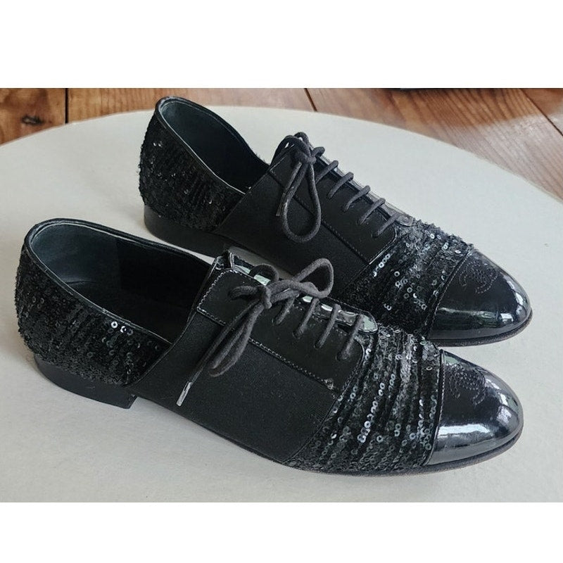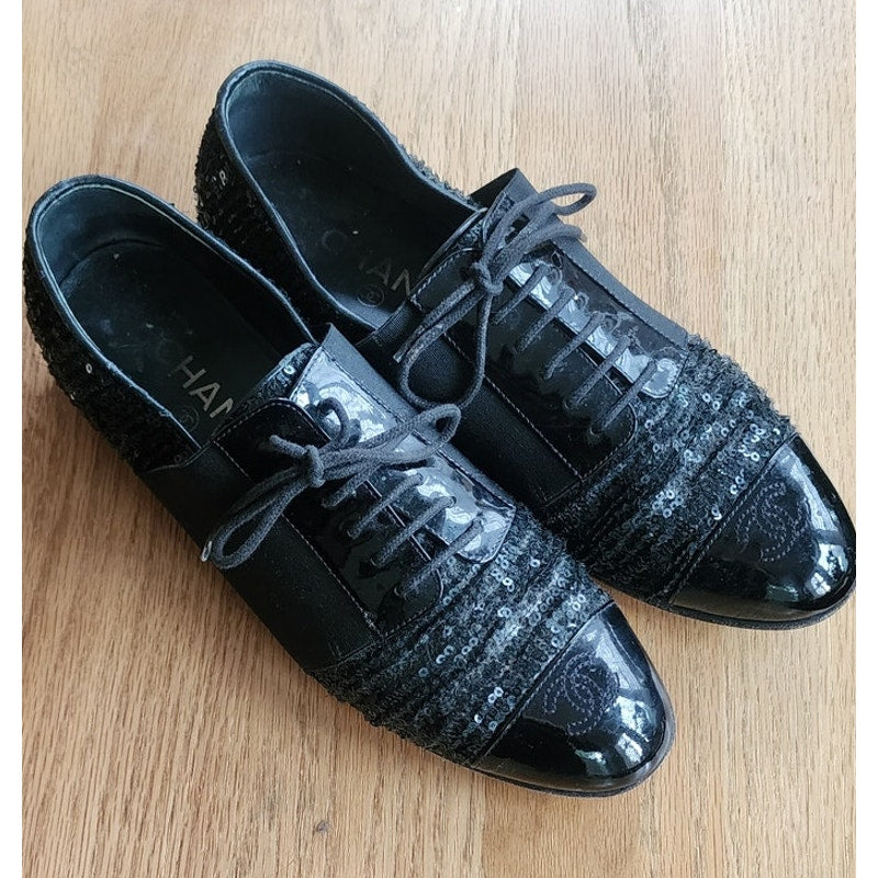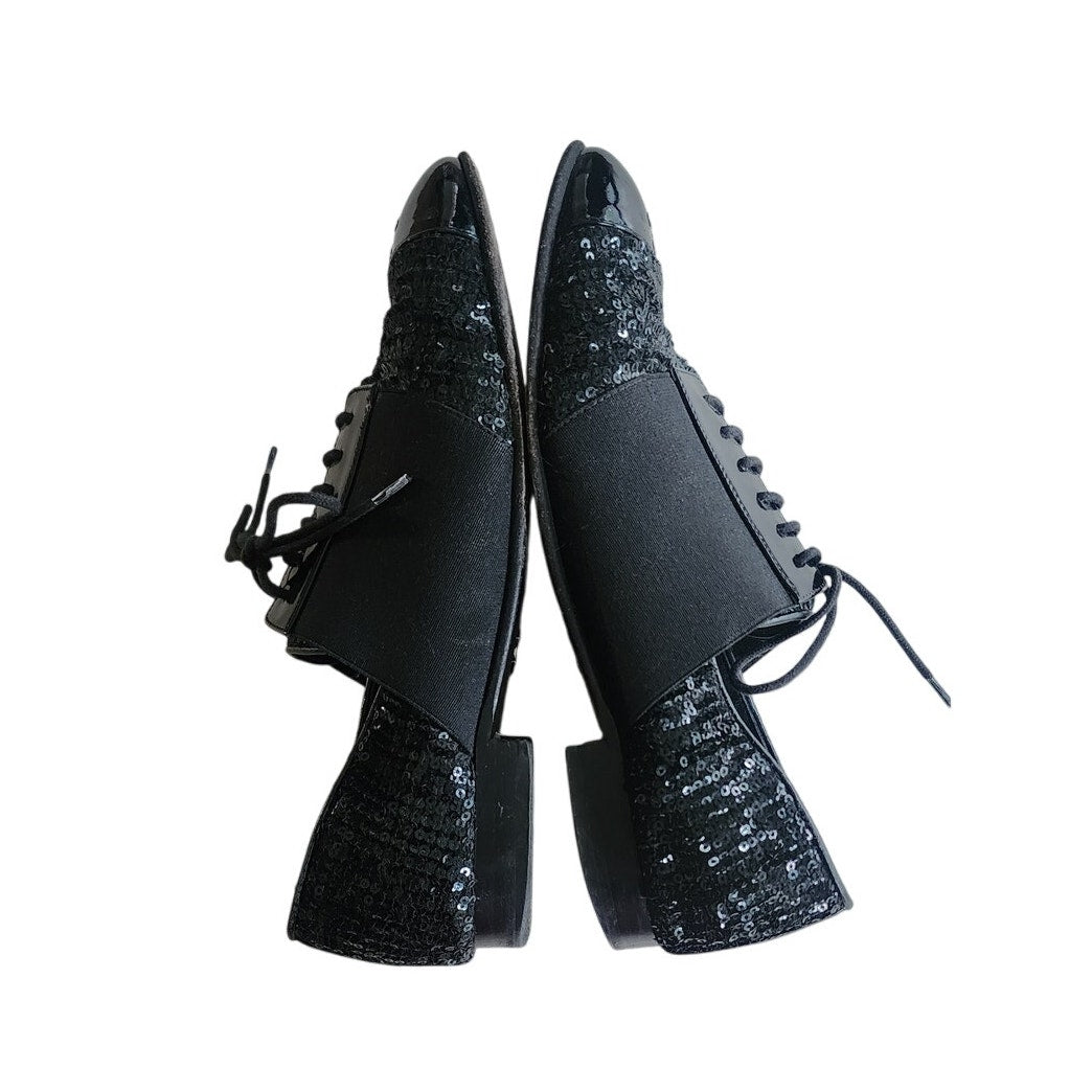 CHANEL Lace Up Shoes Loafers Black Patent Leather & Sequins 38 1/2