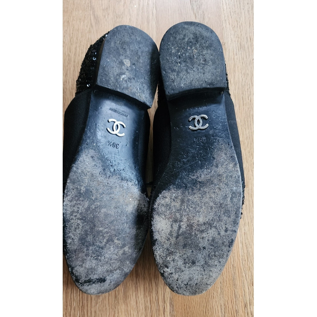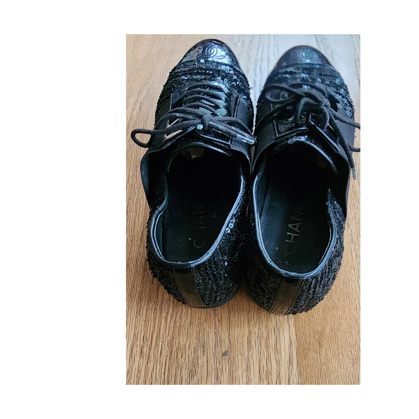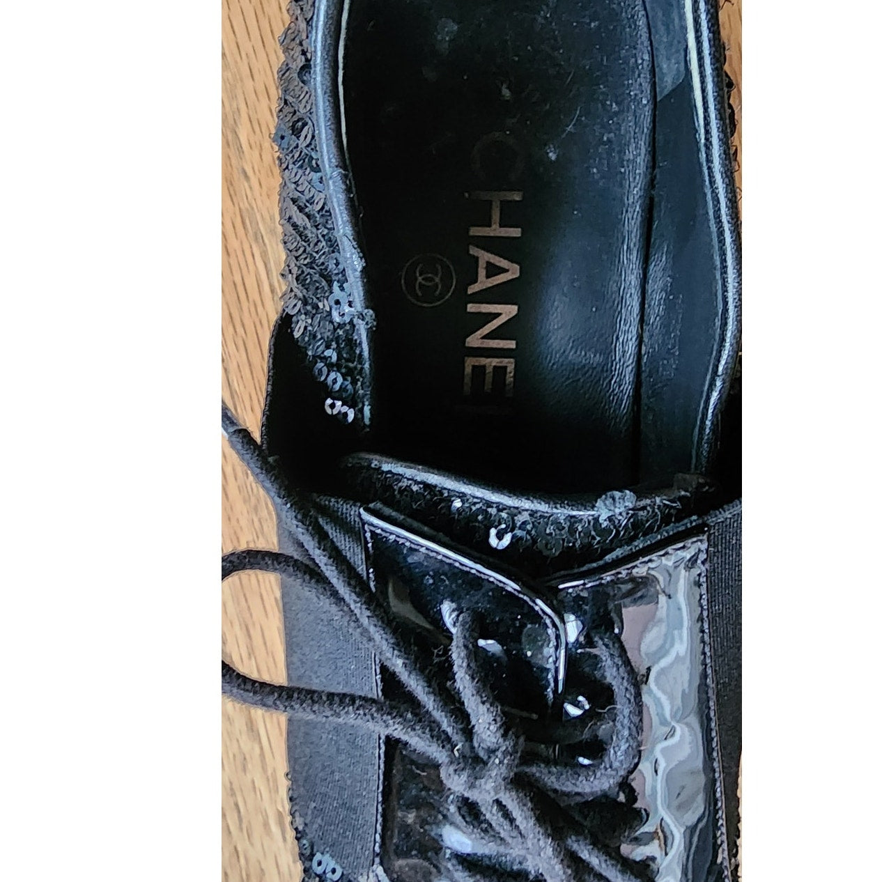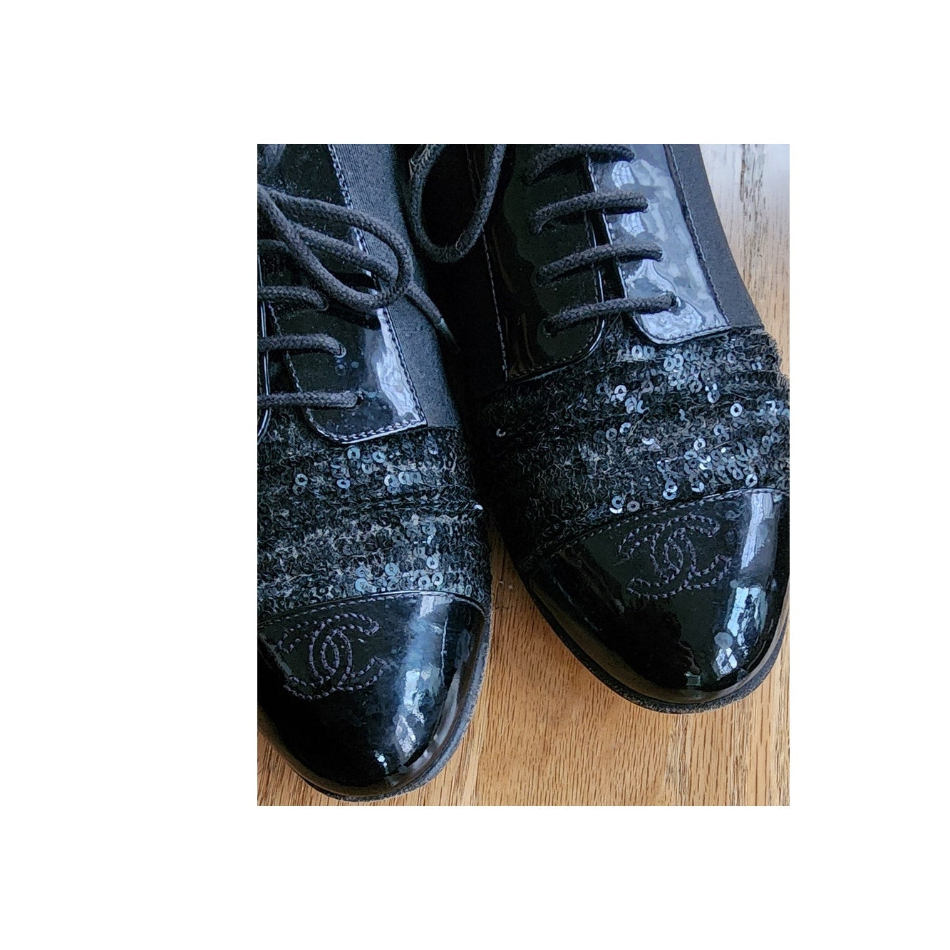 CHANEL Lace Up Shoes Loafers Black Patent Leather & Sequins 38 1/2