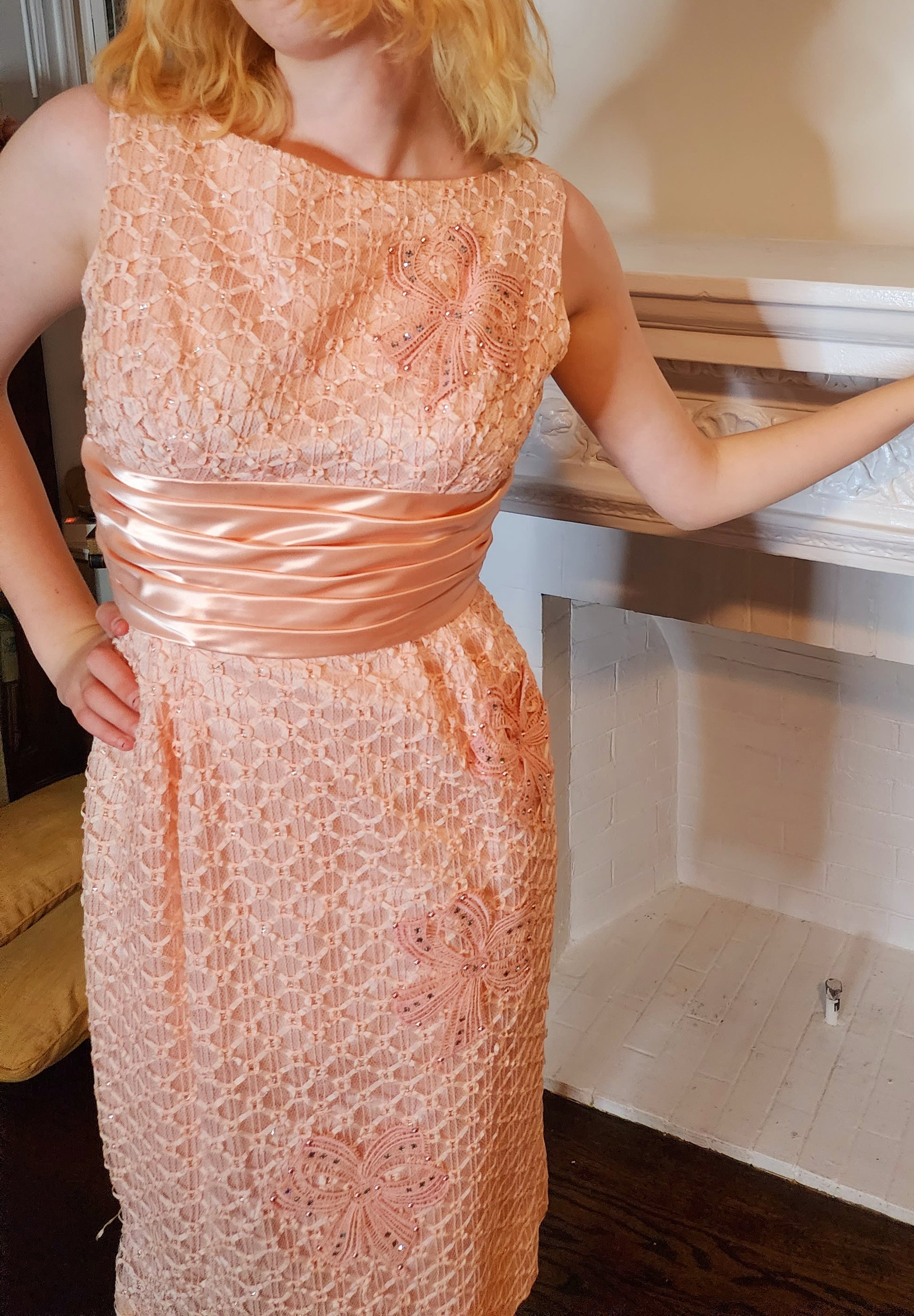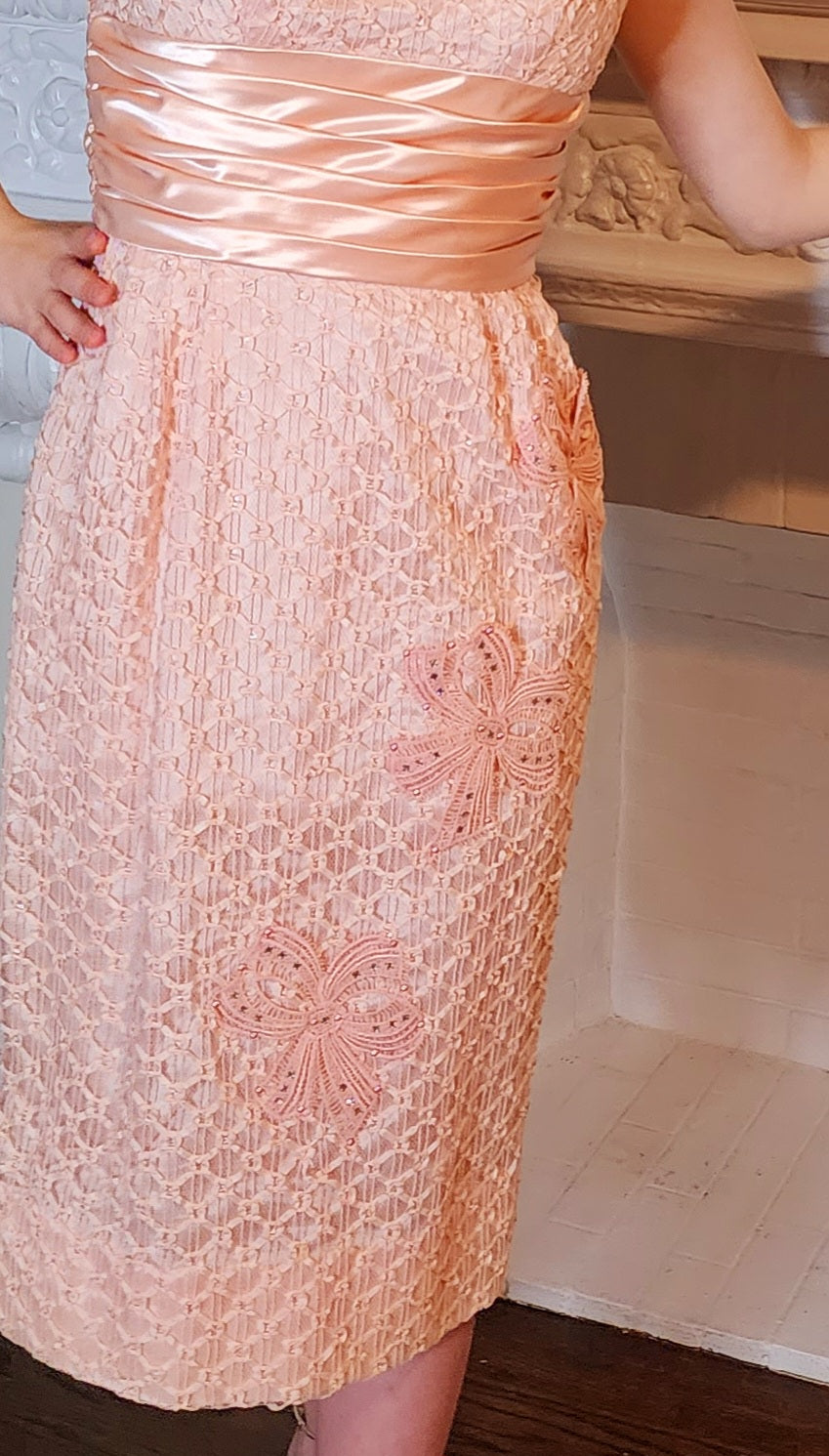 Sleeveless cocktail dress in peachy pink satin with a layer of mesh fabric mixed with criss-cross lattice design created out of matching, satin ribbon, offset with tiny, clear rhinestones. High, cowl neckline, wide shoulder straps, a fitted chest, nipped waist and a skirt cut straight down the middle create the silhouette. The waist is accented with a large panel of pleated satin, in matching pink. The left chest and left side of skirt feature crocheted bows contrasting with smoky gray rhinestones!  Fully lined on the interior, it closes with a zipper down the center of the back.
