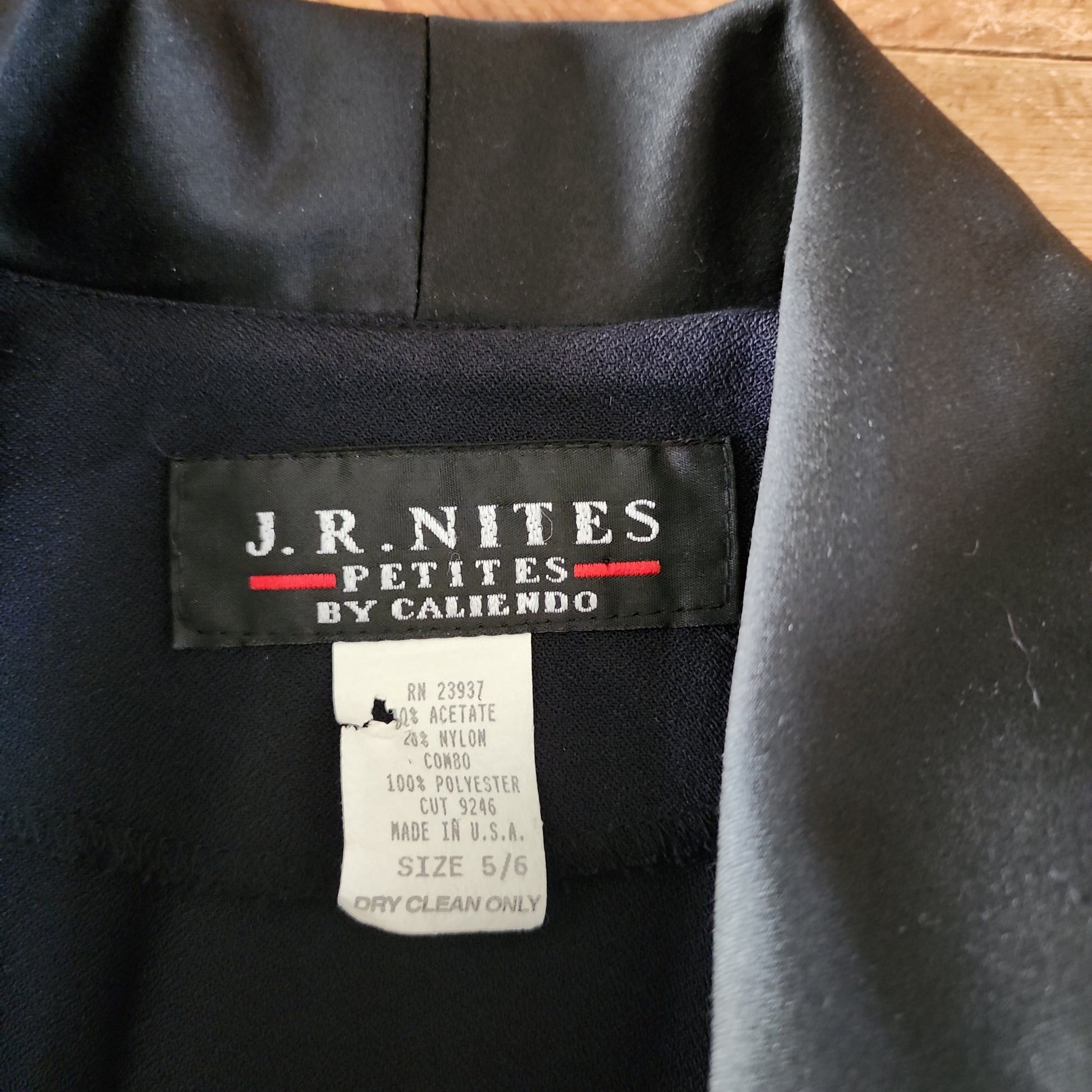 Slick and sleek outfit perfect for a night out. Features long, sheer sleeves with satin cuffs that button with elaborate gold and faux pearl. Shawl collar is also in matching satin and cross diagonally across the torso, ending at the side waist where there is a button closure. There is a zipper at center front as well, behind the pleats. Slit pockets at each hip front.