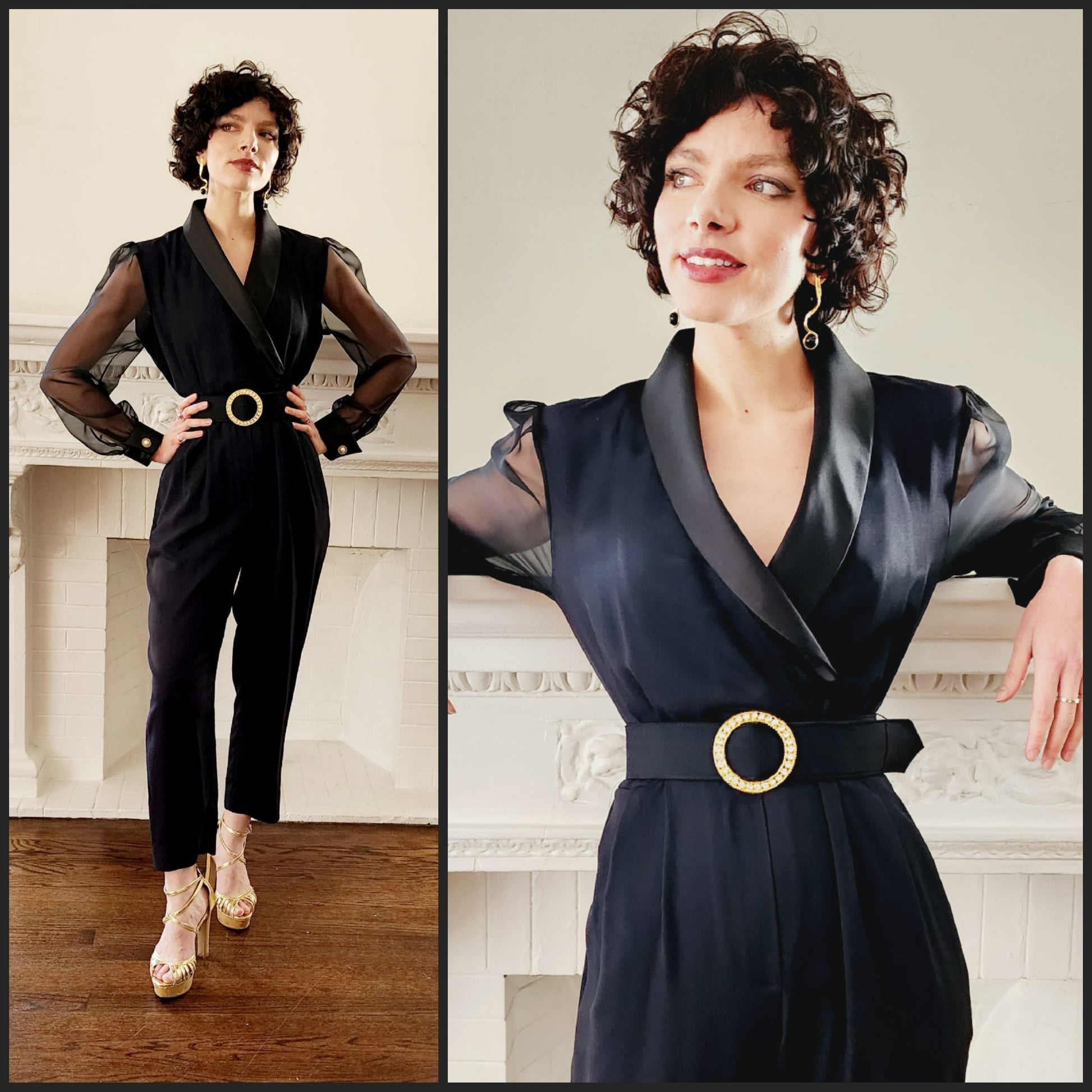 80s Black Jumpsuit with Long Sleeve Sheer Sleeves Gold Rhinestone Buckle Belt Small