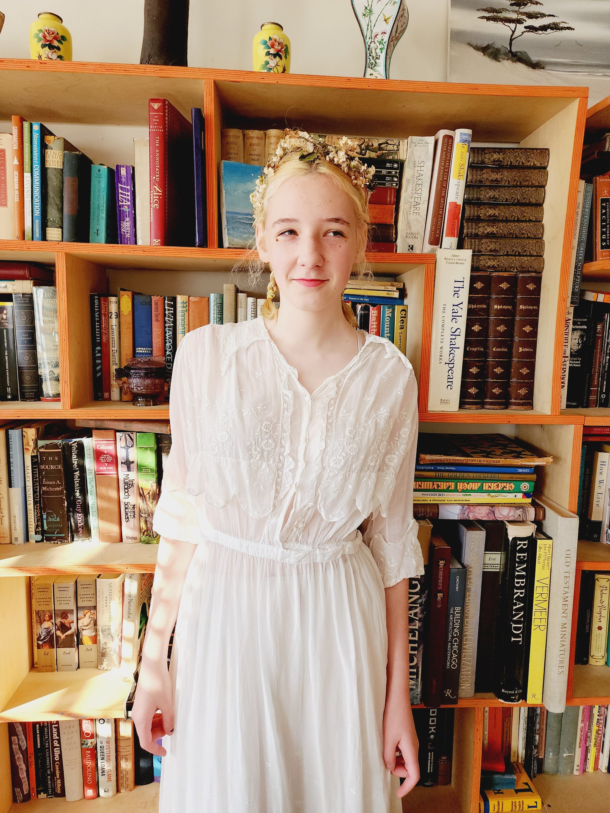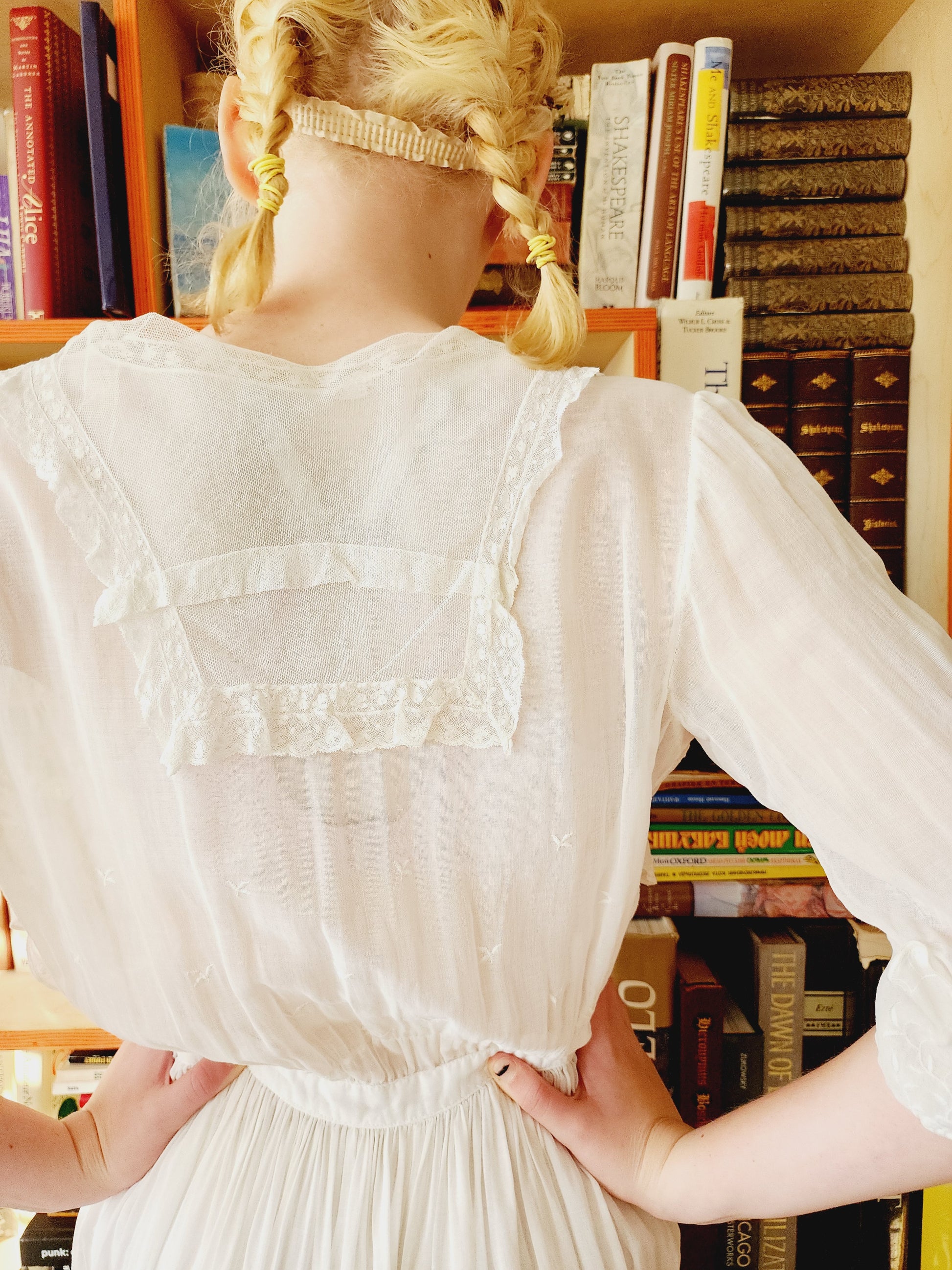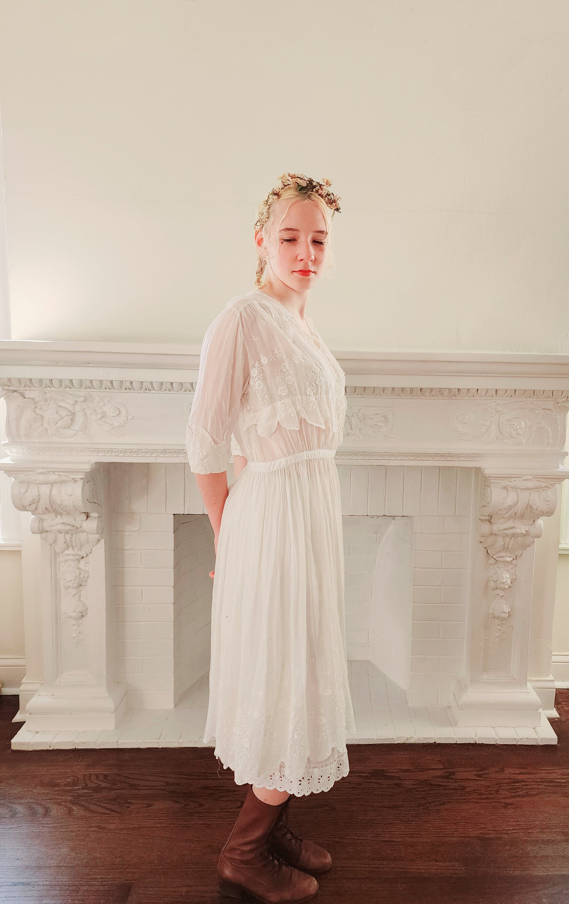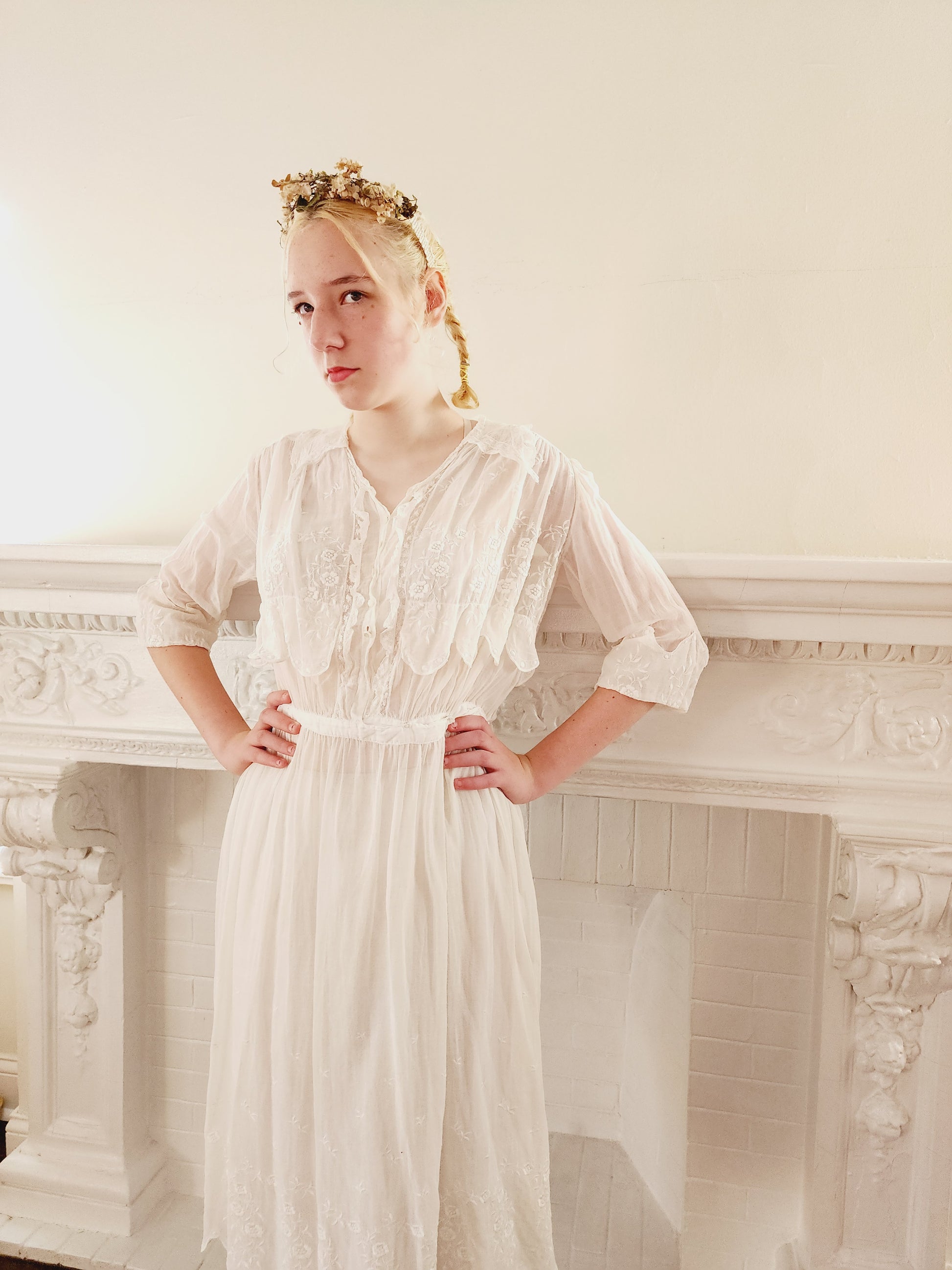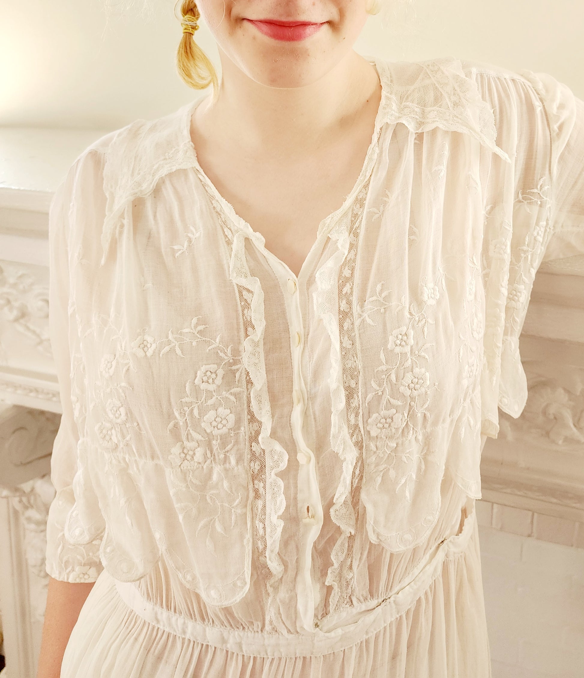 The three-quarters length sleeves have upturned, scallop edged cuffs, embroidered in a white floral pattern. More such embroidery appears across the front chest, which hangs as a faux over layer on the torso, also scallop edged. The center front closes with a row of hexagonal, pearly buttons leading into the waist that closes with a hook and snaps off to the left front side. Front opening is edged in gauzy, white lace mesh, which also makes up the sailor collar, that hands across the upper the back and comes down modestly in little pointy ends across the collarbones. The mid-length skirt is gently pleated at the top while the bottom half has a scattered array of floral embroidery, and, again the lovely scallop edging! Note that this frock is semi-transparent and would have been worn over undergarments (aka a "shift").