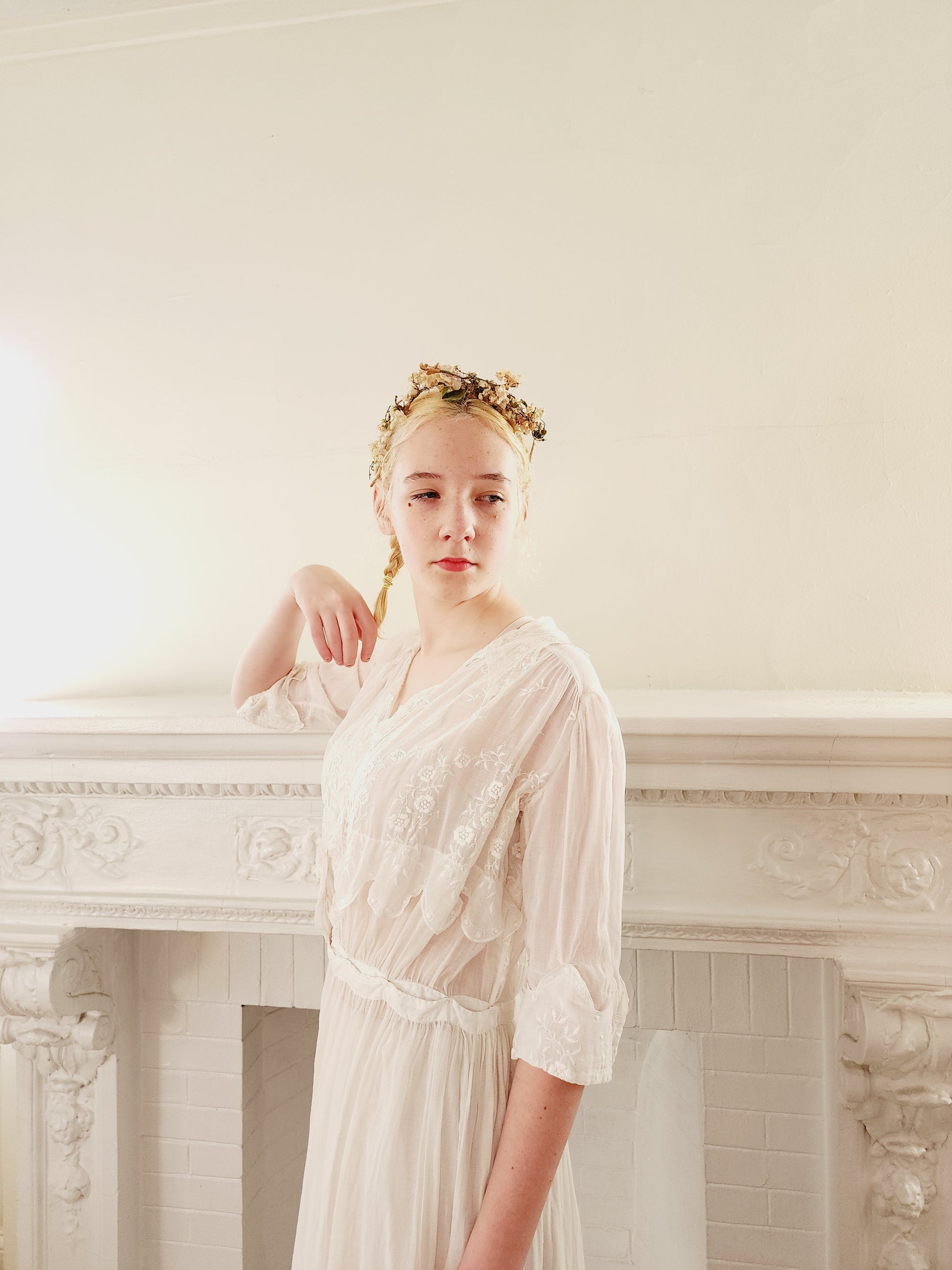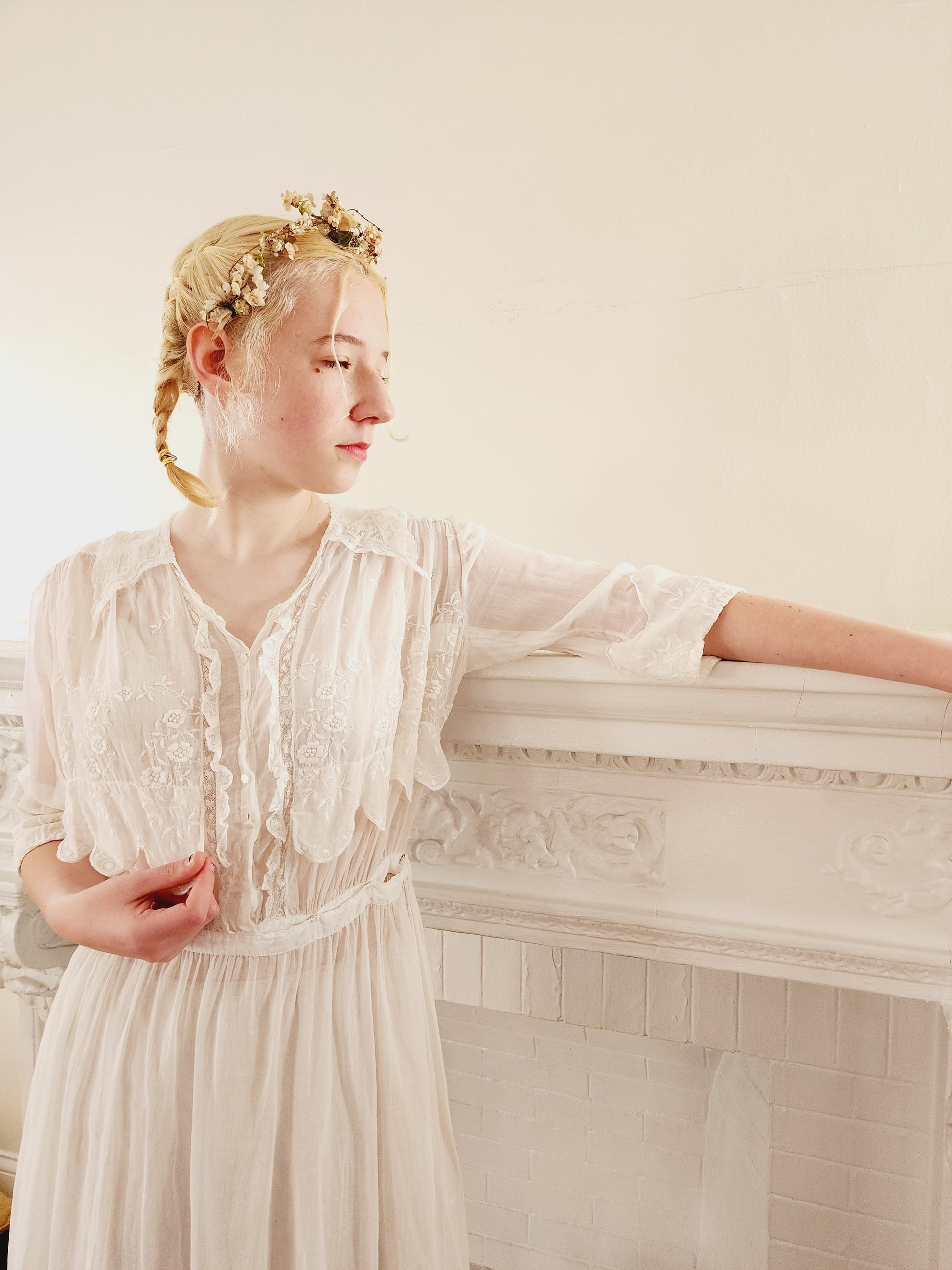 1910s White Cotton Lawn Dress Edwardian Tea Frock Floral Embroidery Lace Small
