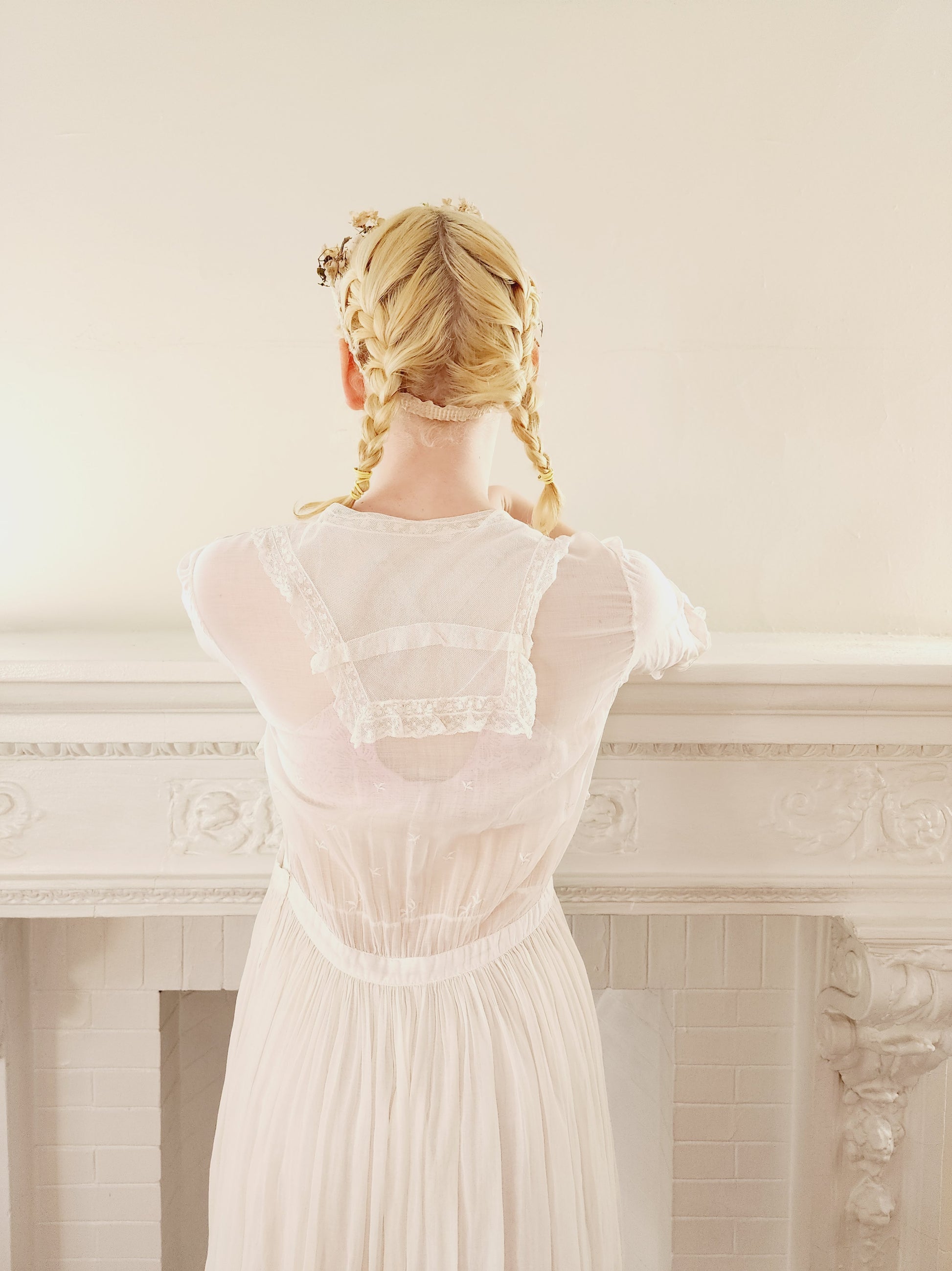 Delightful and romantic white cotton, embroidered lawn dress from the early years of the twentieth century. The delicate detailing here is astounding.
