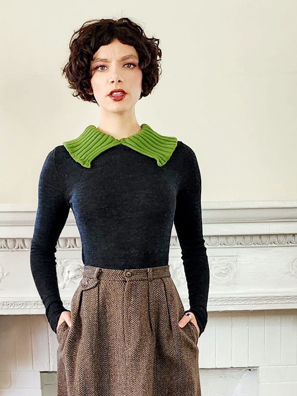 Classic, high waisted, A line, ankle length skirt in a thick wool tweed. Closes with a zipper at center front. There is a faux pocket at right front waist while the rear has actual pockets - one a slit and the other a buttoned flap, and there are slit pockets at each hip front. Fully lined at the interior.