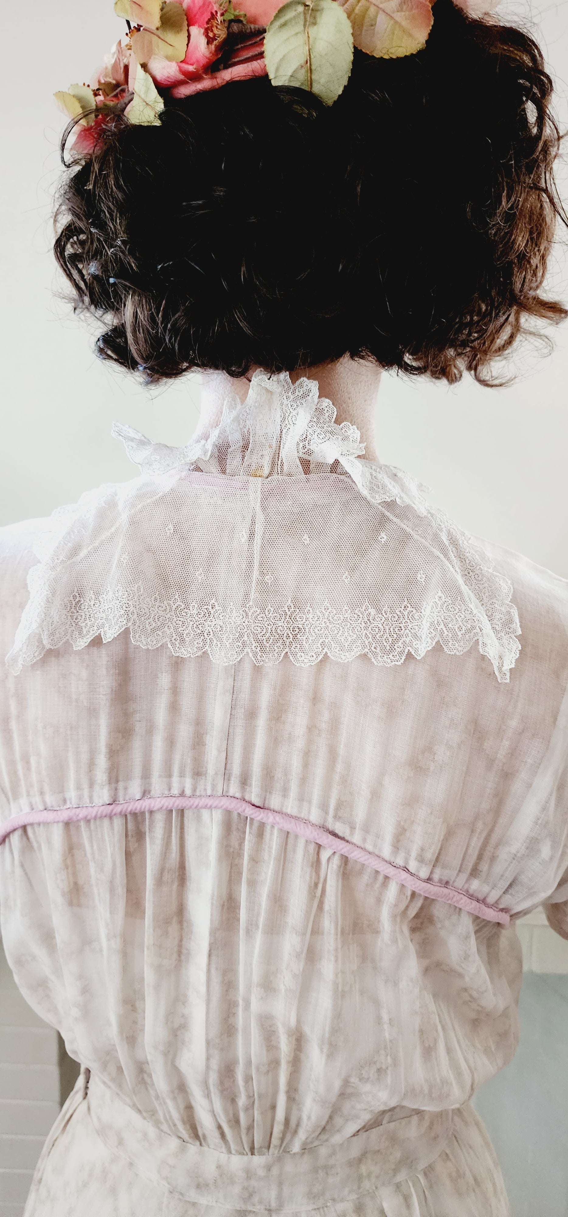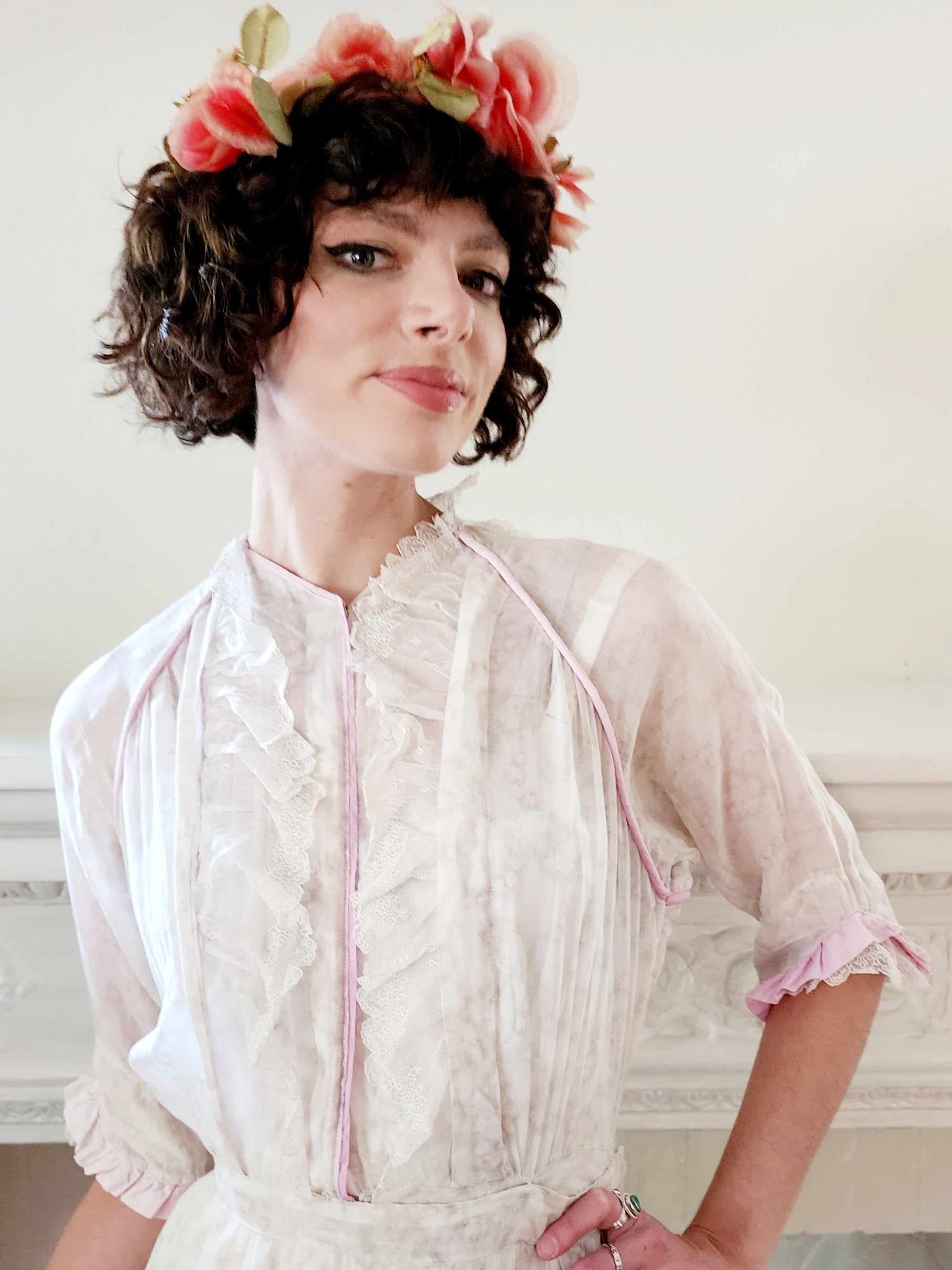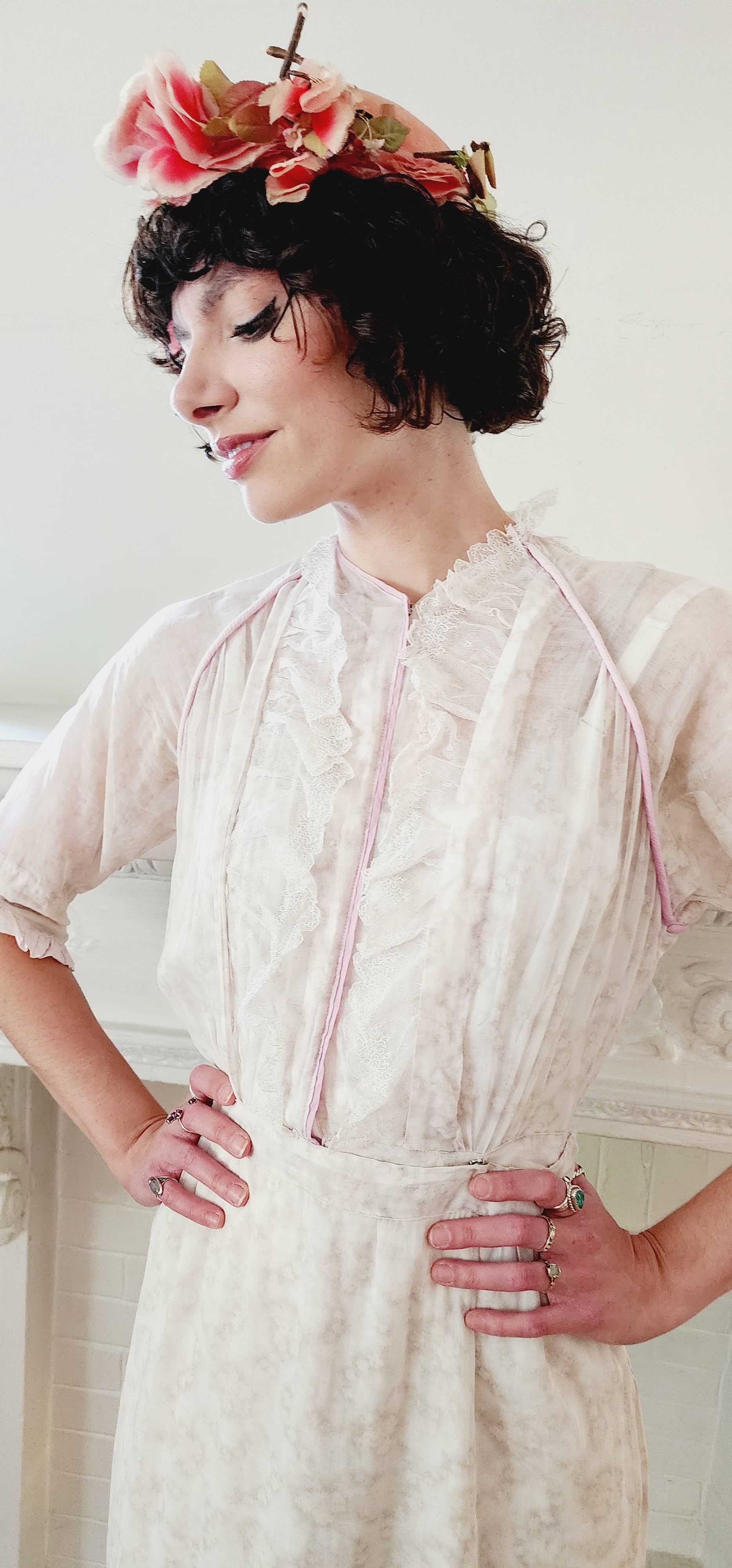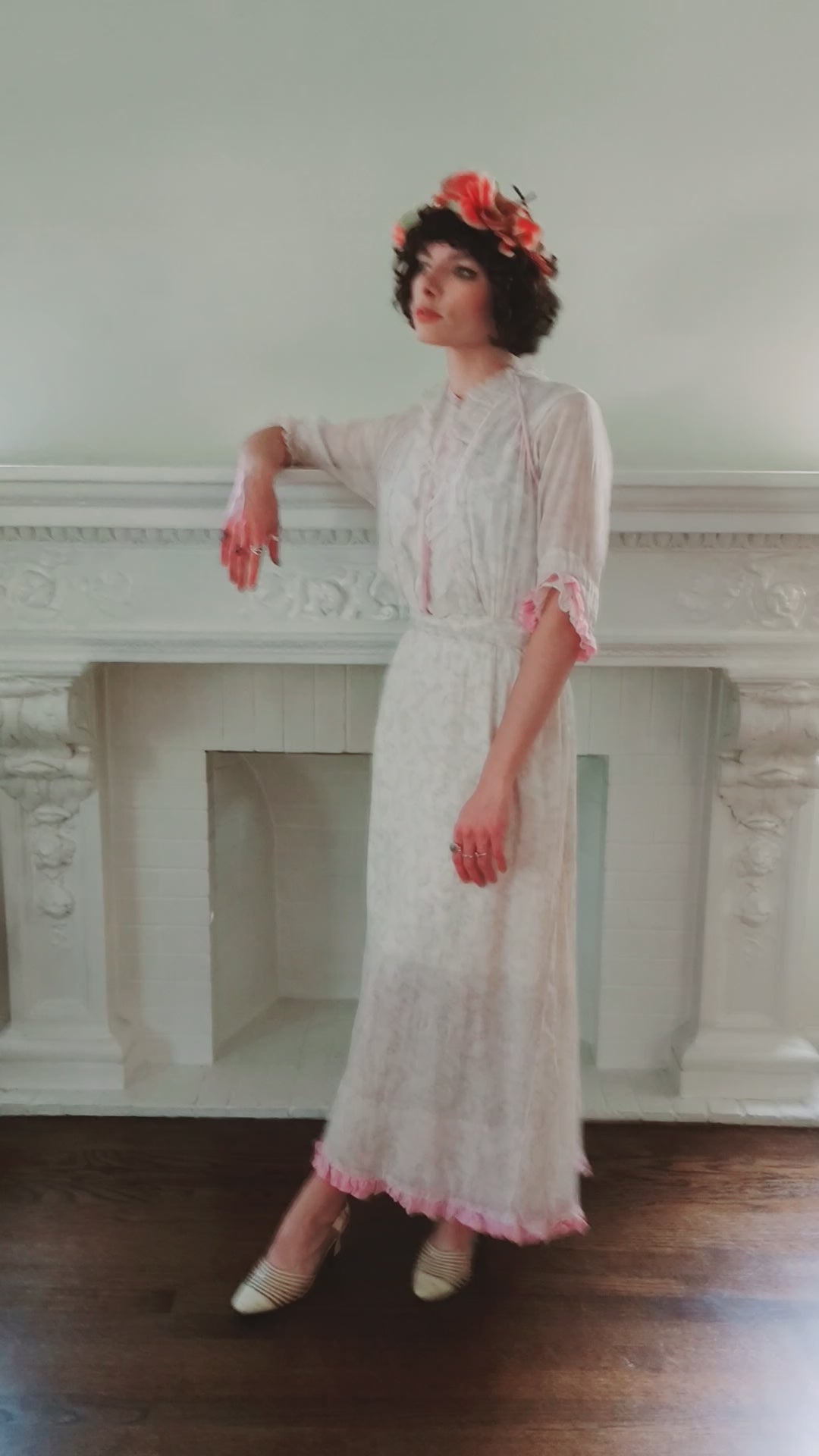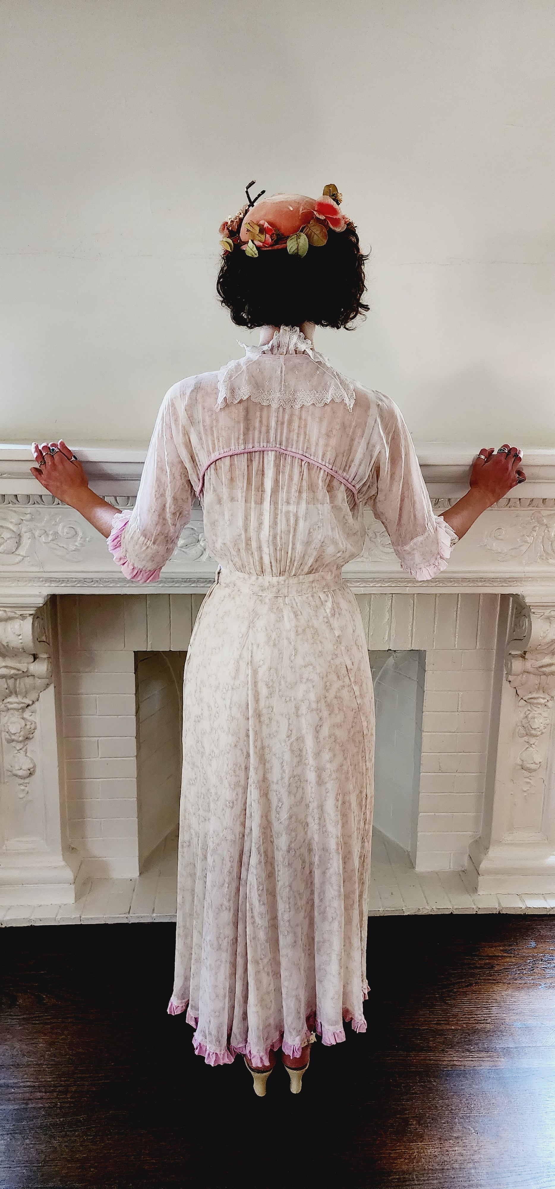 Delightful frock c.1910s in a soft cotton with a subtle floral print in beige. It has three-quarters length sleeves with ruffled cuffs in pink with a delicate white lace layer underneath. The same matching lace appears as a ruffled front on either side of the opening chest (which closes with interior snaps). The lace goes around the nape which sports a collar that has wire reinforcement so it can stand up stiffly somewhat. The waist is nipped and the ankle length skirt hangs loosely down the legs, ending in a pink ruffle. Skirt has a double layer of the print material so not sheer, but the torso and sleeves are (our model wears a slip underneath). Note the pink piping, or trim at the shoulder fronts, around the neck, and down the center of the opening.