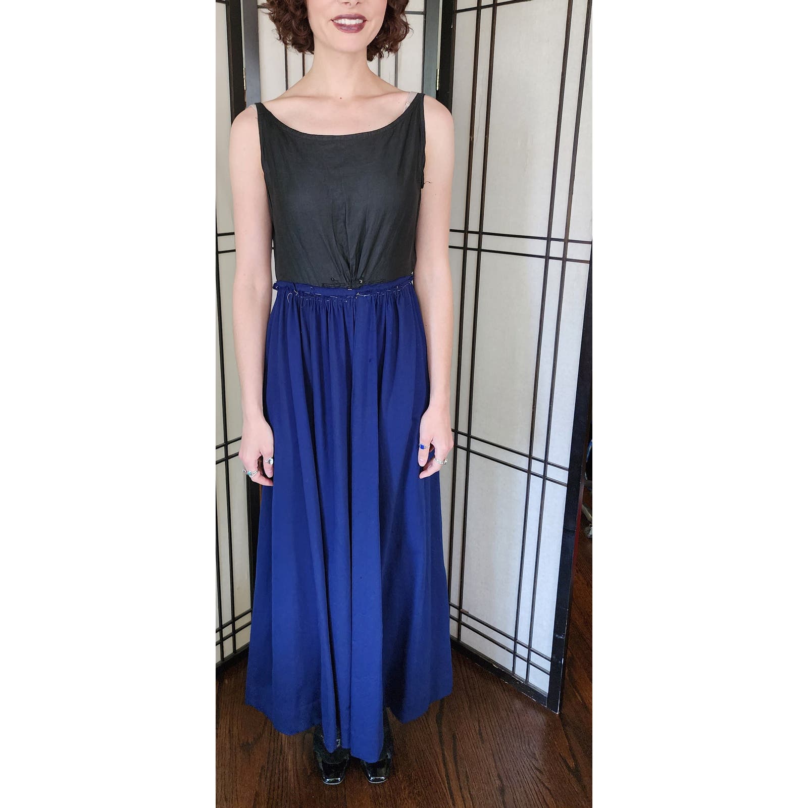 condition: clearly an amateur at some point attached a black sleeveless top to the skirt and did a clumsy job of it as seen in the pic. There is a small tear at right underarm and the basting on the interior of the hook closure is very worn. The skirt itself has numerous very small moth holes towards the bottom, but you have to lay the fabric flat and hunt for them in direct light to see them. The fabric is so thick and voluminous that they truly get lost.