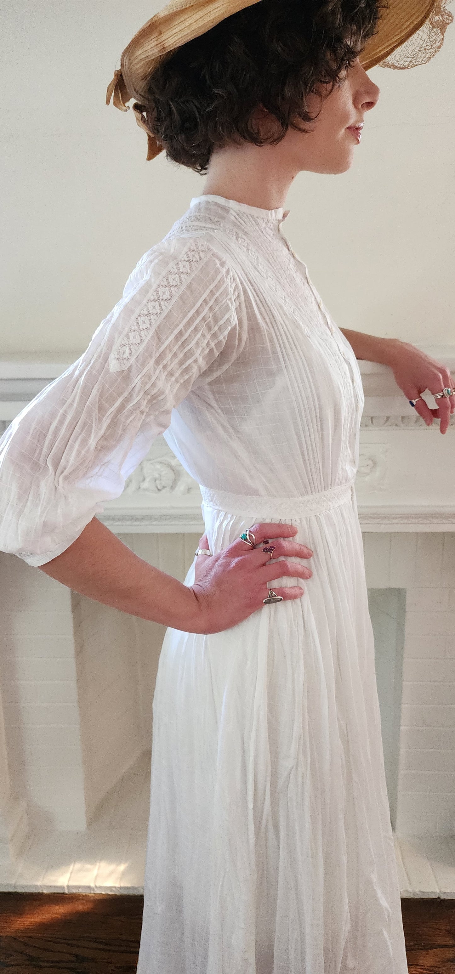 Edwardian White Cotton Day Dress Embroidered Lace Trim