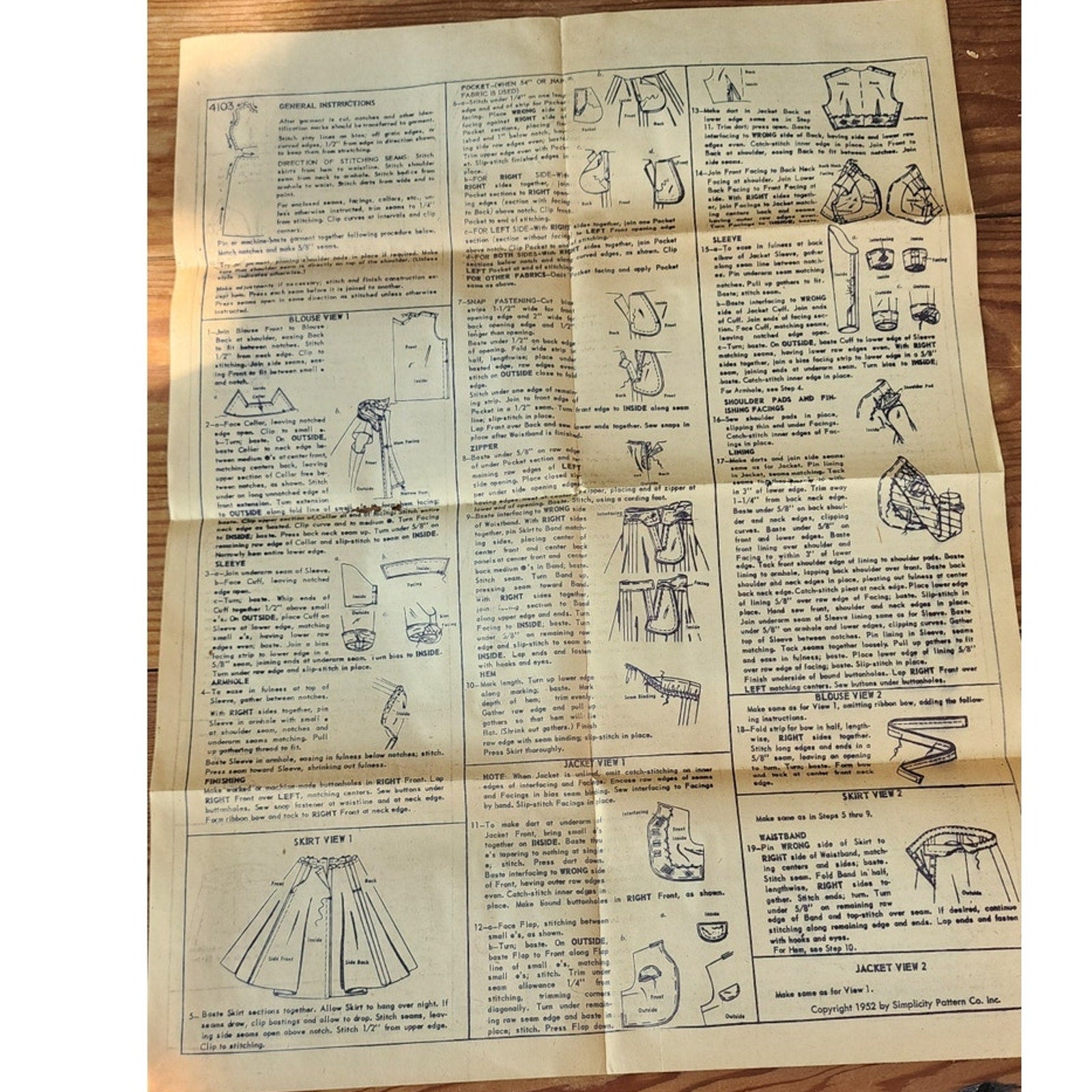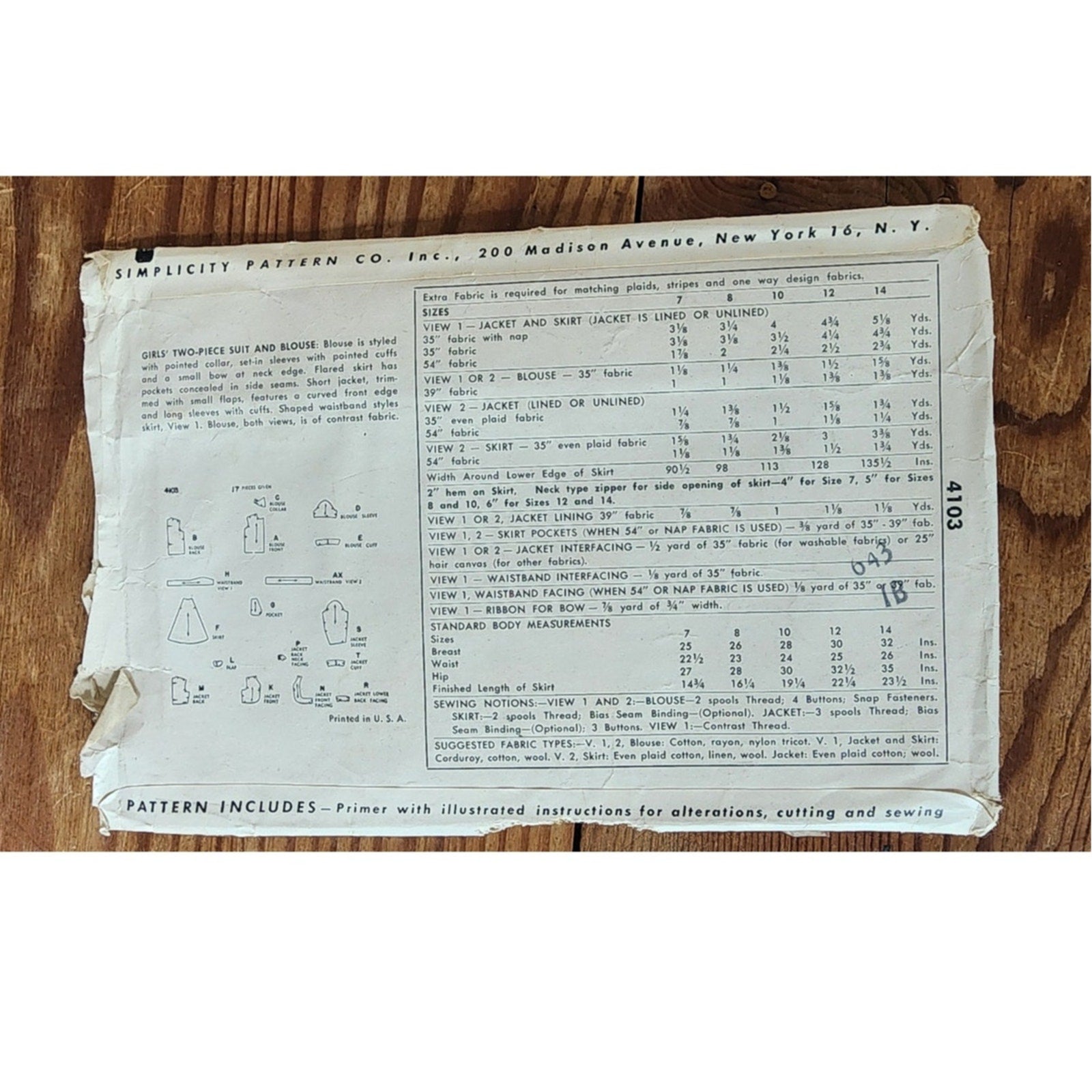 ORIGINAL Vintage 50s Sewing Pattern: Girls Two Piece Suit + Blouse Bolero Simplicity 4103