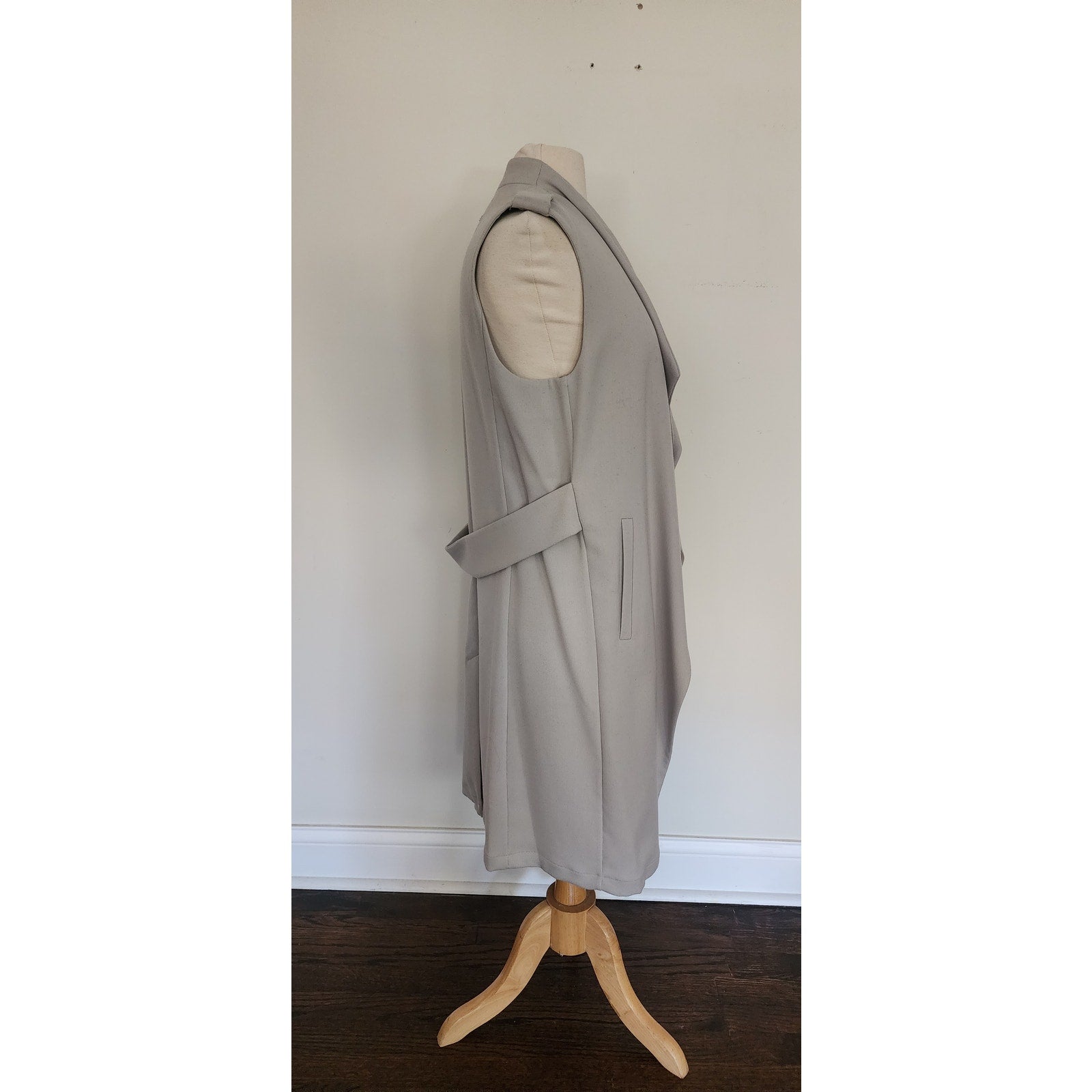 Sleeveless with an undulating, open faced collar and slit pockets at the hips. Decorative sash belt across the rear waist and epaulettes at the shoulders complete the look.