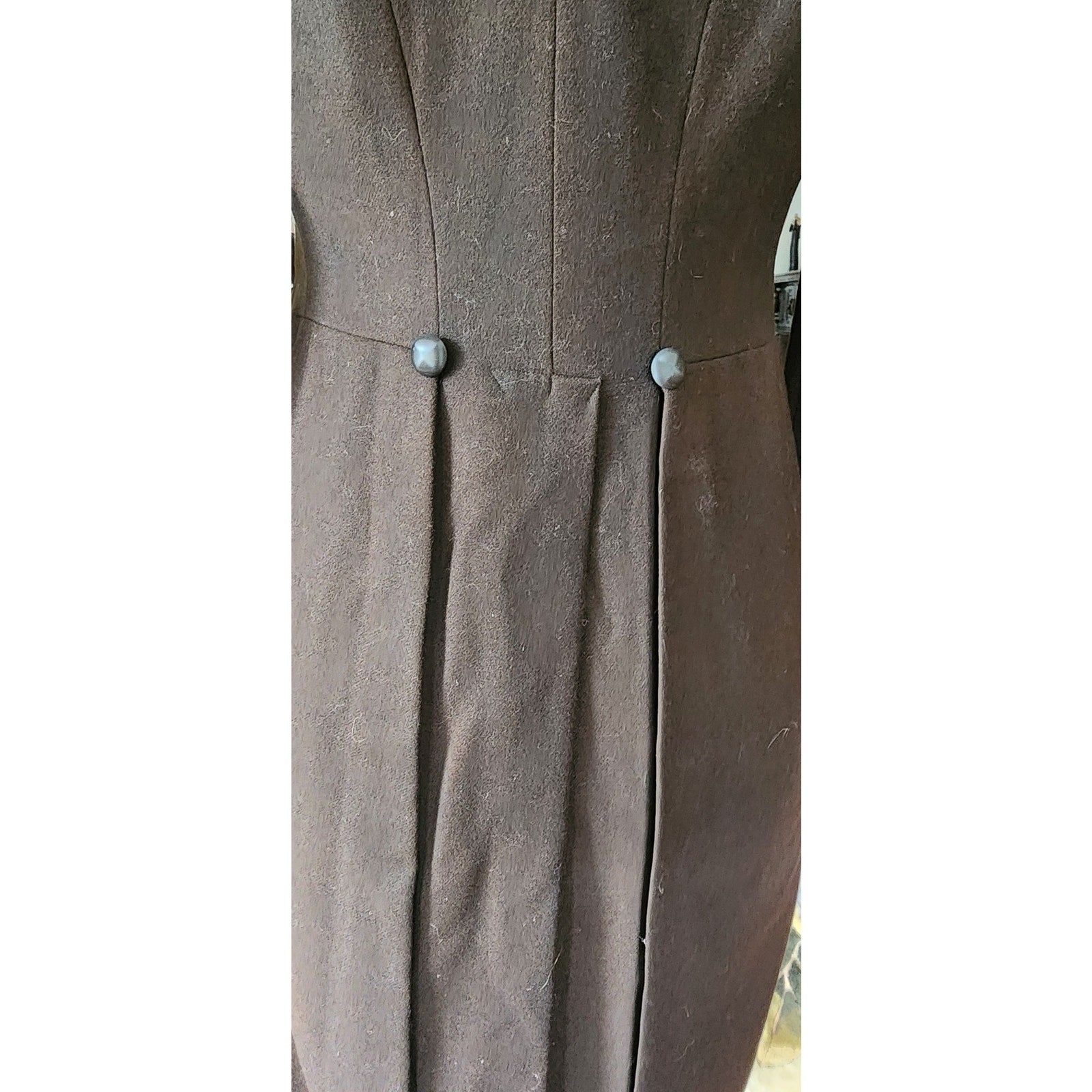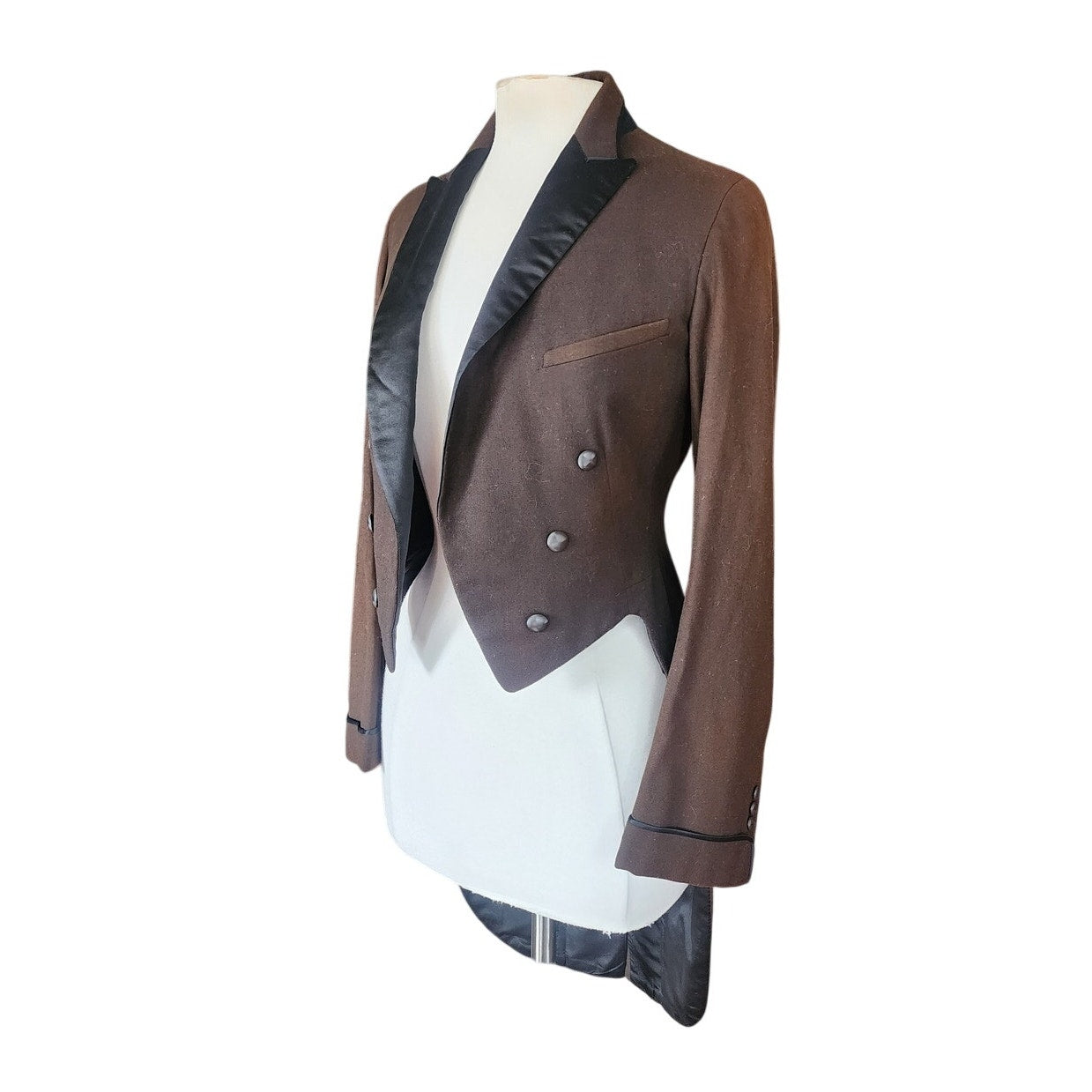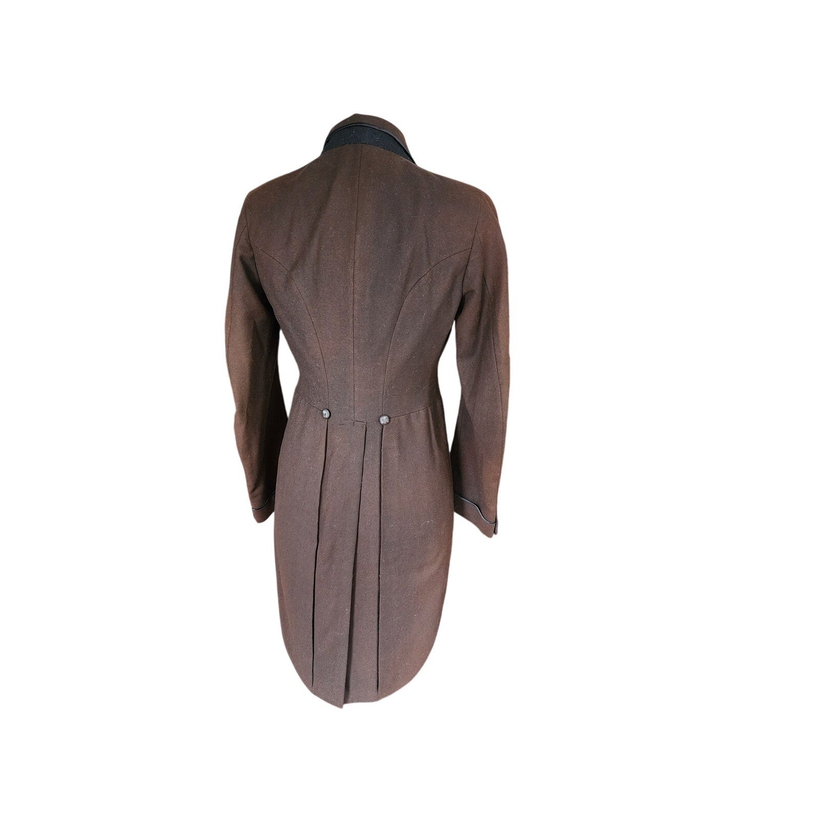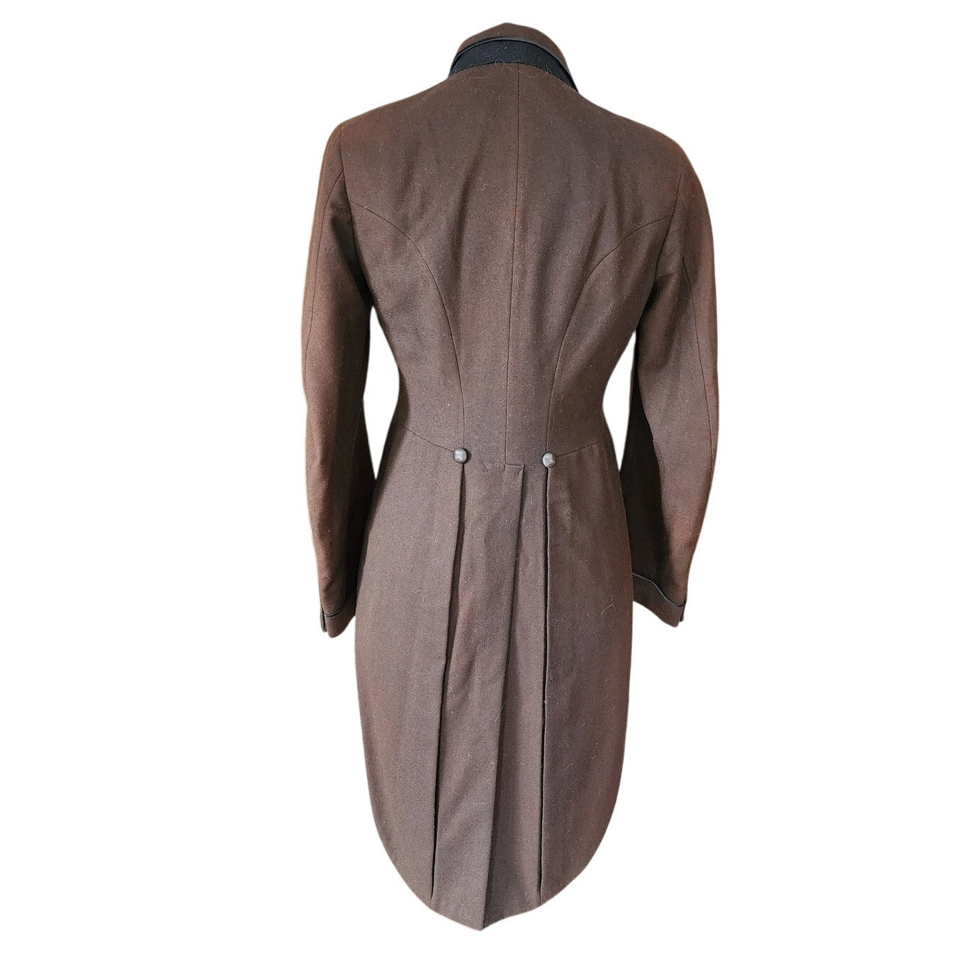 Rare, men's piece of formal wear in a brown wool with black satin trim and collar lapel. Decorative buttons on the diagonal at the sides, as is tradition. Tailcoats at rear. Fully lined. Classic, high quality tailoring.
