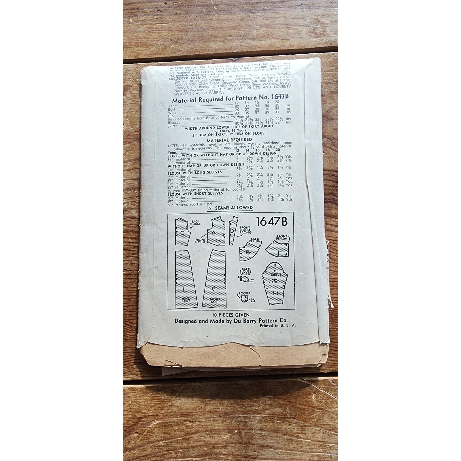 Vintage 30s Sewing Pattern: Belted Frock w/ Peplum Du Barry 1647B / Bust 34