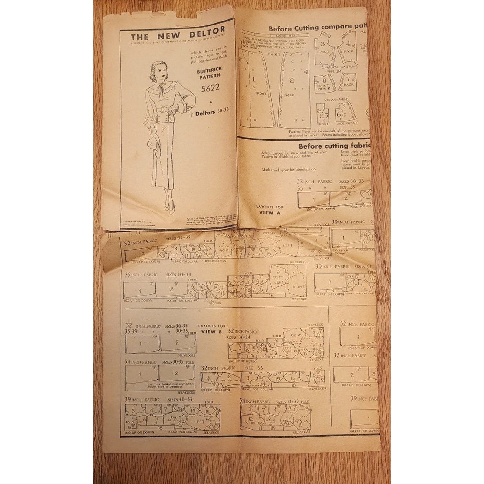 Vintage 1930s Sewing Pattern ORIGINAL: Dress w/Collar & Belt Butterick 5622