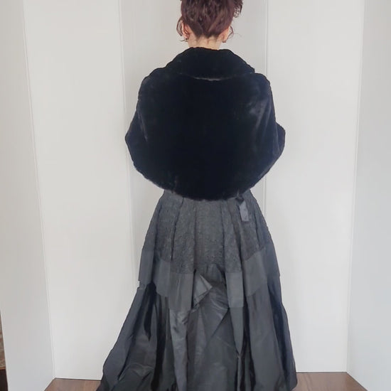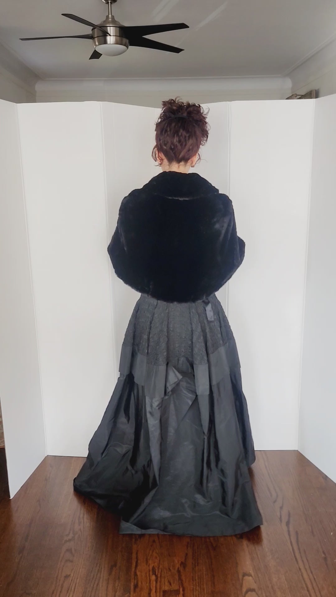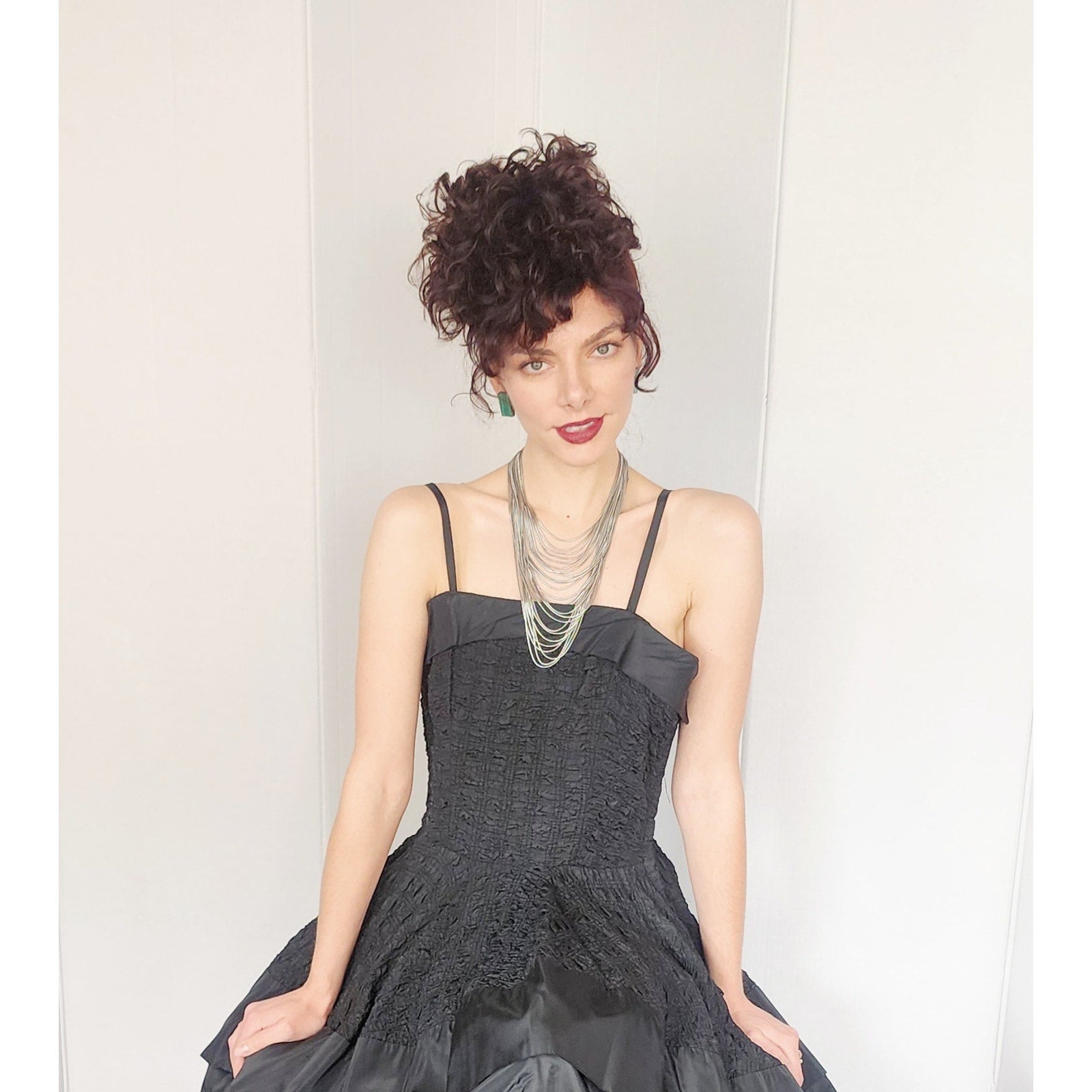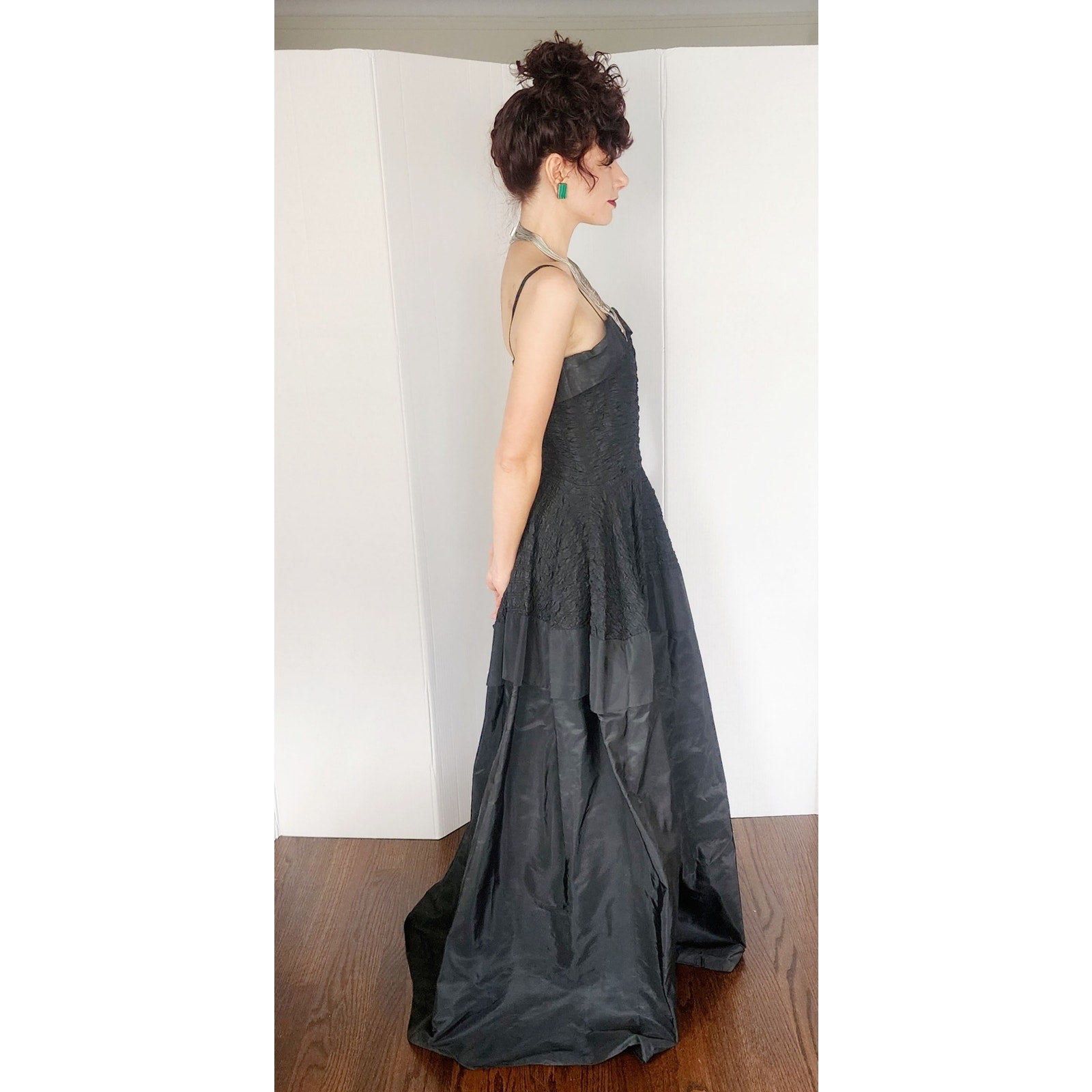 Divine gown with spaghetti straps, this floor length piece has a straight neckline, a fitted chest that is structured with boning on the interior, a nipped waist and a voluminous skirt. The chest and top of skirt are in crinkled and gathered black rayon while the rest is in shiny, black satin. Note the tiered panel at the top of the skirt and the interesting variation on a rear bow in the form of a pleated, leaf like detail at lower back, center. Closes with a zipper at the side. Unlined.