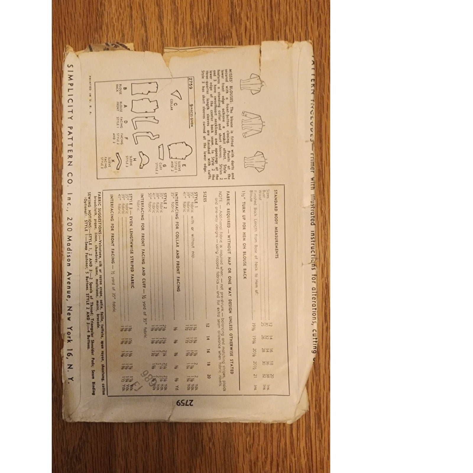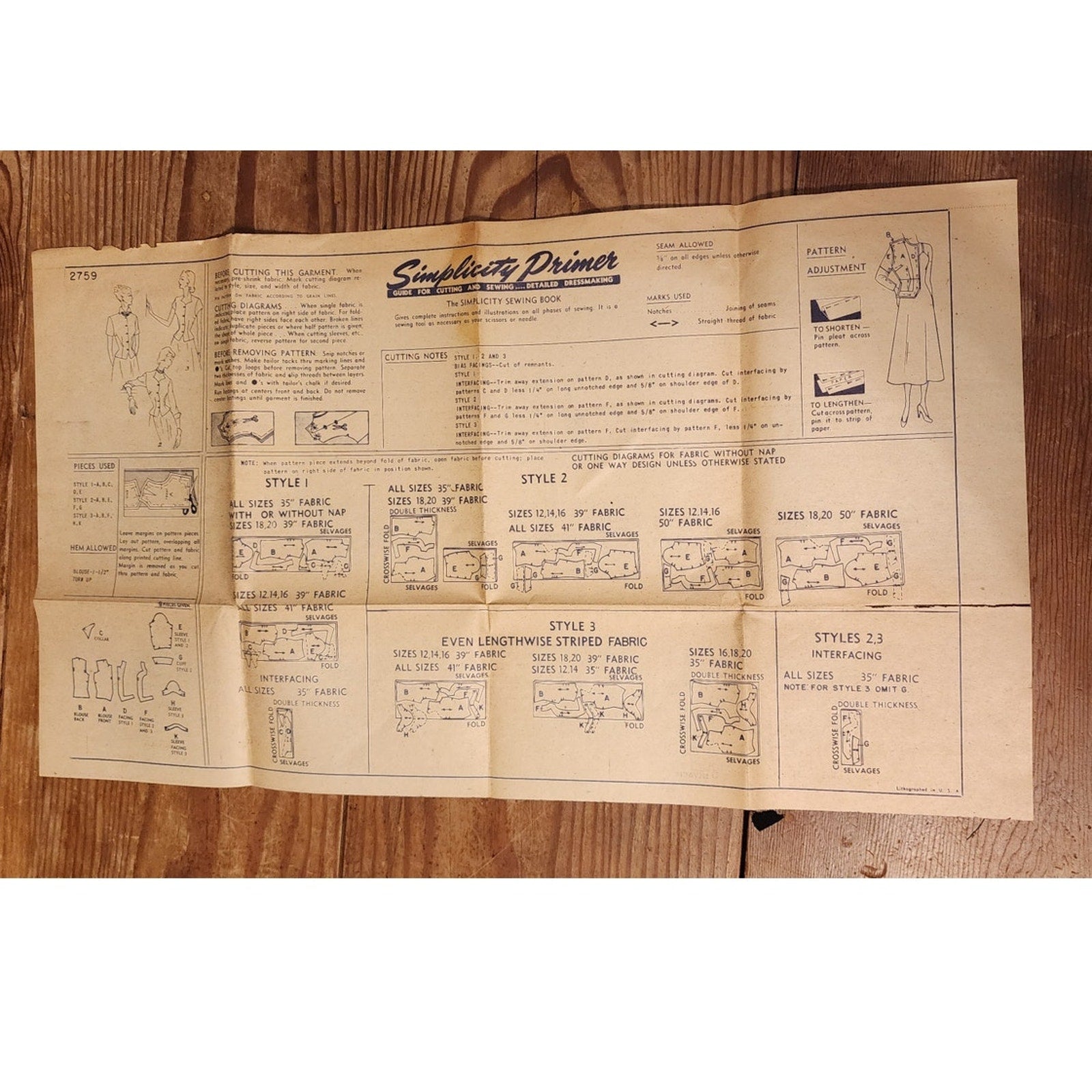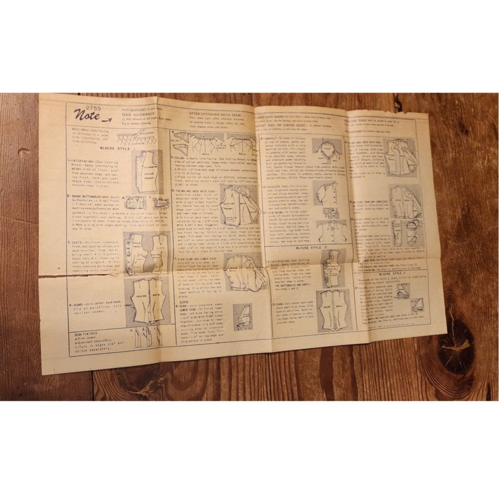 Vintage 40s Sewing Pattern: Ladies Blouses Simplicity 2759