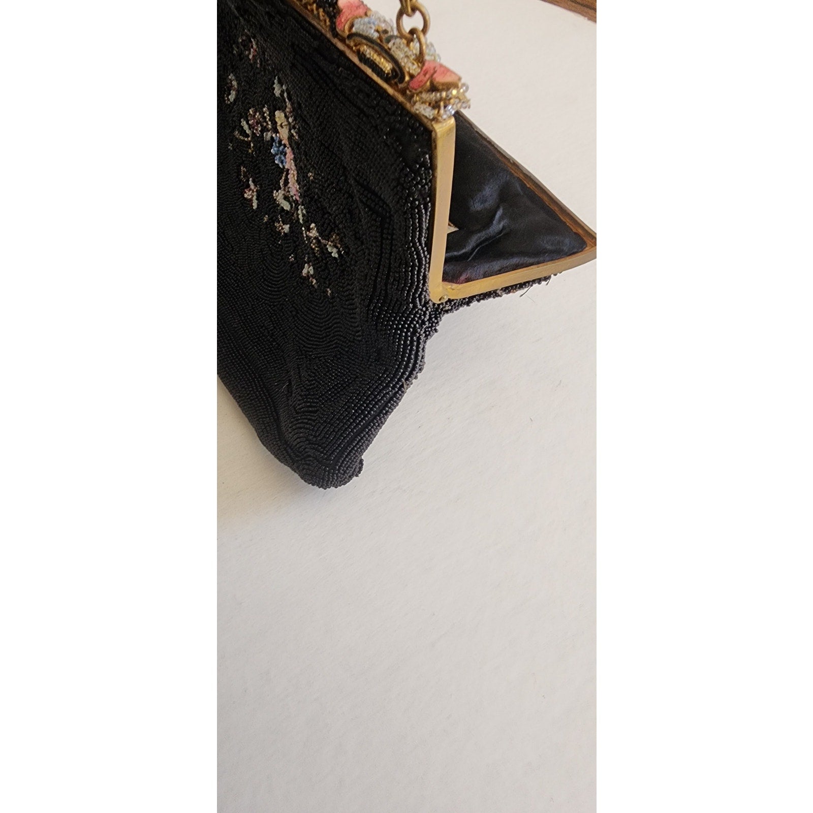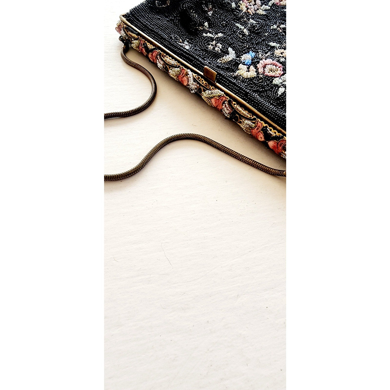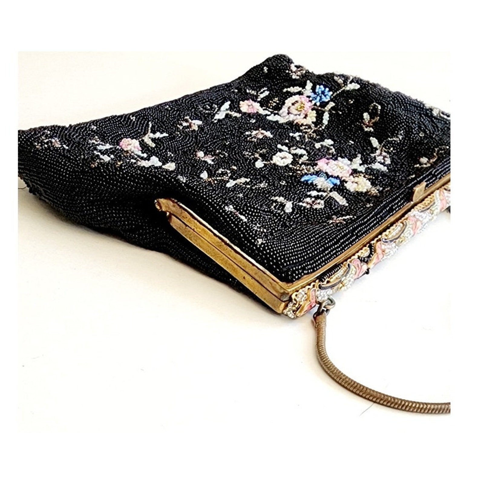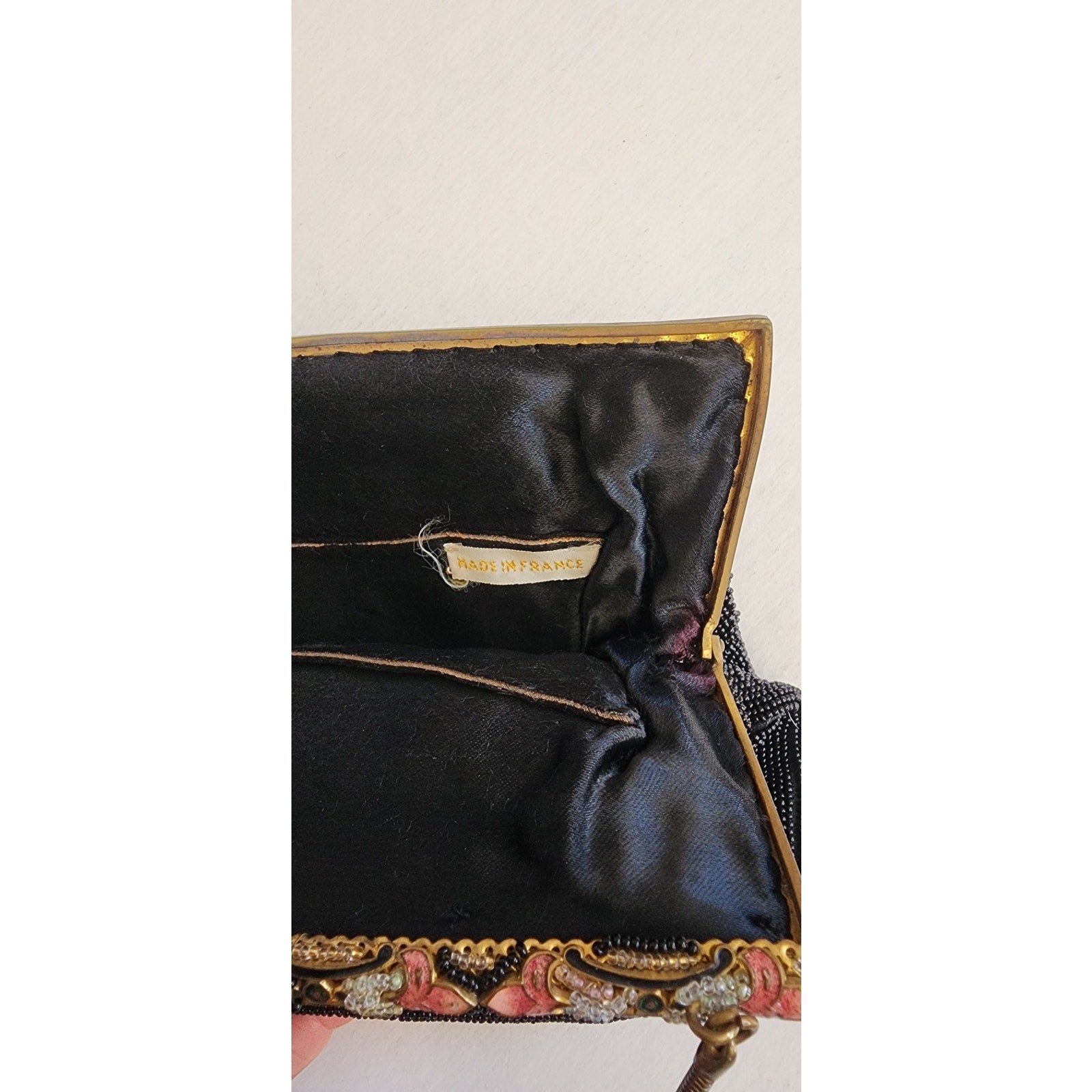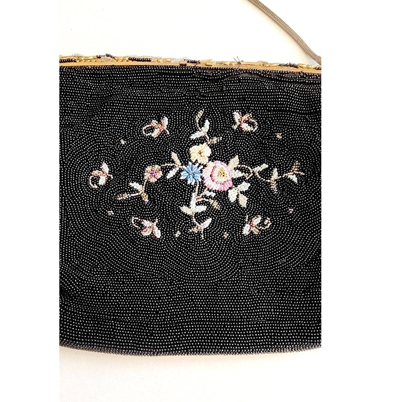 Vintage 1950s Beaded Hand Bag Black Floral Pattern Made in France